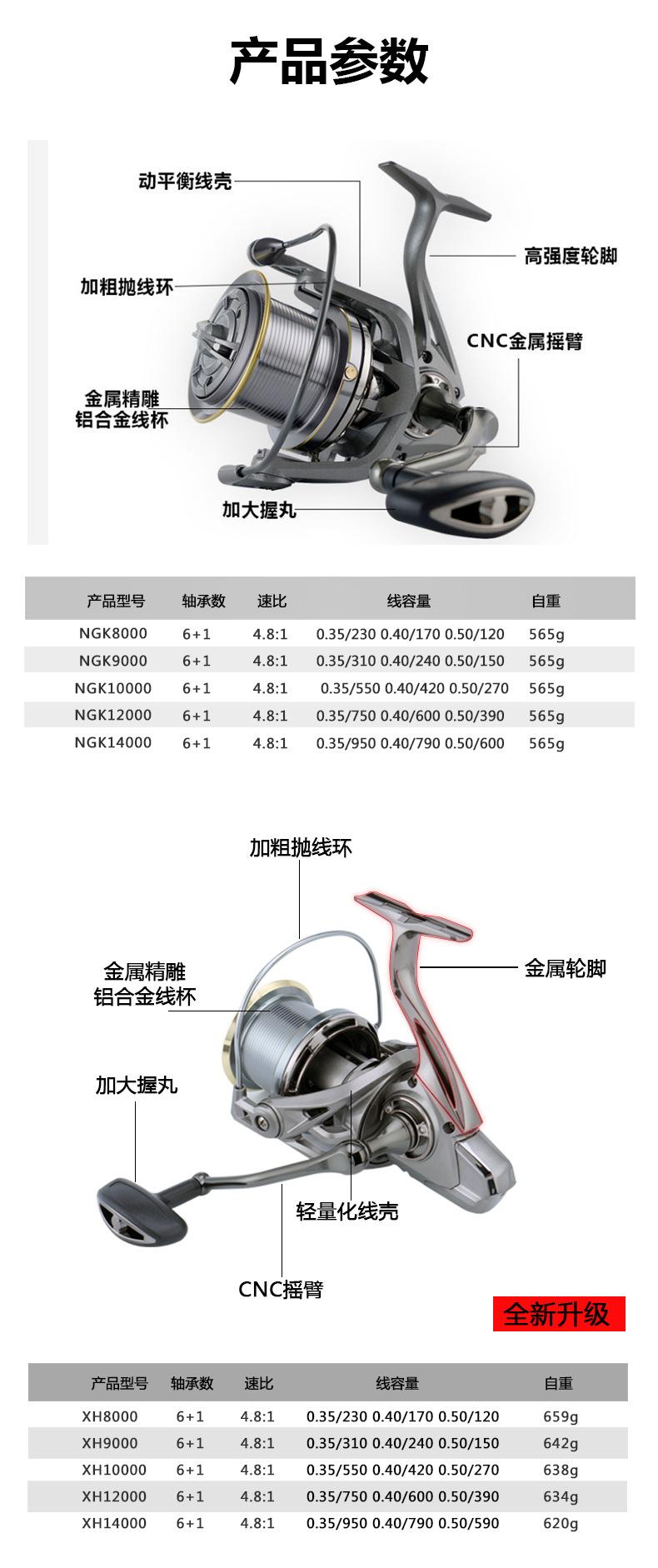 6+1 rolamentos totalmente em aço inoxidável, lançamento suave e longa distância, uma ferramenta poderosa para fisgar peixes grandes! Projetado especificamente para peixes grandes abaixo de 100 kg, uma ferramenta de pesca para serviço pesado, comprimento do pé do molinete 72MM largura 17MM espessura 5-7MM, deve ser usado com varas maiores que 3,8 metros, carretel de parede espessa NGK de segunda geração, pé do molinete atualizado para metal, que é o que a indústria chama de totalmente metálico (a versão comum não é totalmente metálica). Totalmente metálico ≠ o molinete inteiro é de metal, o molinete inteiro sendo de metal seria muito pesado e não resistente à corrosão. Querido(a), 8000.9000 carretel raso, 10000 carretel médio-raso, 12OOO carretel médio, 14OOO carretel fundo