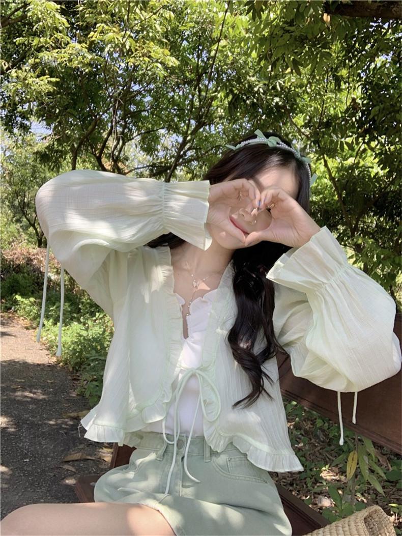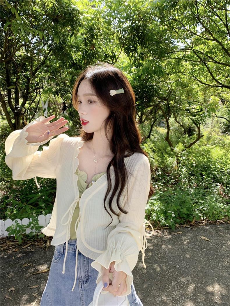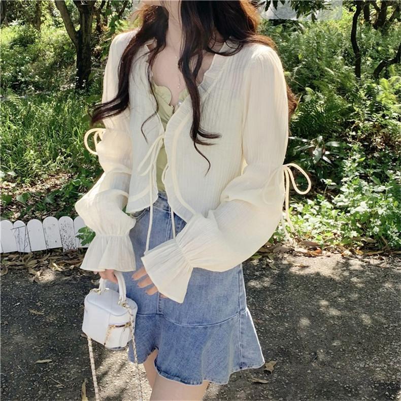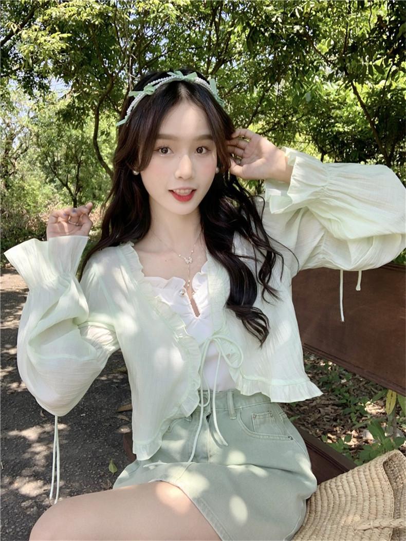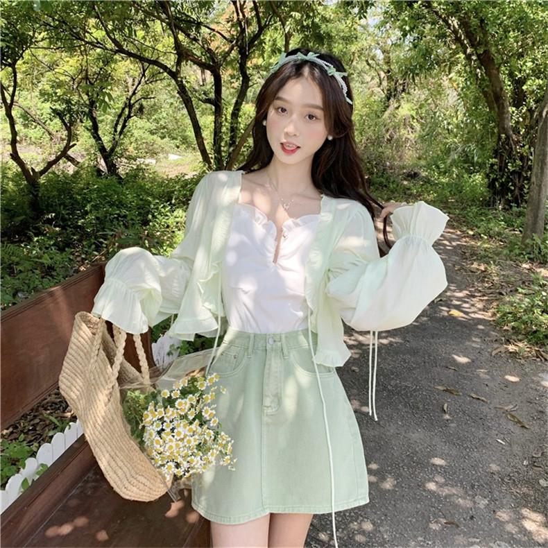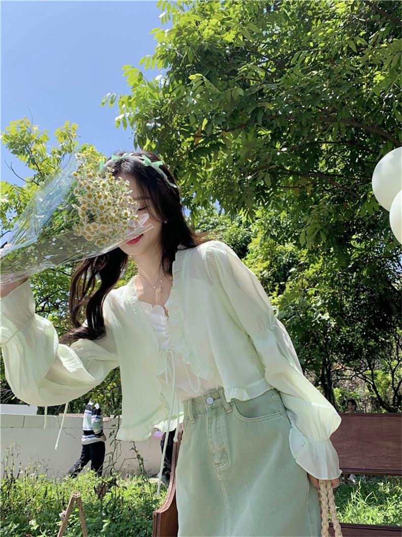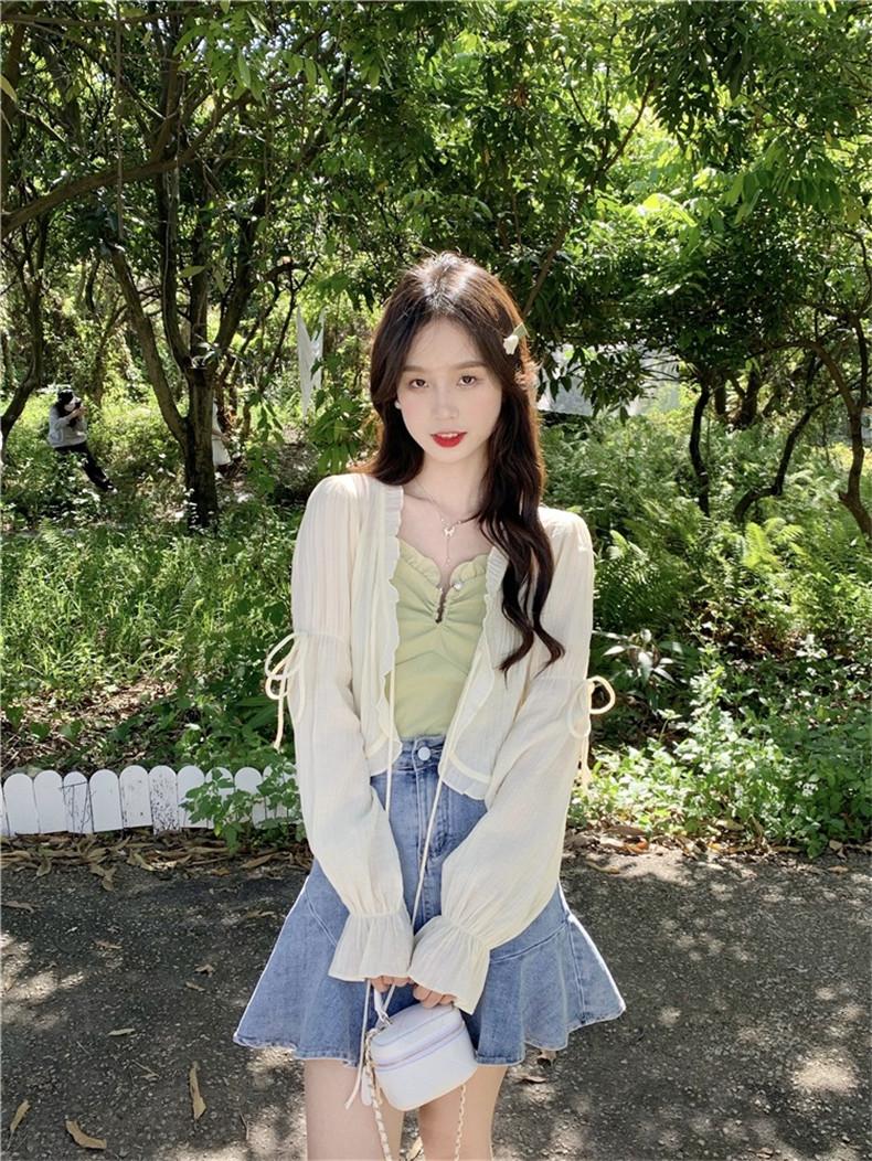 Xale com Saia Suspensório e Blusa Protetora Solar tipo Fada para Mulheres, Cardigã de Chiffon Super Fada de Verão, Jaqueta Fina para Cintura Pequena