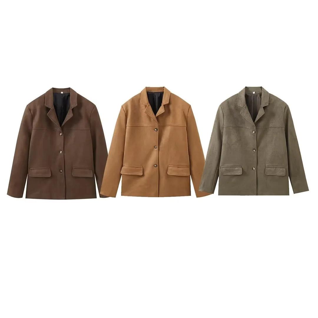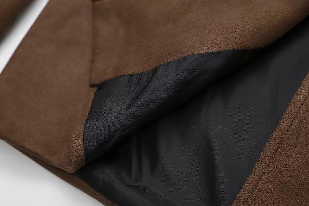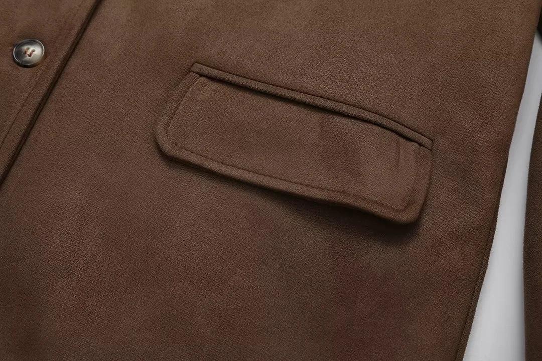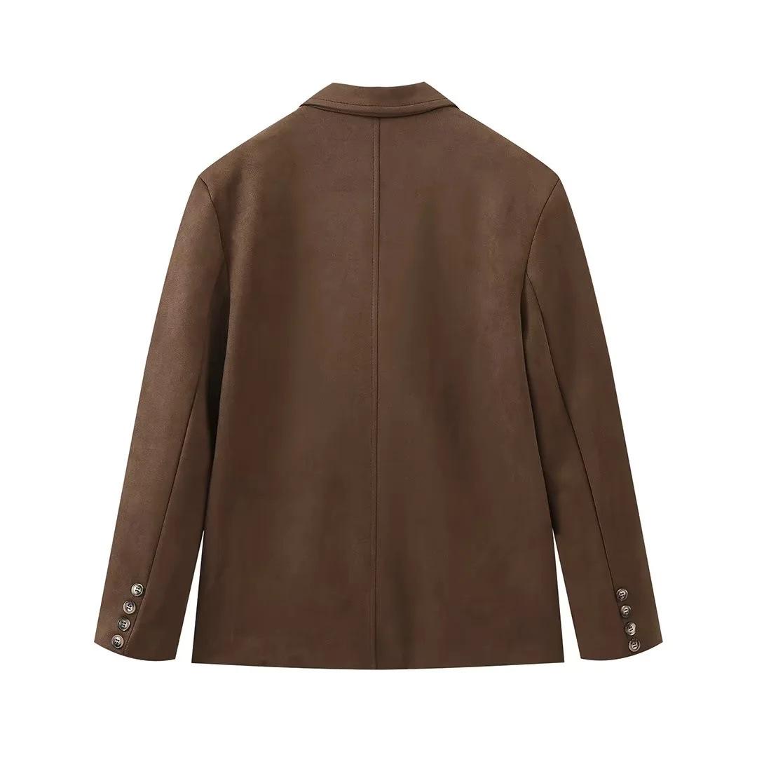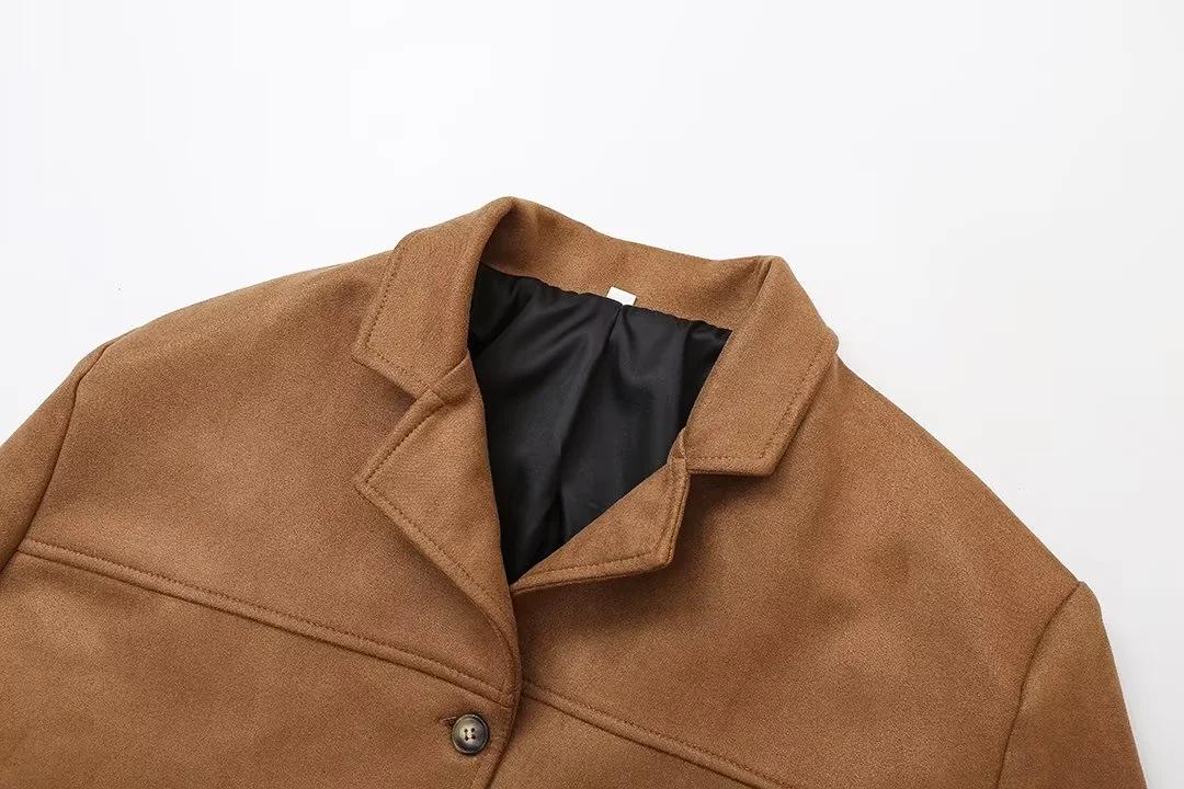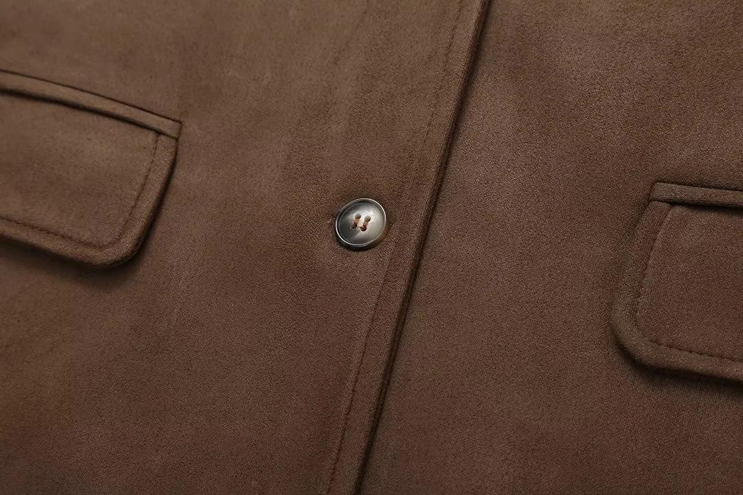 Roupa Feminina Estilo Europeu e Americano Comércio Exterior Transfronteiriço Popular Solto e Confortável Jaqueta Marrom de Camurça com Lapela Americana
