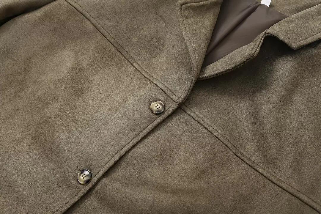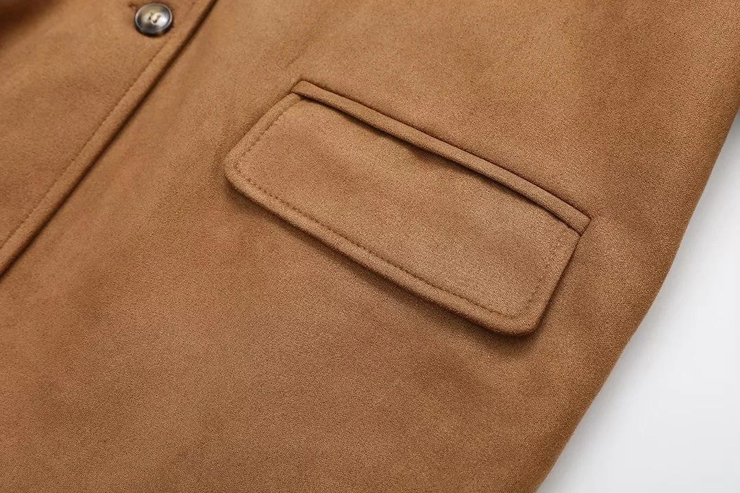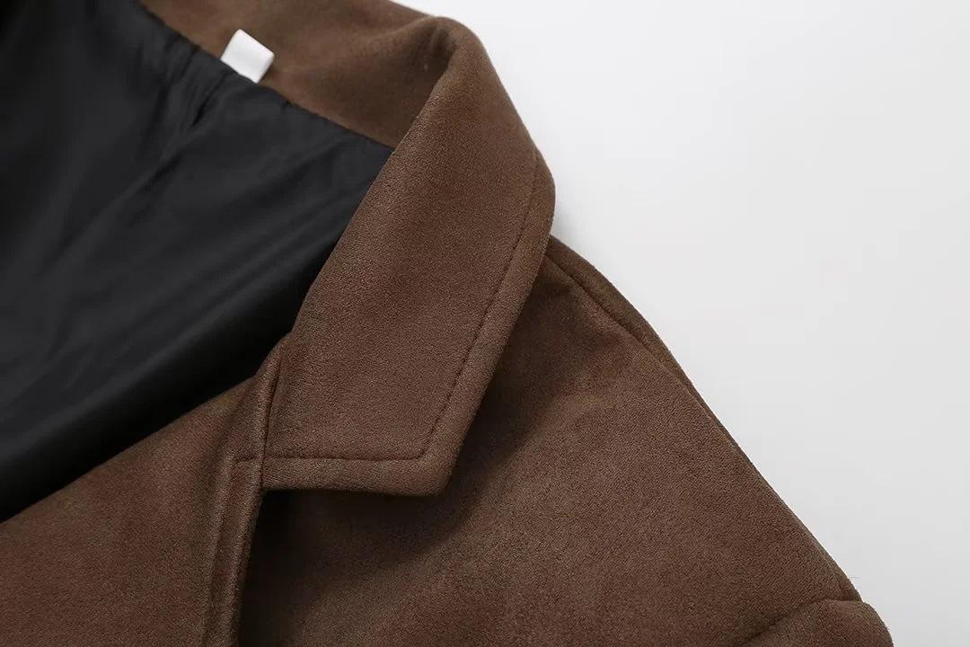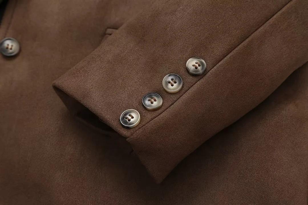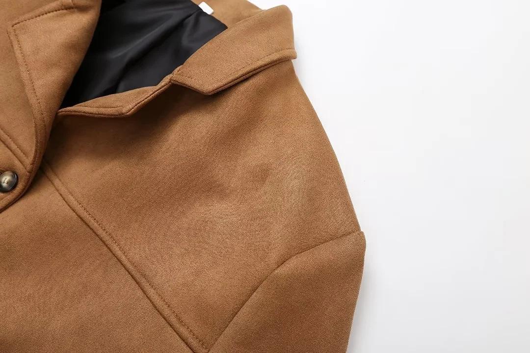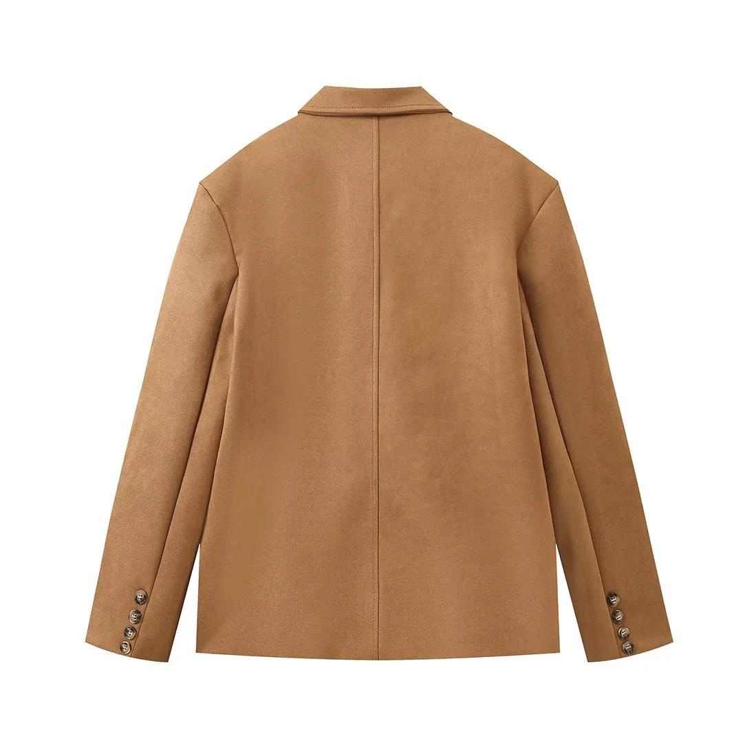 Roupa Feminina Estilo Europeu e Americano Comércio Exterior Transfronteiriço Popular Solto e Confortável Jaqueta Marrom de Camurça com Lapela Americana