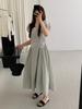 TG Estilo Francês Simples Gola Quadrada Vestido Emagrecedor Feminino 2025 Verão Novo Cintura Plissada Cor Sólida Vestido Longo 24869