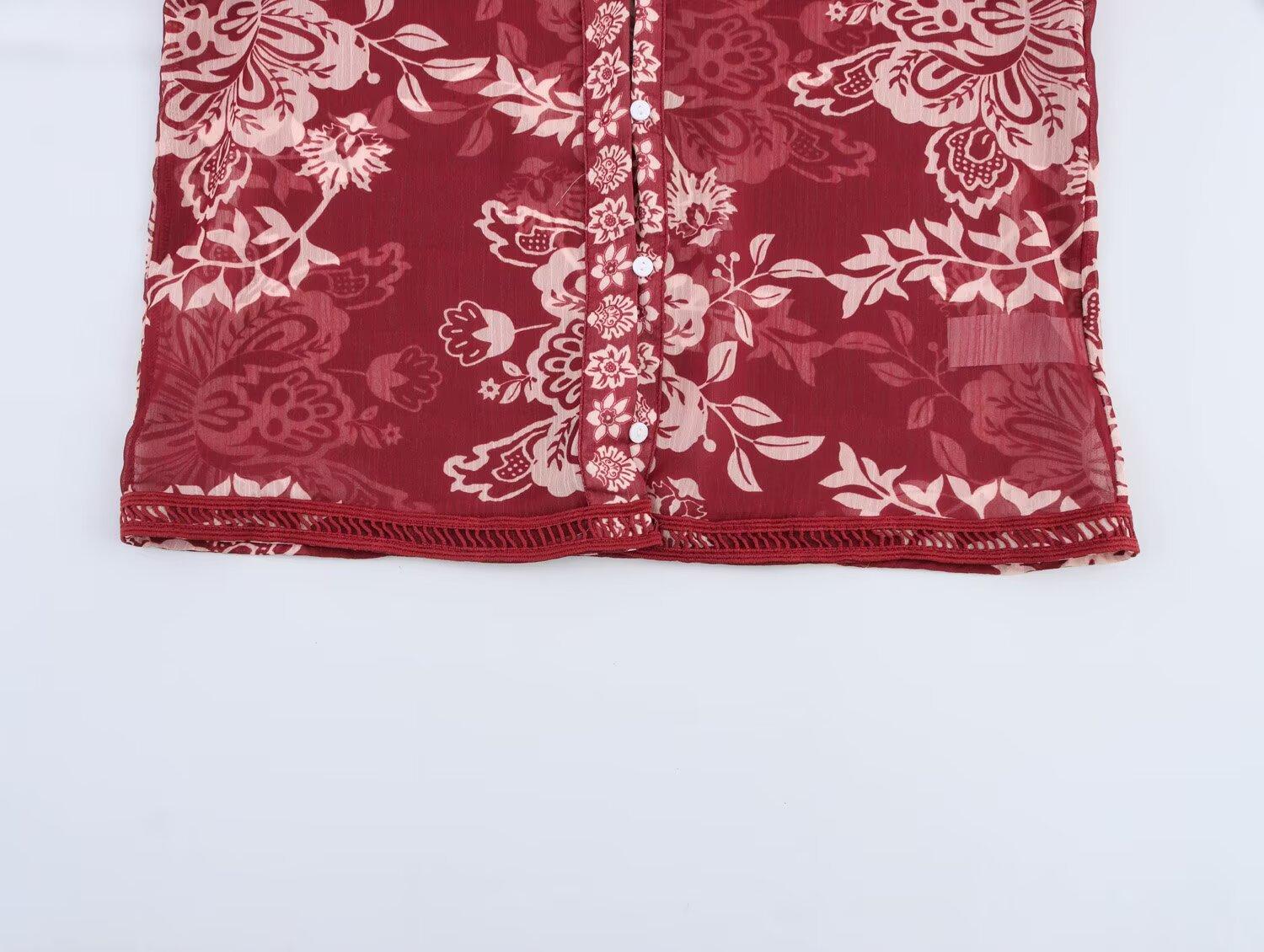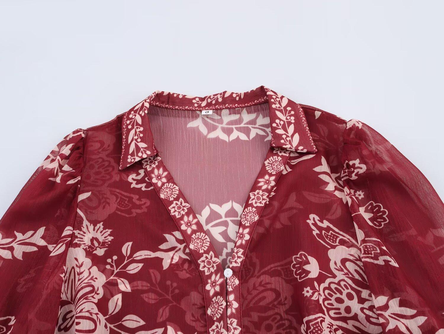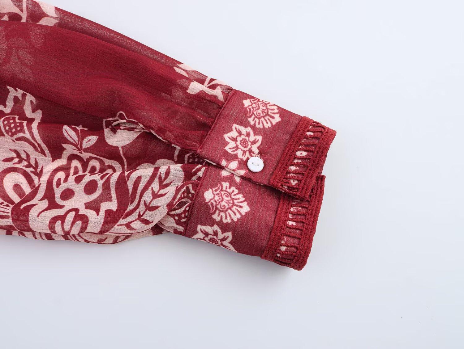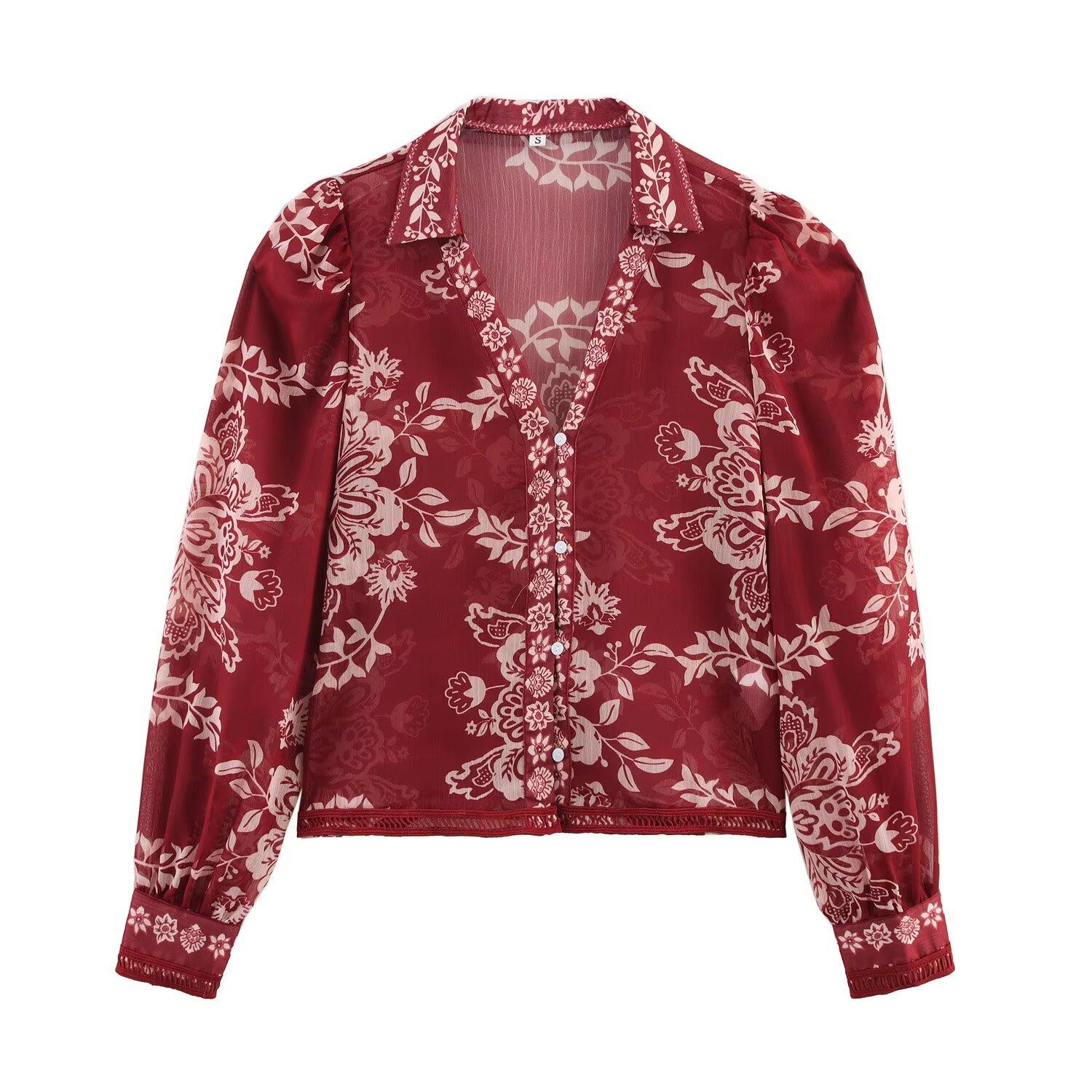 Primavera 2025 Nova Roupa Feminina Estilo Europeu e Americano Simples Casual Estilo Étnico Camisa Estampada Decote em V Manga Longa