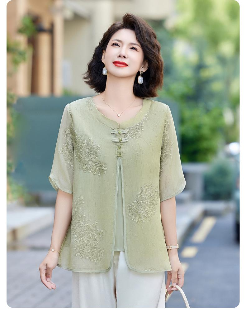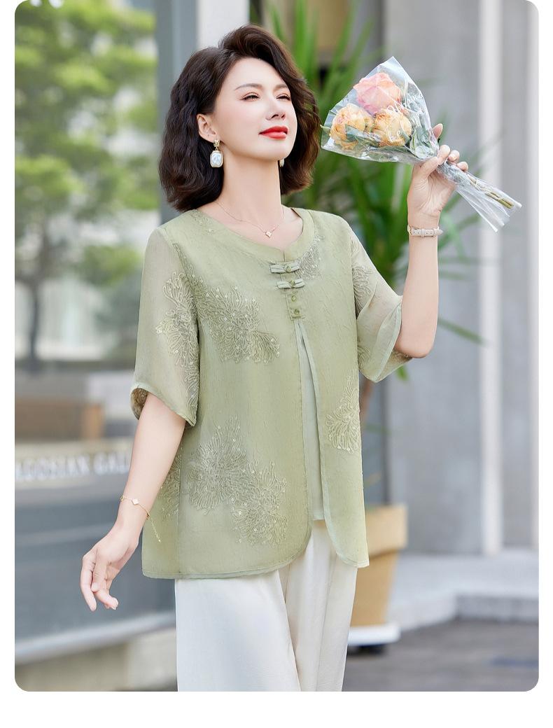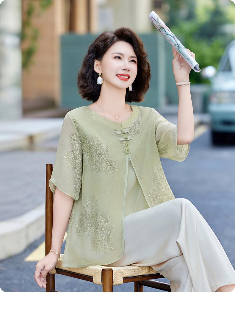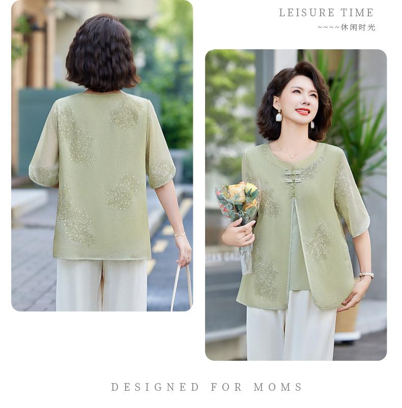 Mãe Verão 2025 Novo Estilo Larga Senhora Falso Duas Peças Manga Curta Camiseta Pequena Verão Mulheres de Meia Idade e Idosas Camiseta de Manga Curta de Verão