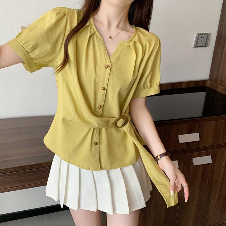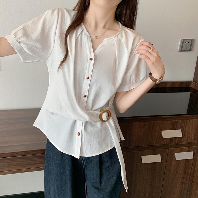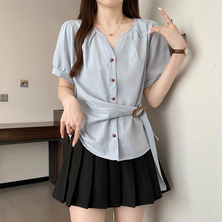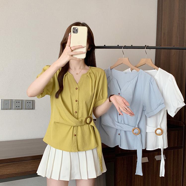Roupas de Verão Novas 2025 para Mulheres Gordinhas Plus Size Estilo Francês Decote em V Cintura Blusas de Manga Curta