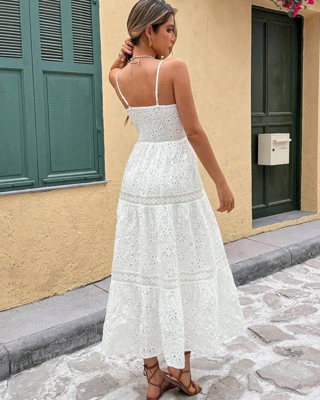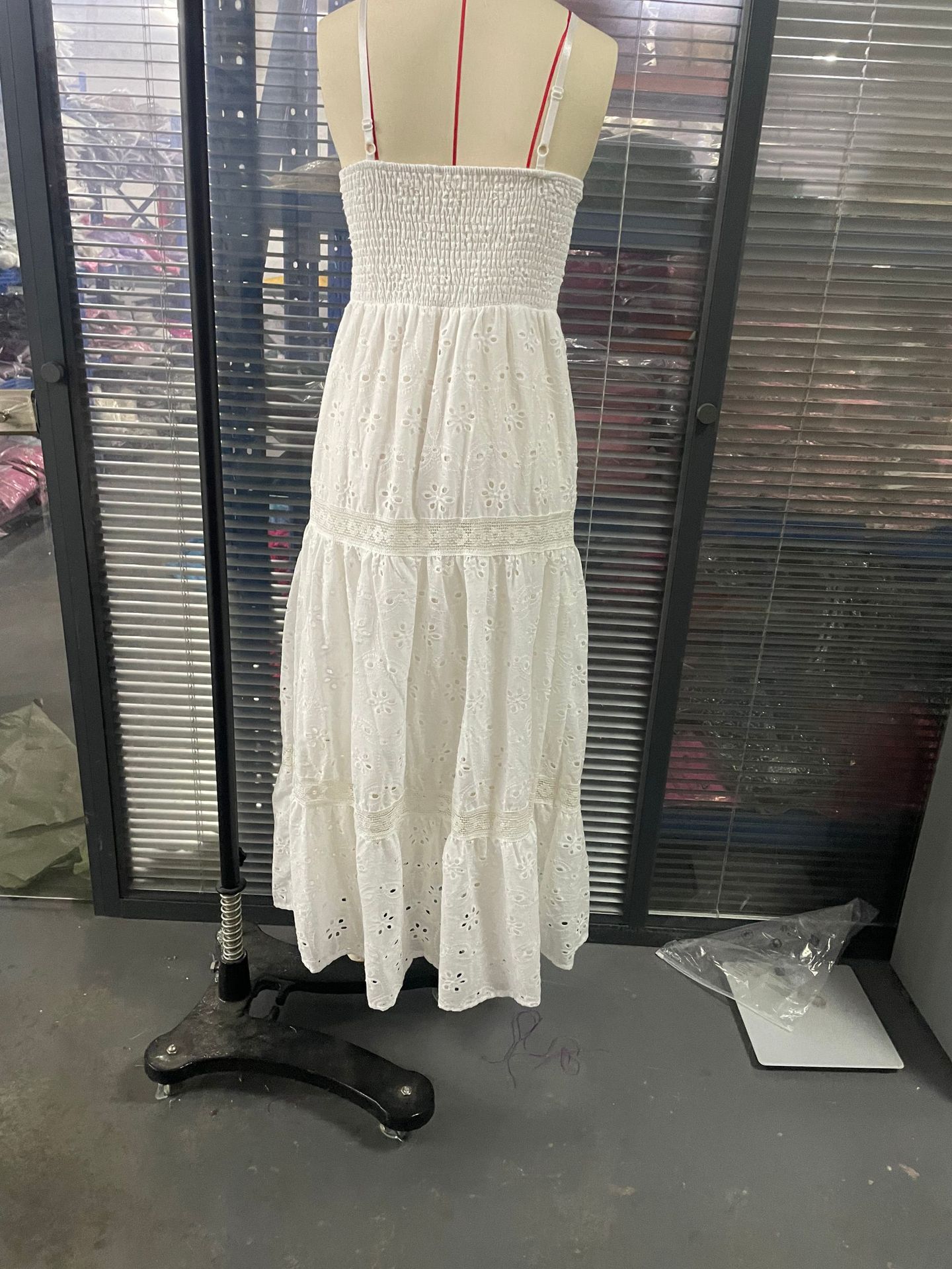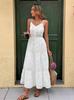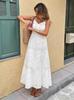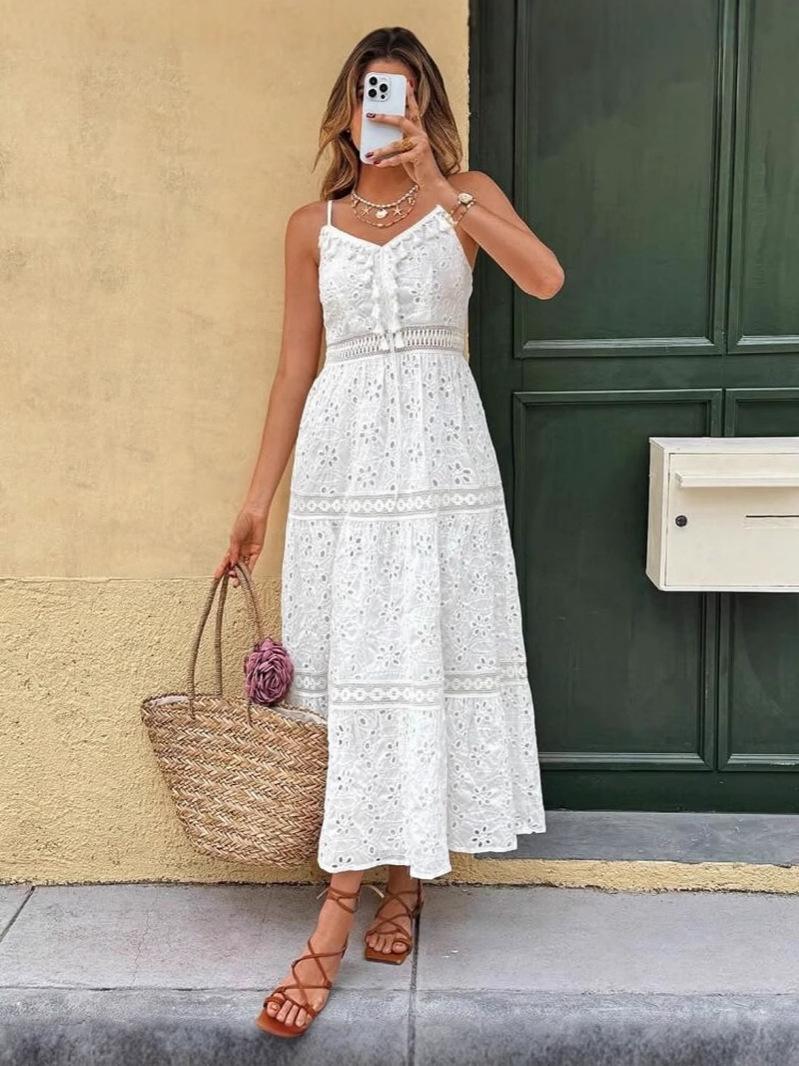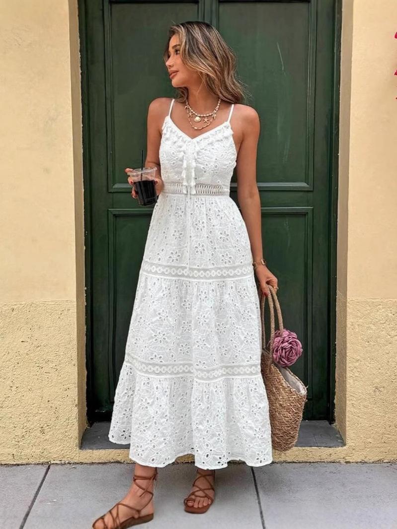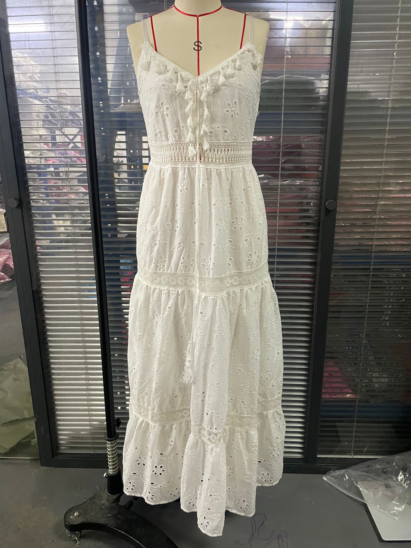 Transfronteiriço 2025 comércio exterior feminino novo sling INS quente decote V branco oco borla bordado vestido
