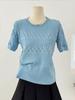 Top Tricotado de Manga Curta Crochê Vazado Cor Sólida Estilo Coreano Verão 2025 Novo Gola Redonda Ajustado Suéter Ajustado para Mulheres