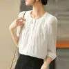 Camisa Branca de Chiffon Redonda da Moda para Mulheres, Estilo Verão 2026, Versátil e Elegante, Adequada para o Trabalho, com Mangas Três Quartos, A4954
