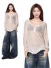Blusa Branca Fina Decote V Seda Gelo Proteção Solar para Mulheres Verão 2025 Solta Regata Externa Camiseta Manga Longa Top Ligeiramente Transparente