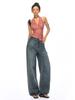Roupa Feminina de Seda Laranja # Jeans Azul Vintage de Cintura Alta e Perna Reta Feminino Verão Novo Design Assimétrico Calças Largas