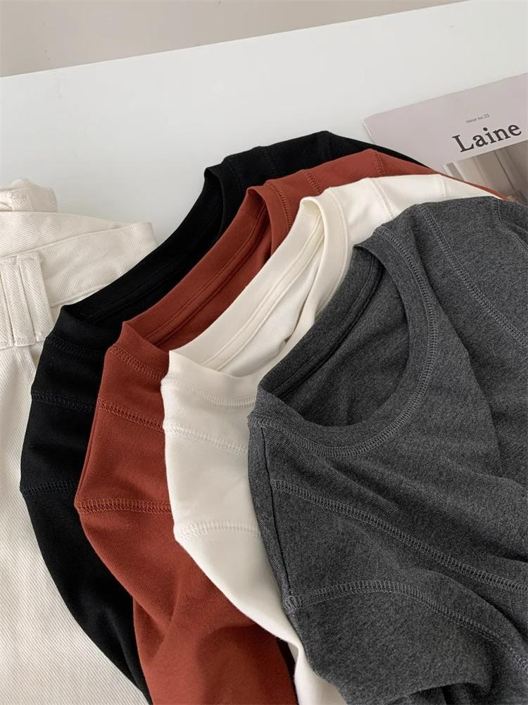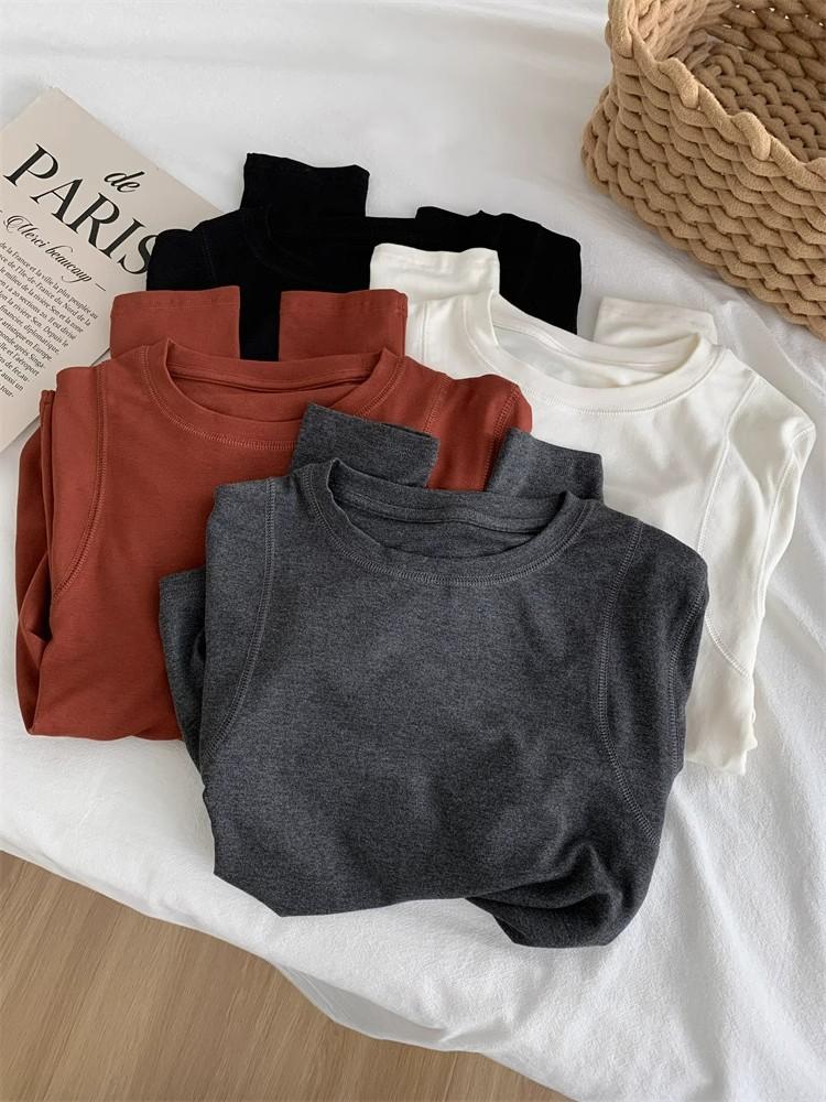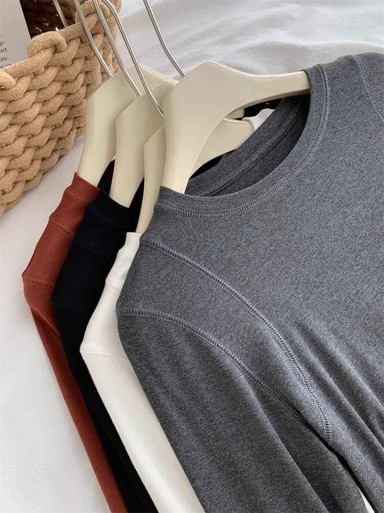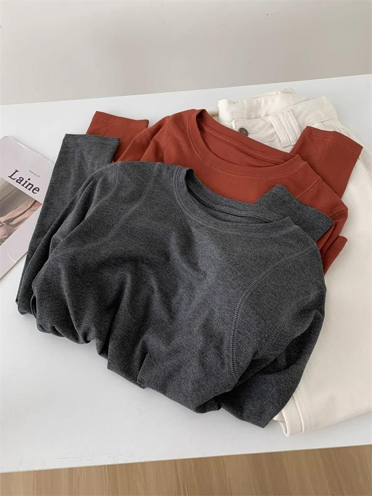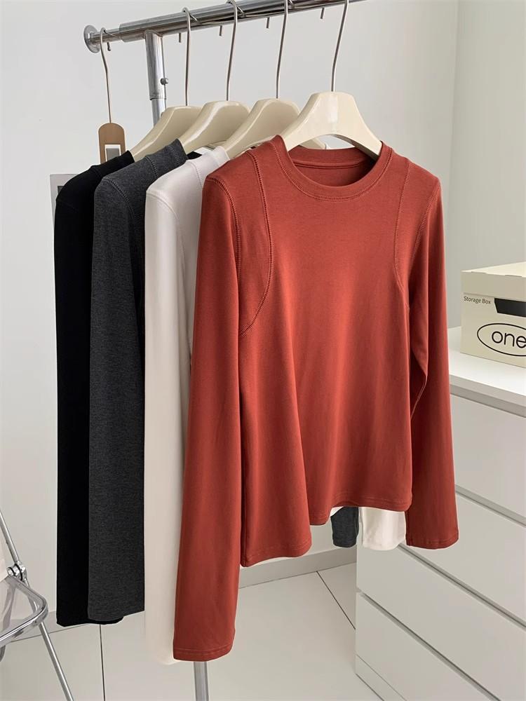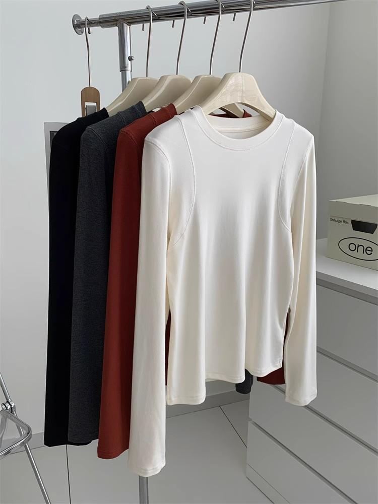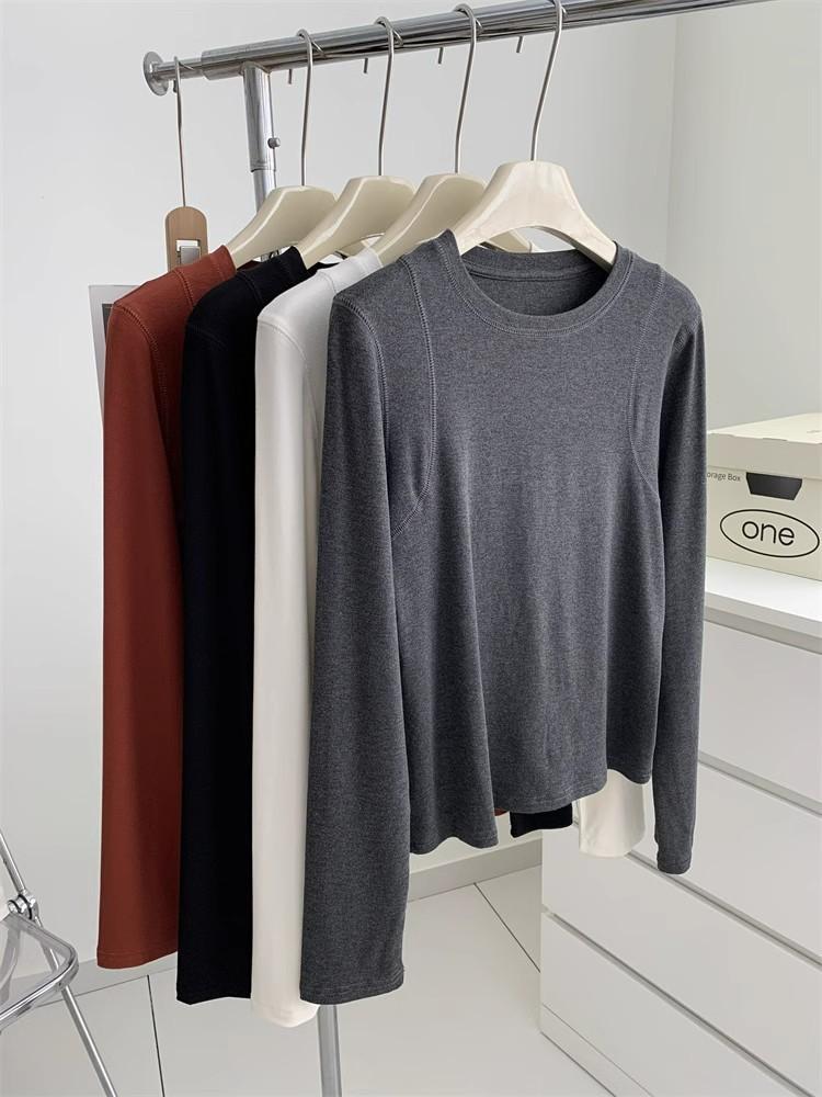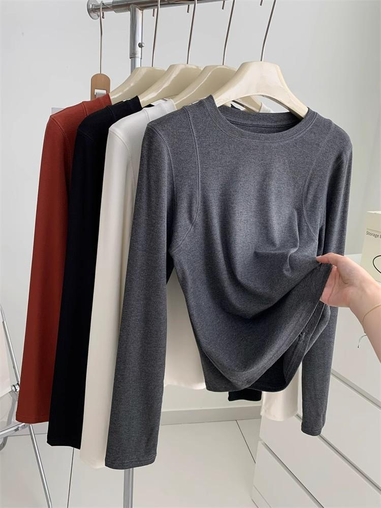 Design Sense Camiseta feminina de cor sólida com ombro costurado, outono e inverno, blusa interna básica, gola redonda, manga comprida, camisa básica