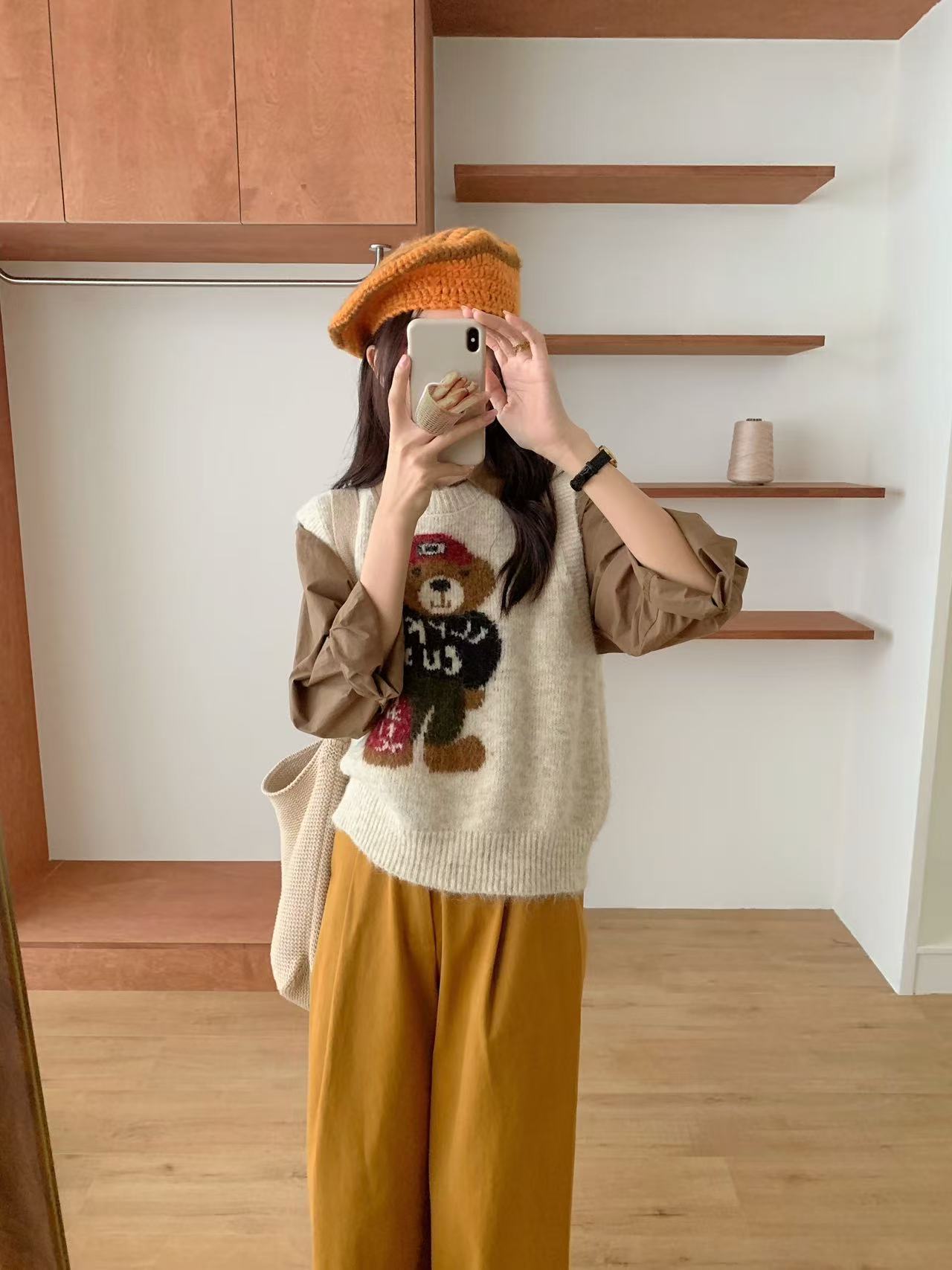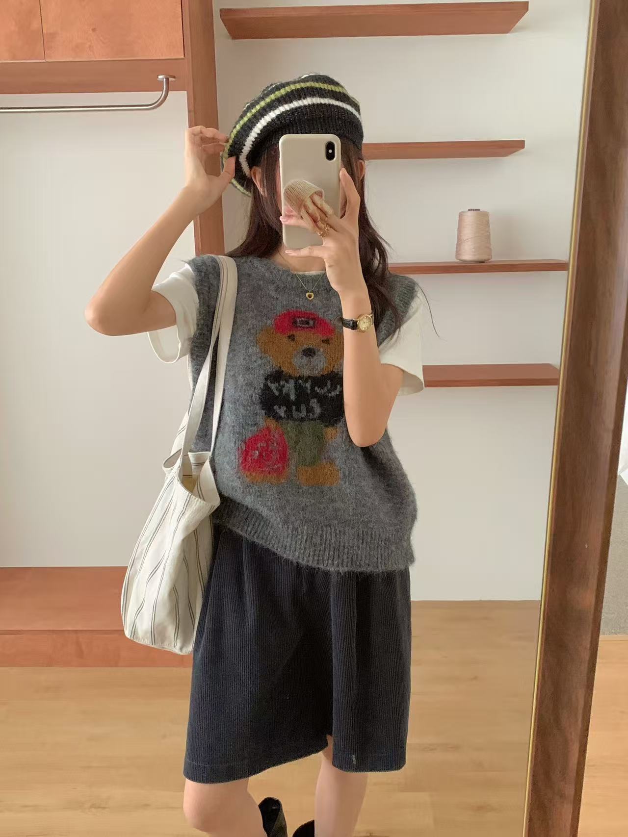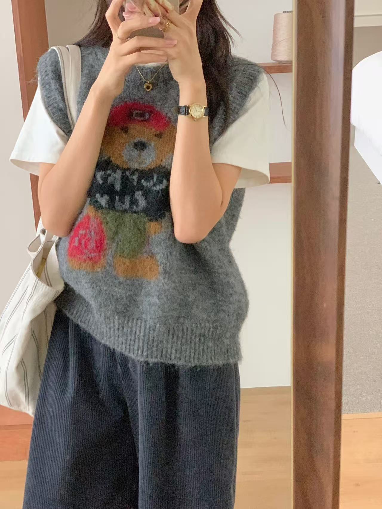 Suéter regata de malha macio e glutinoso de urso feminino 2025 novo outono e inverno estilo coreano gola redonda solto jacquard sem mangas feminino