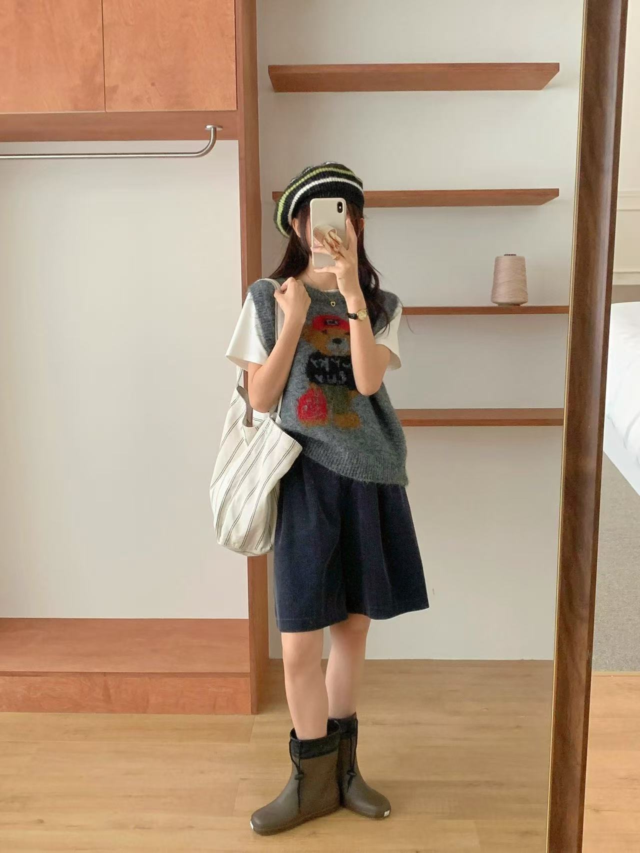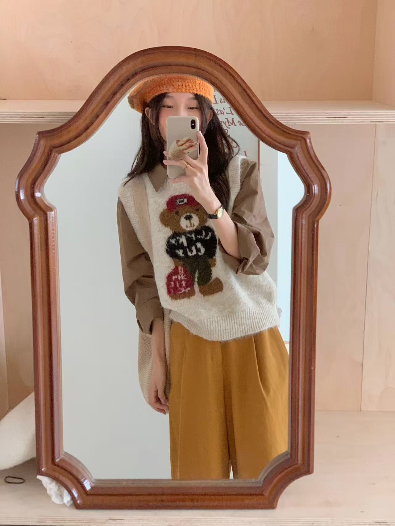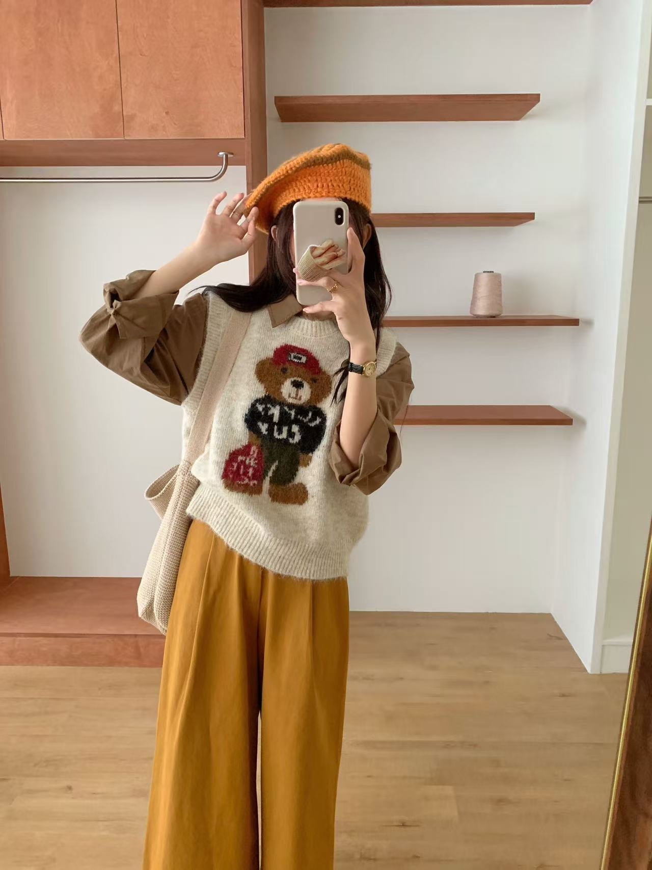 Suéter regata de malha macio e glutinoso de urso feminino 2025 novo outono e inverno estilo coreano gola redonda solto jacquard sem mangas feminino