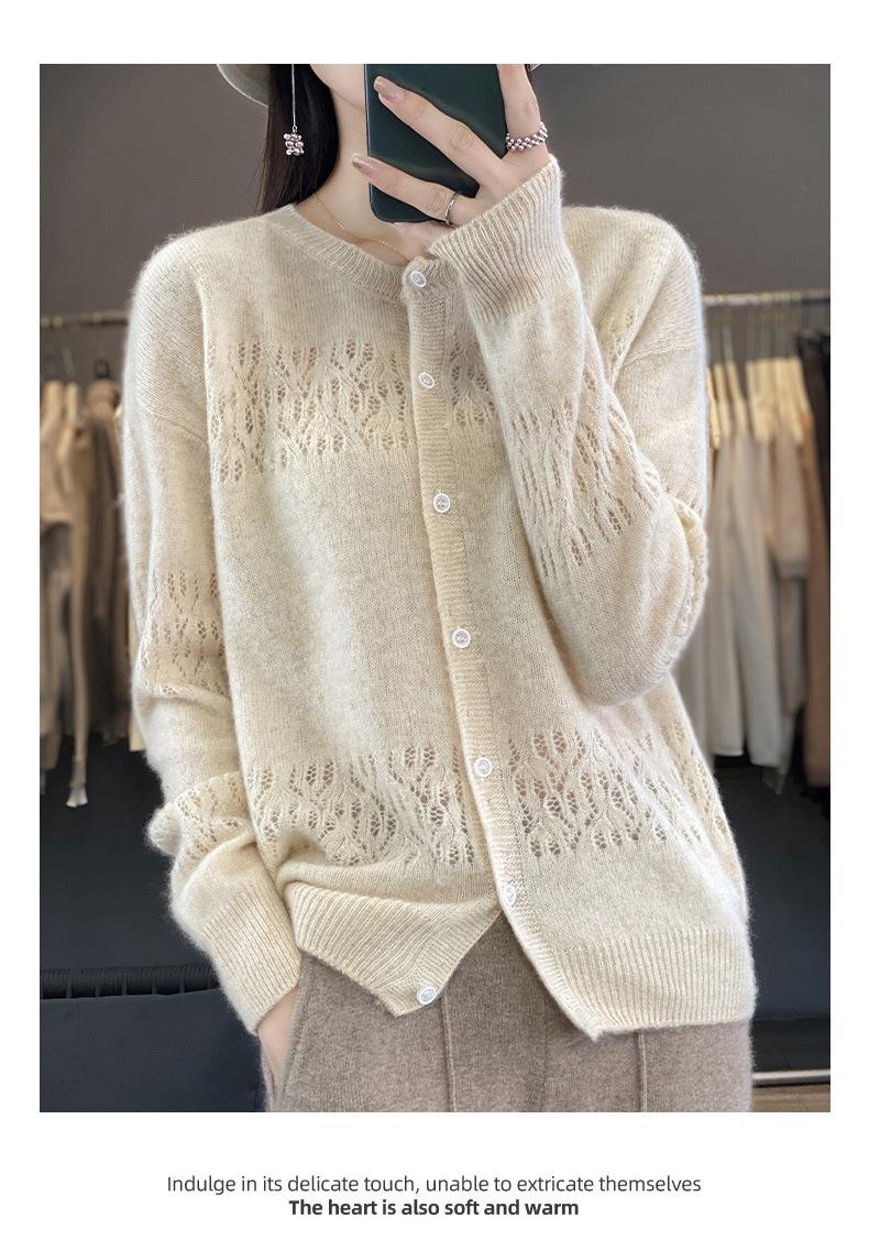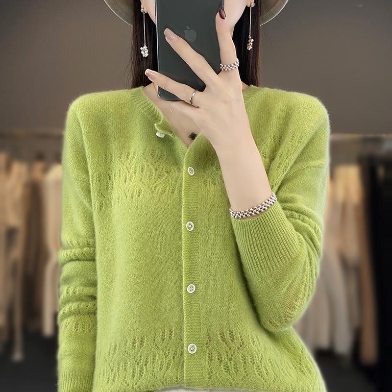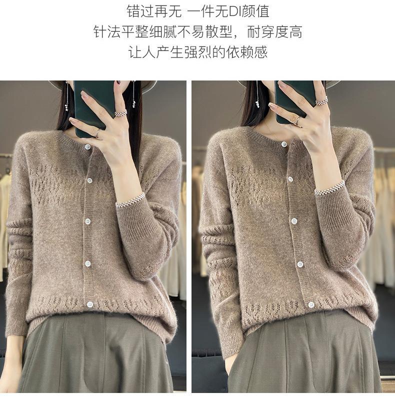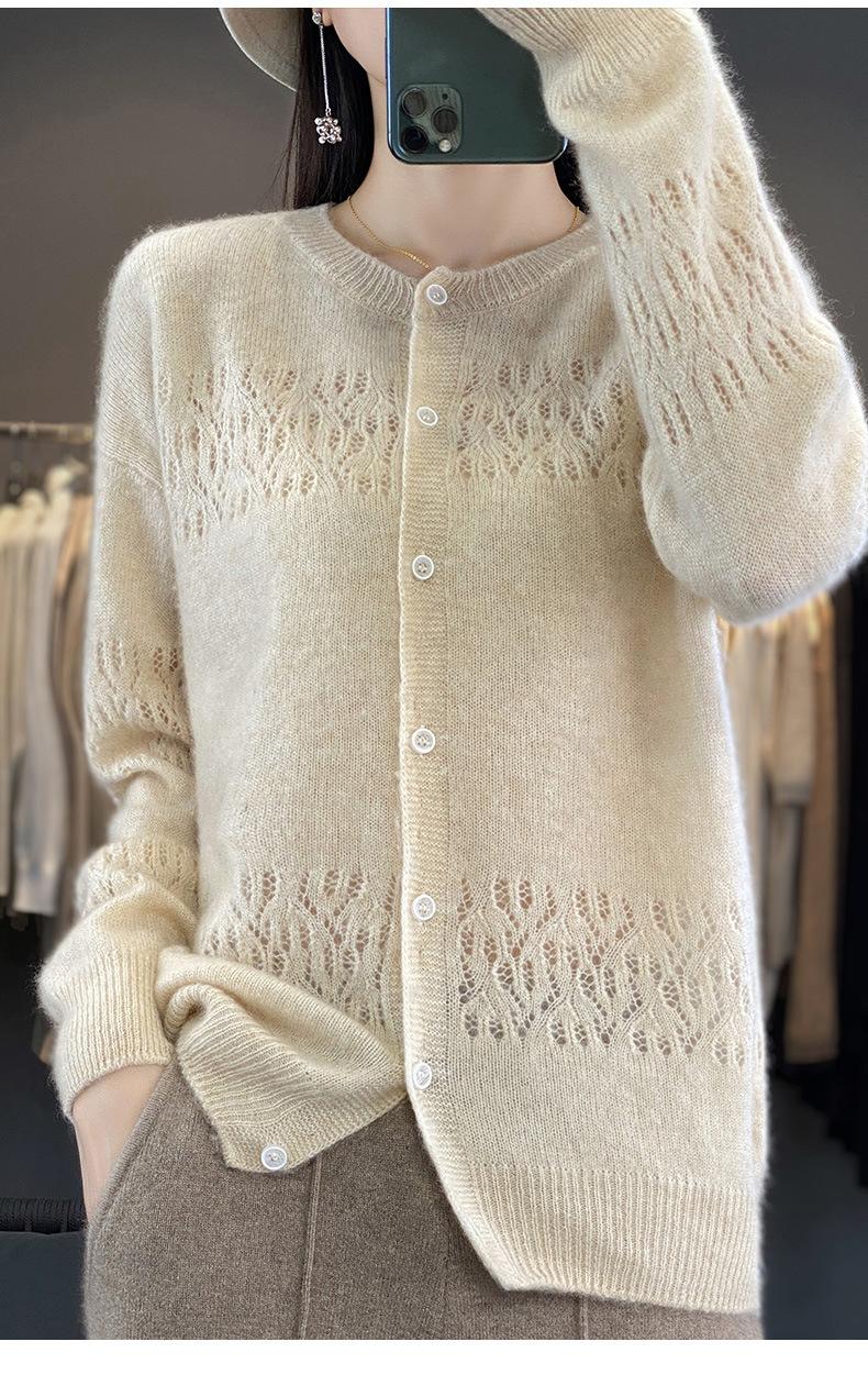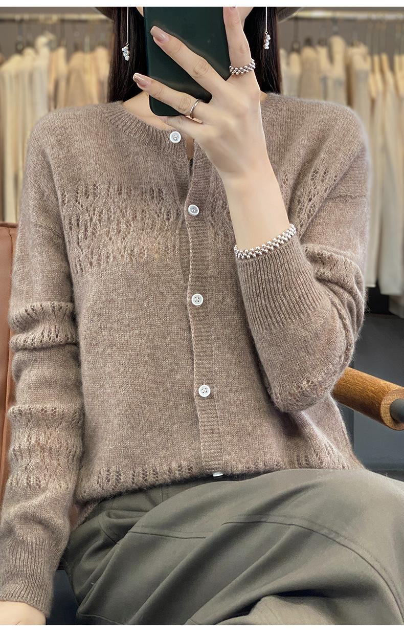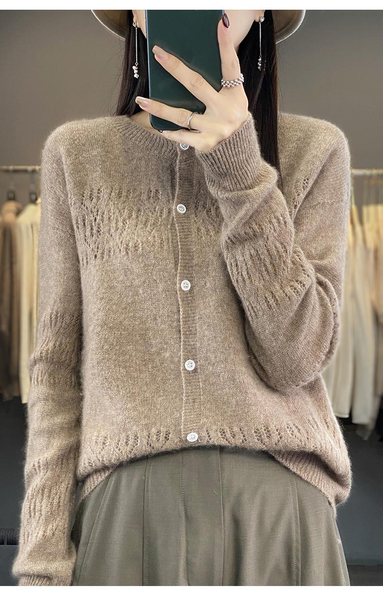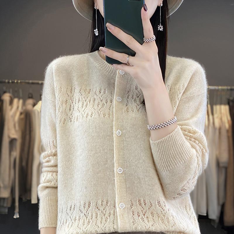 Cardigan Feminino de Lã Pura com Decote Redondo Vazado Outono e Inverno Novo Versátil Emagrecimento Tricotado Macio Base Casaco de Manga Longa