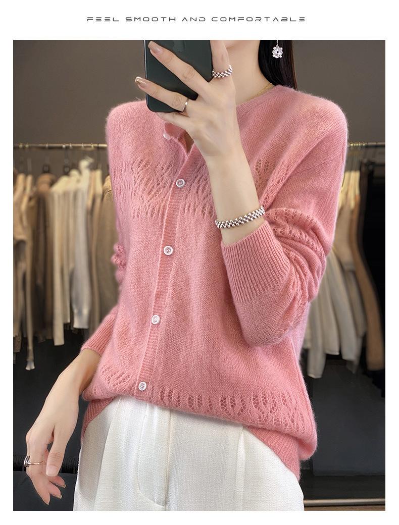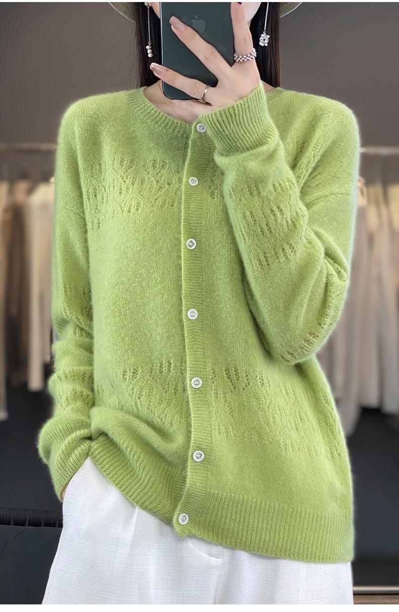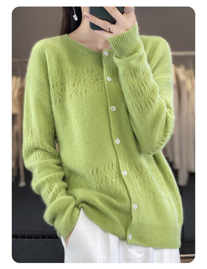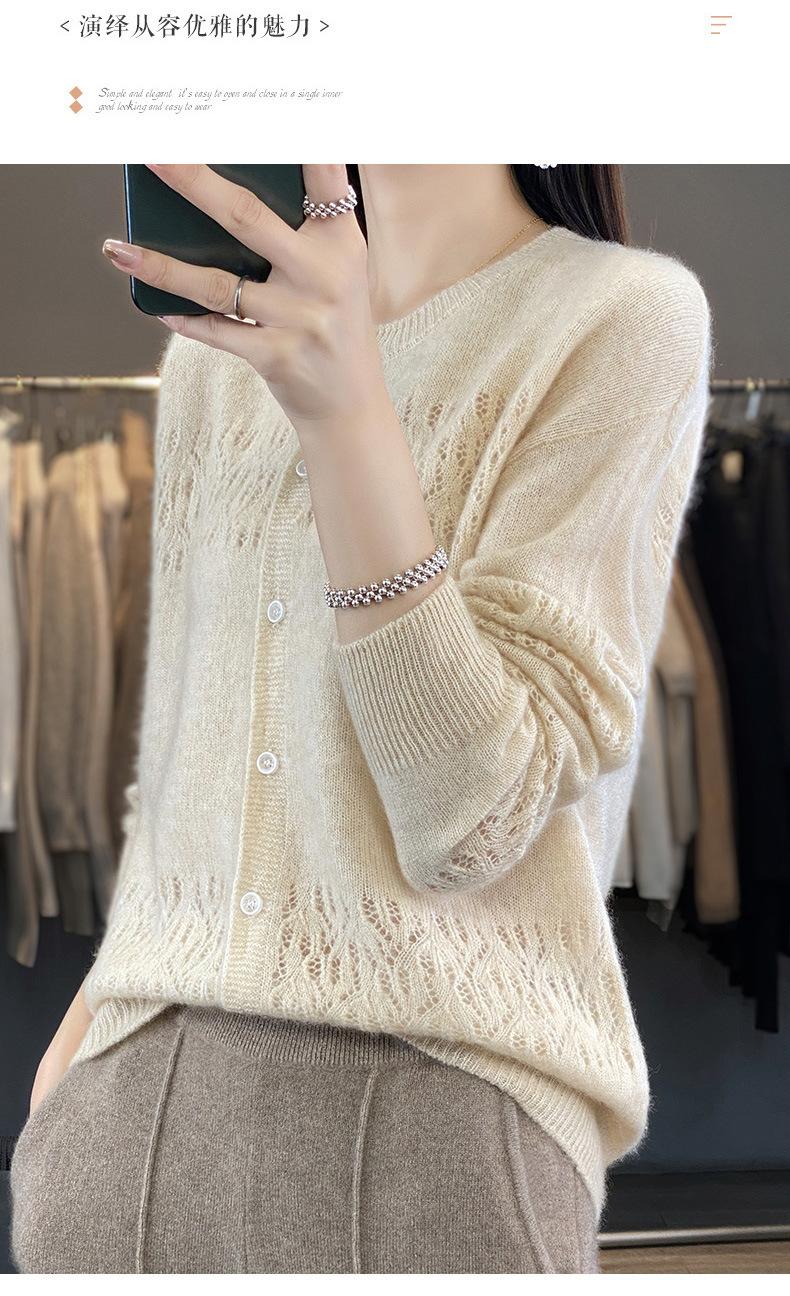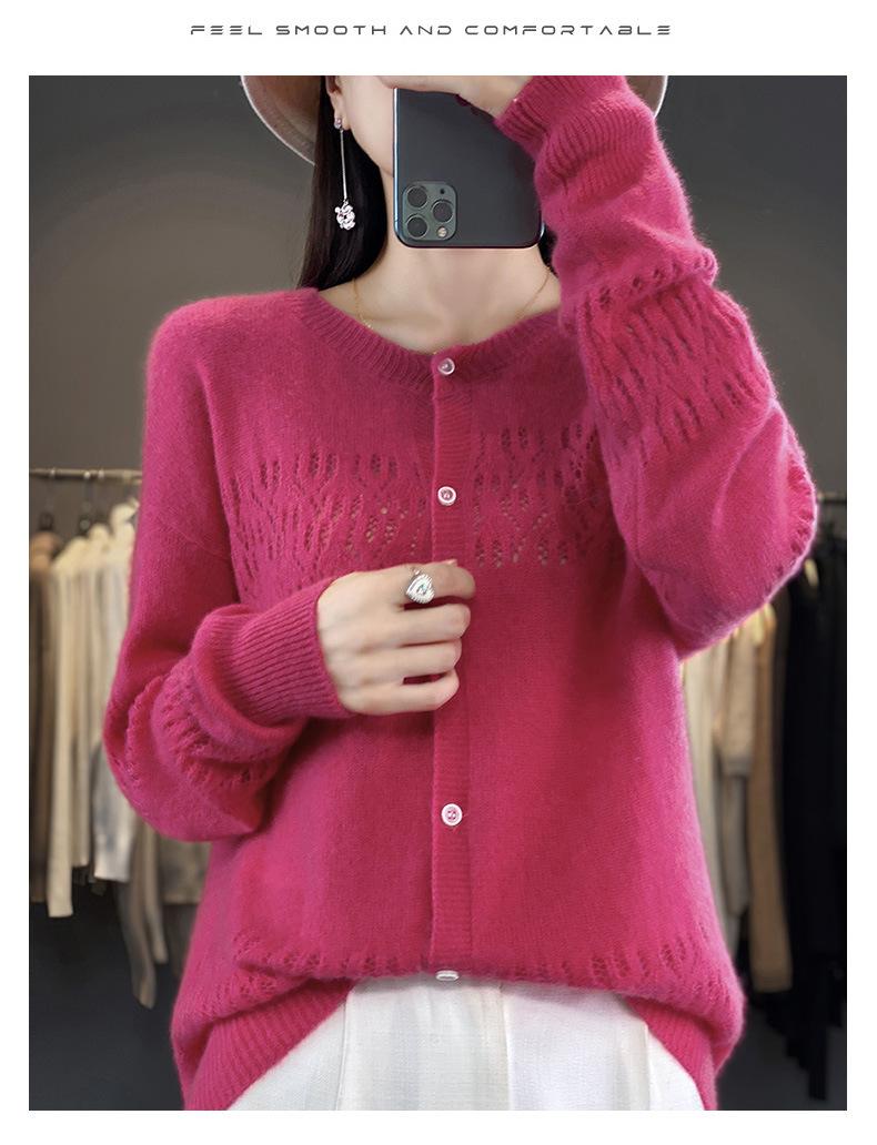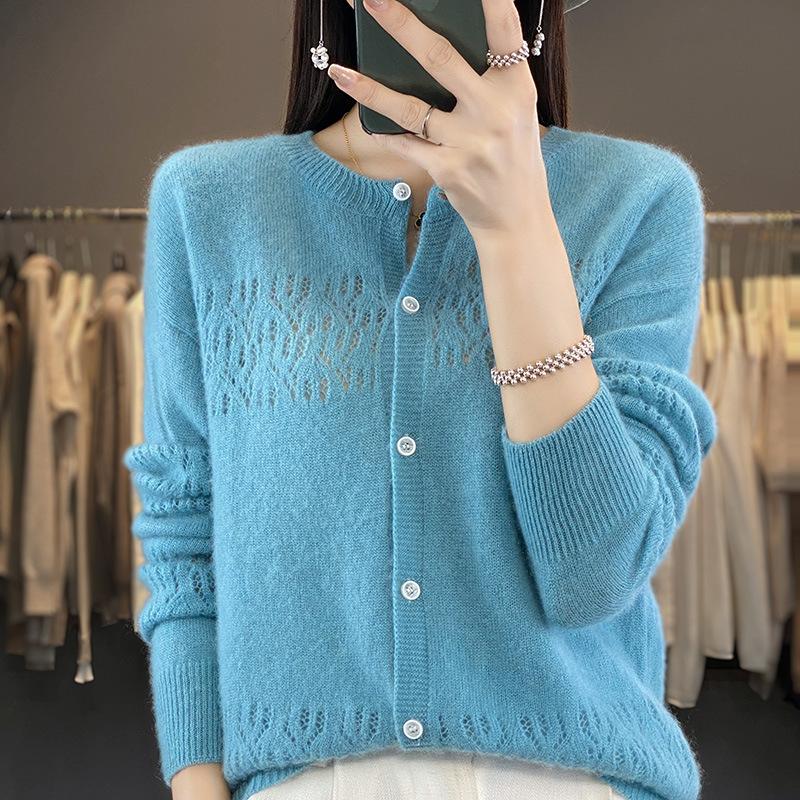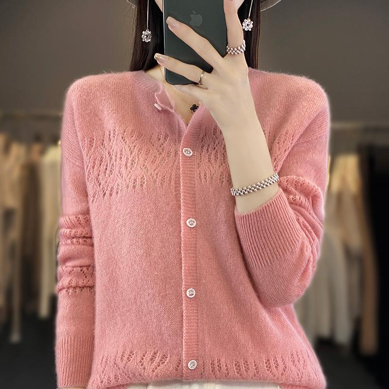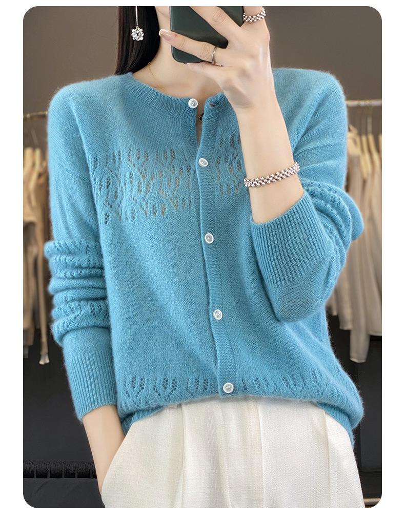 Cardigan Feminino de Lã Pura com Decote Redondo Vazado Outono e Inverno Novo Versátil Emagrecimento Tricotado Macio Base Casaco de Manga Longa