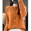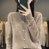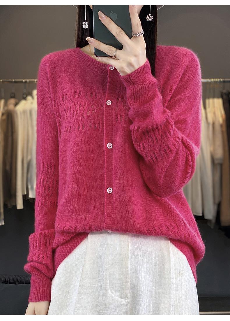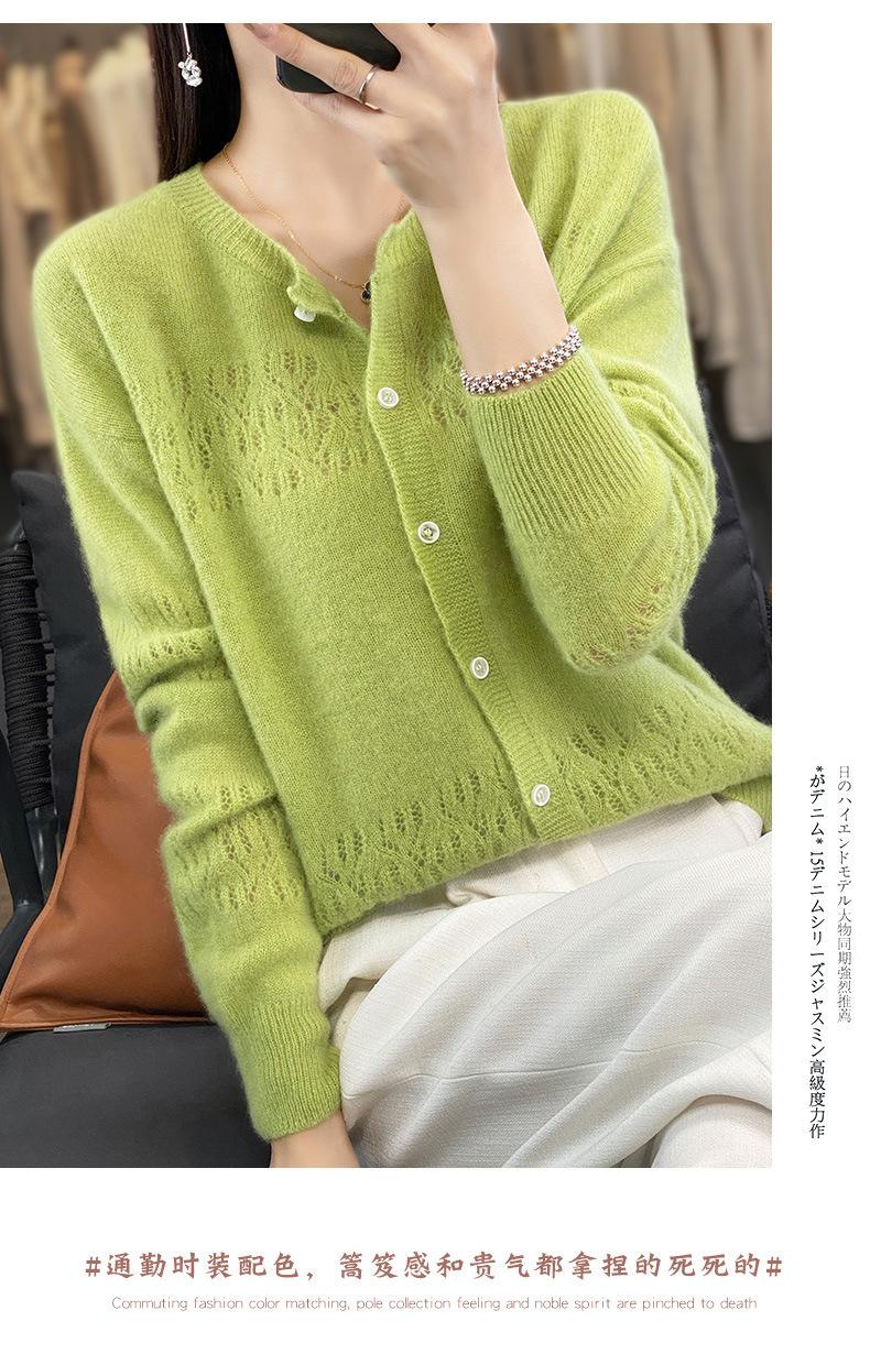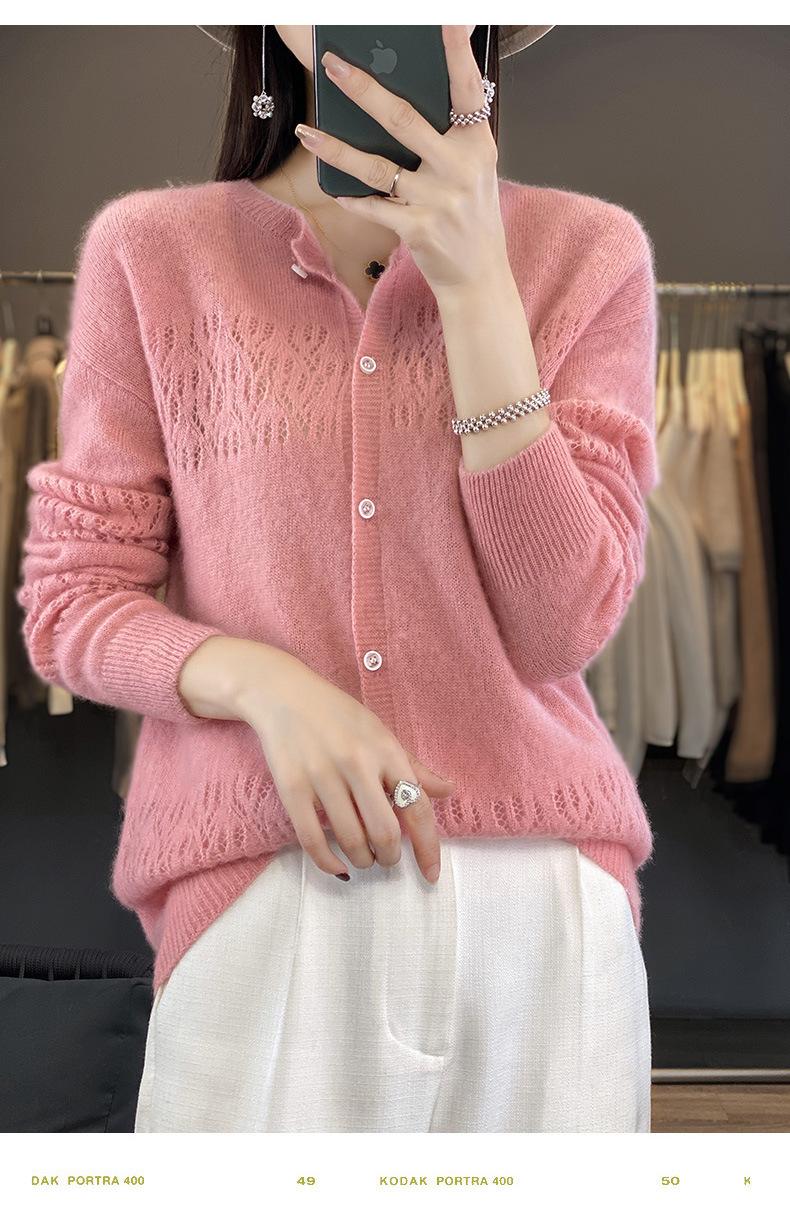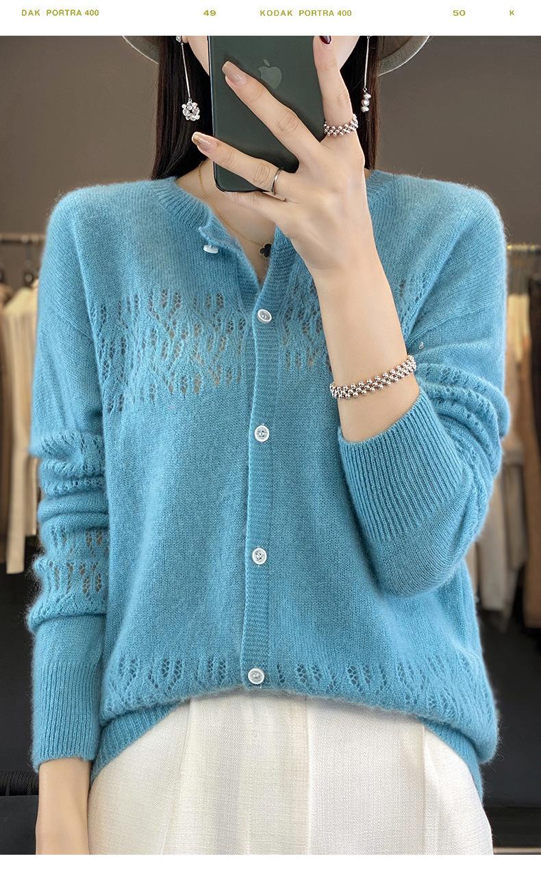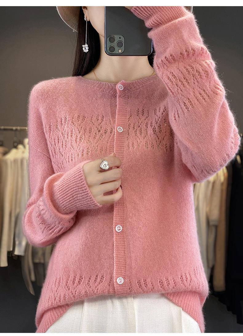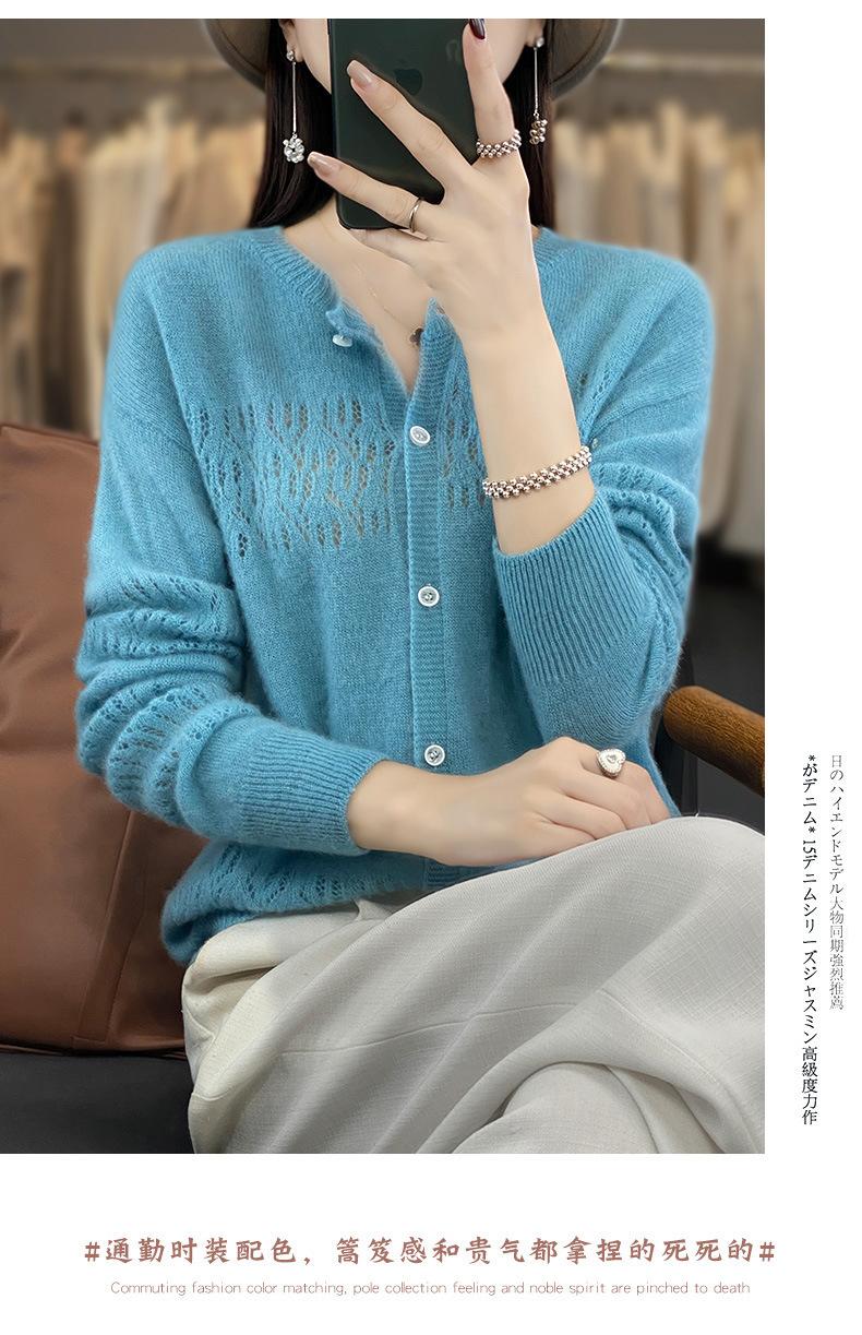 Cardigan Feminino de Lã Pura com Decote Redondo Vazado Outono e Inverno Novo Versátil Emagrecimento Tricotado Macio Base Casaco de Manga Longa