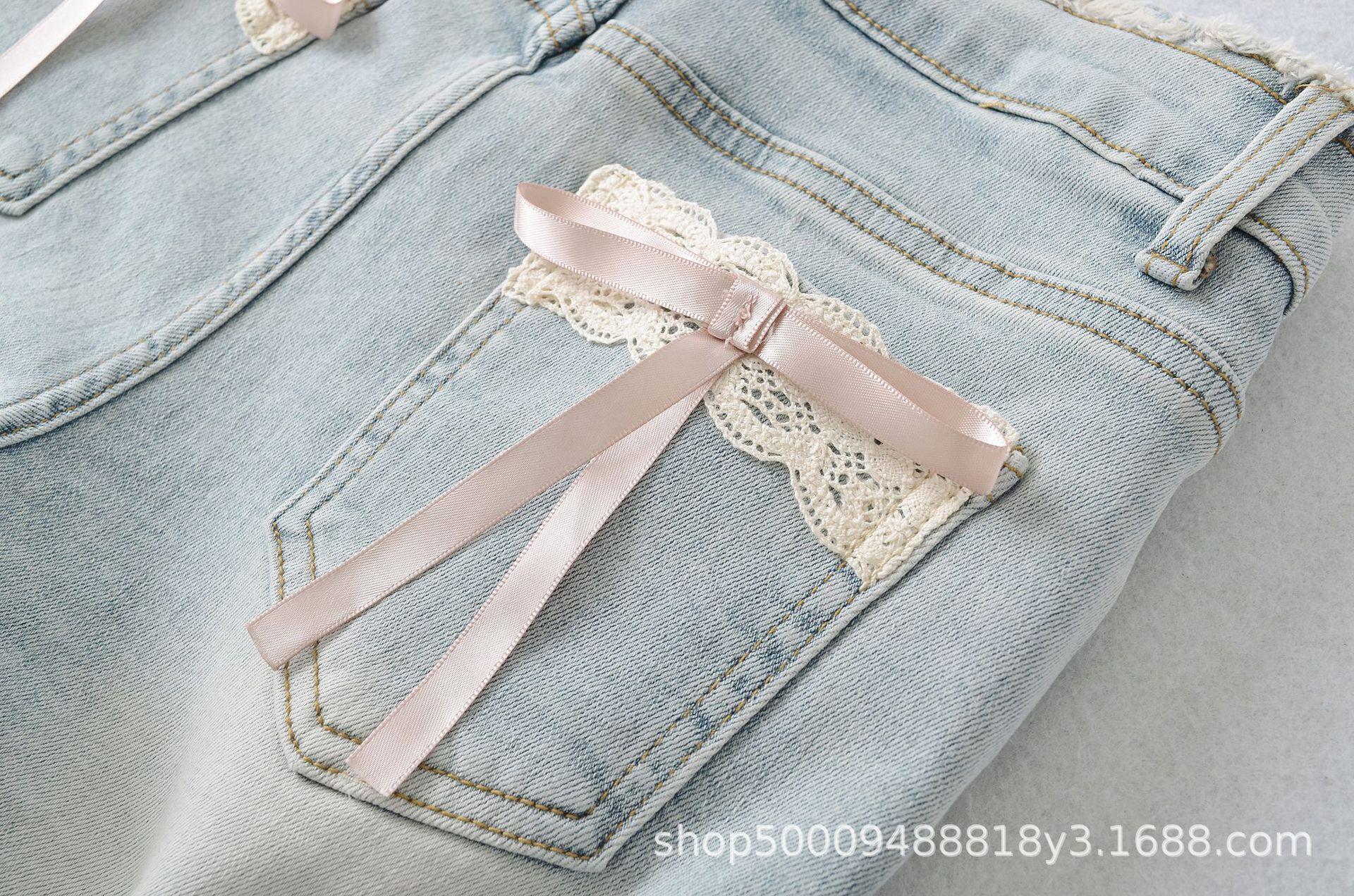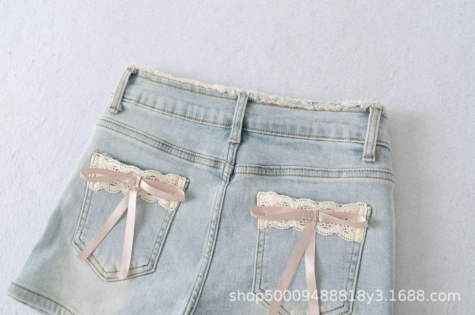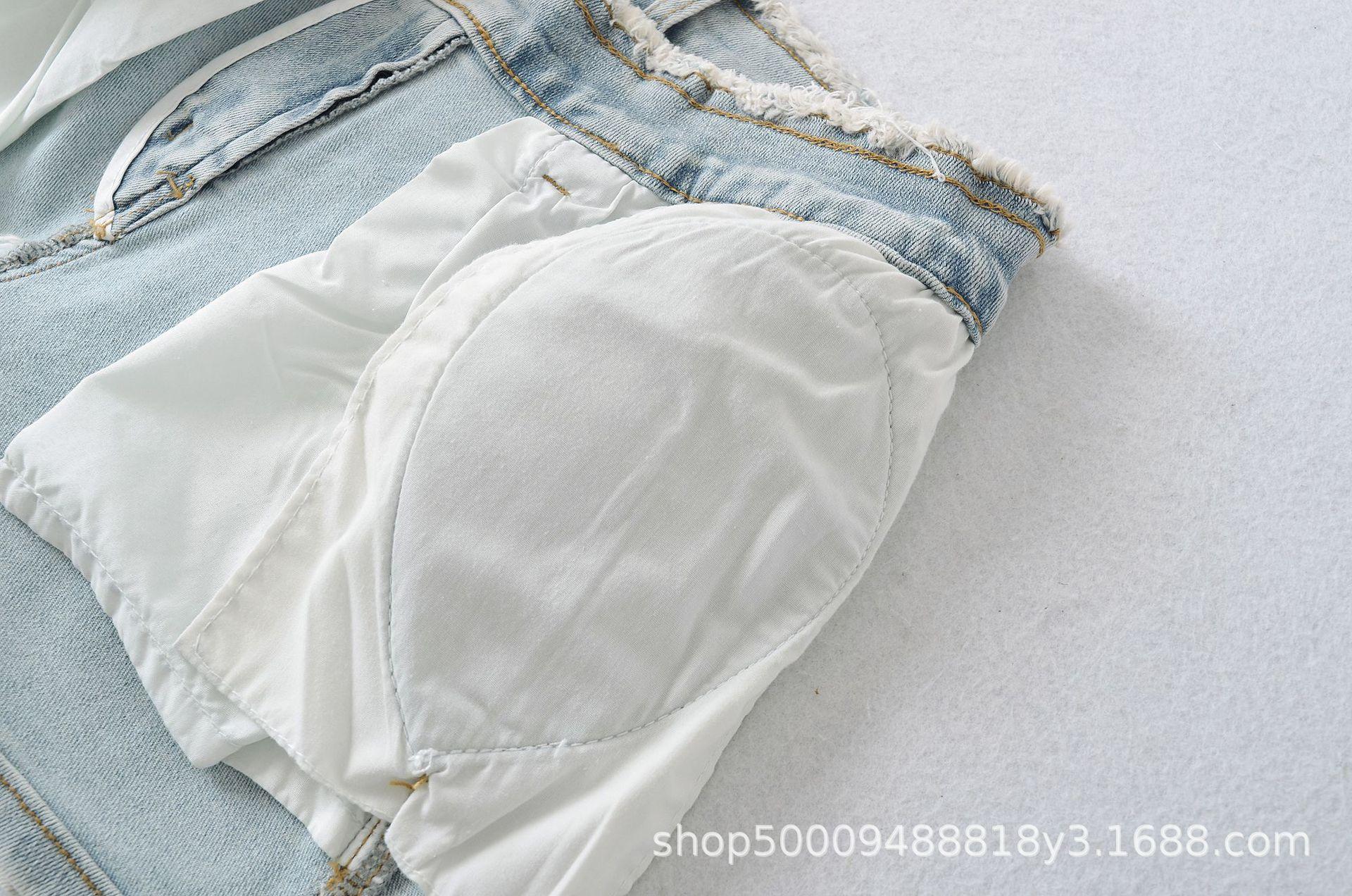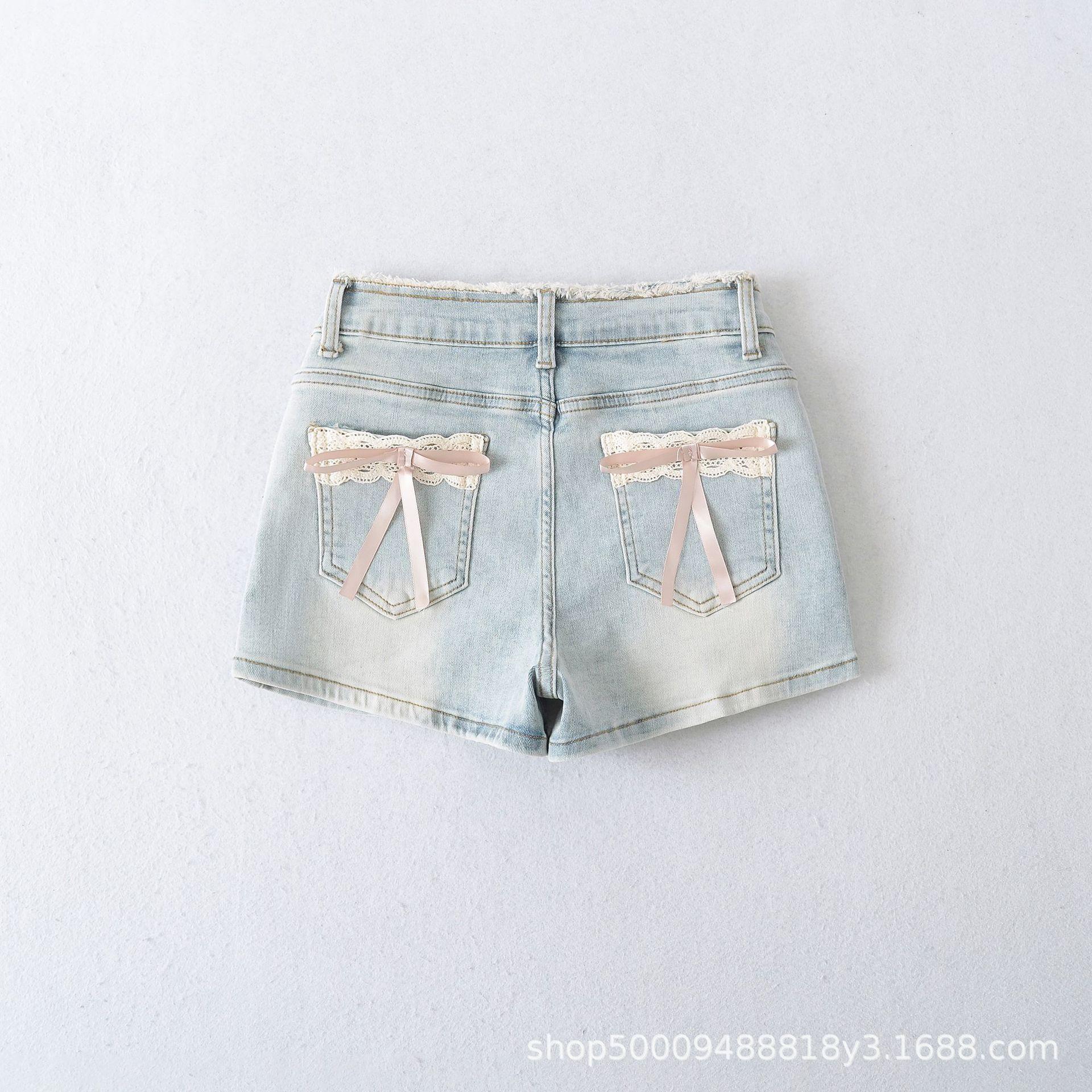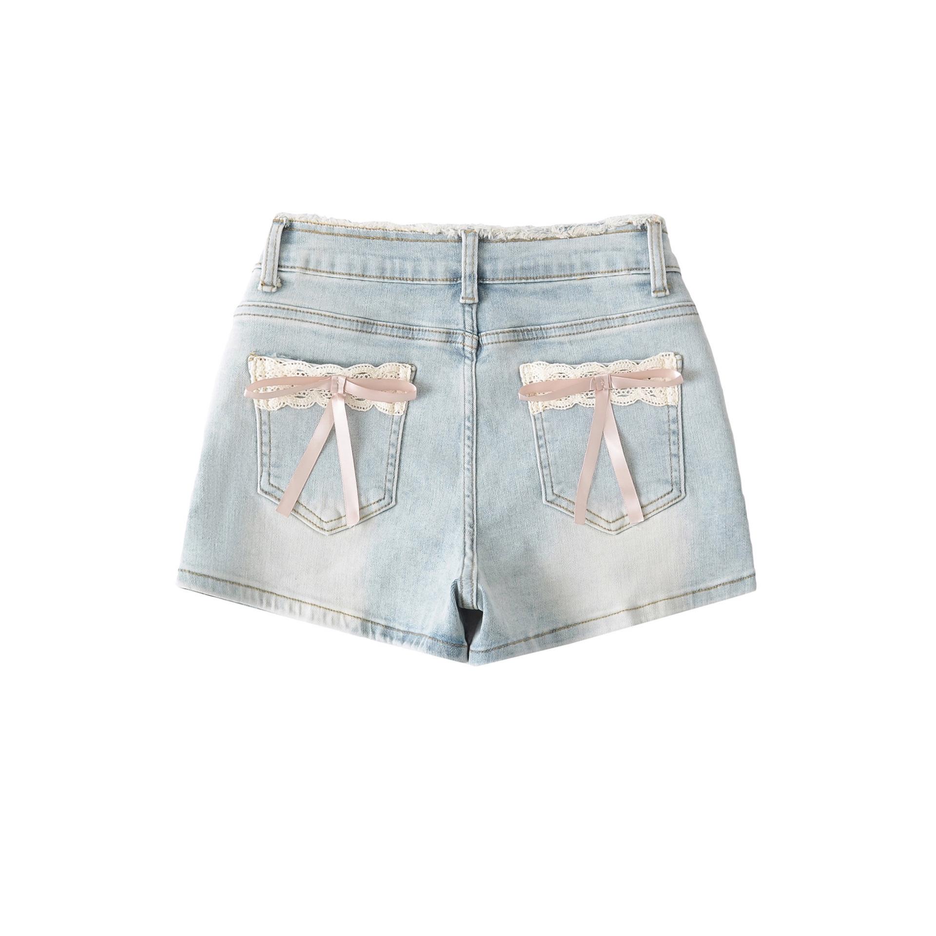 Doce e Puro Laço de Renda de Verão com Almofadas de Quadril Shorts Jeans Lavados e Desgastados Azul Claro Cintura Alta Hot Pants para Mulheres