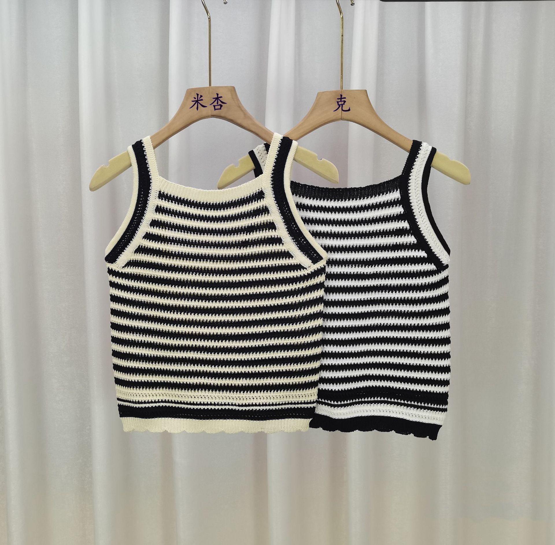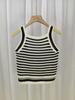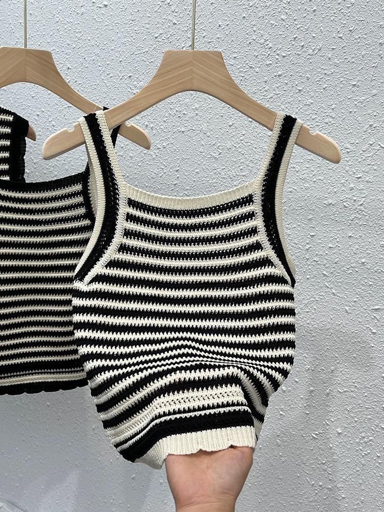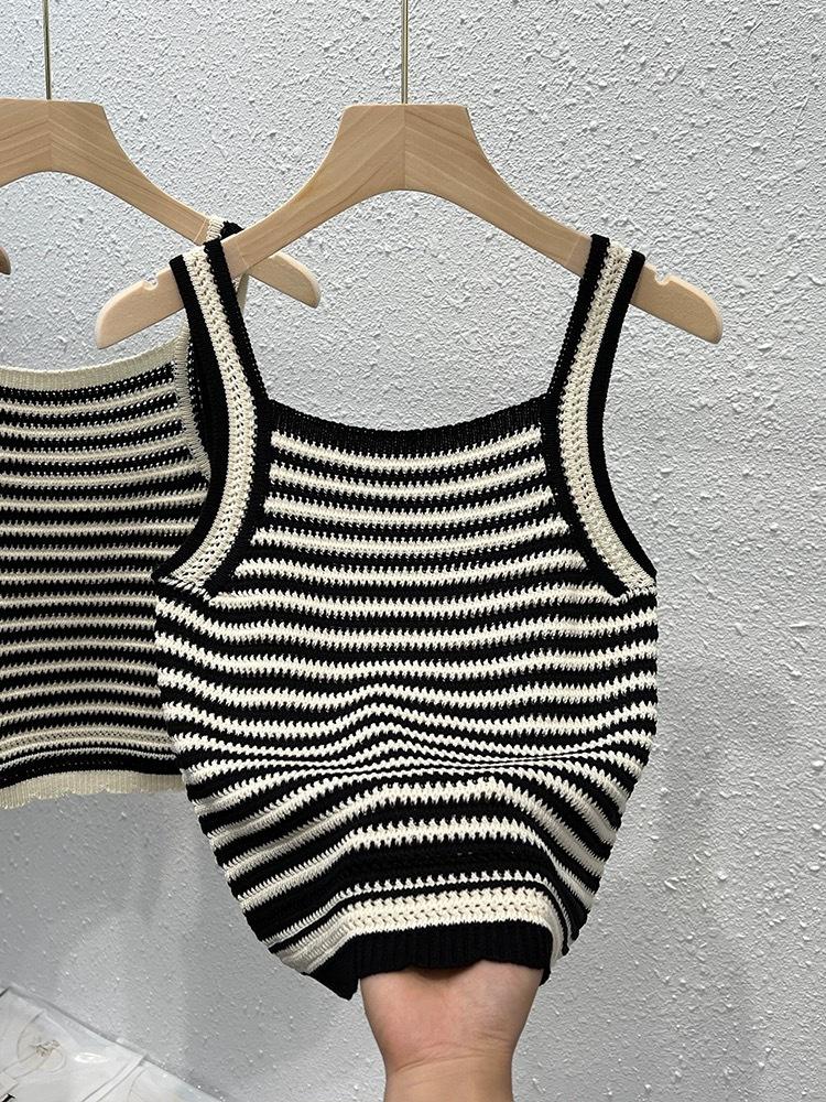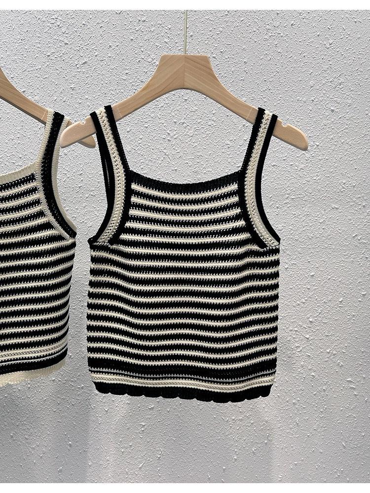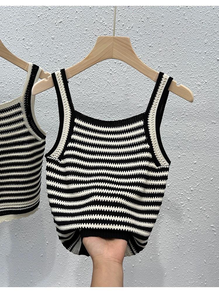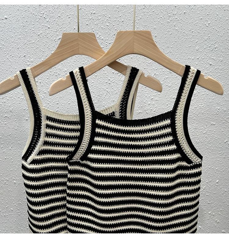 Regata listrada de malha feminina de verão para usar por cima, solta, estilo francês, roupa íntima vazada, regata sem mangas