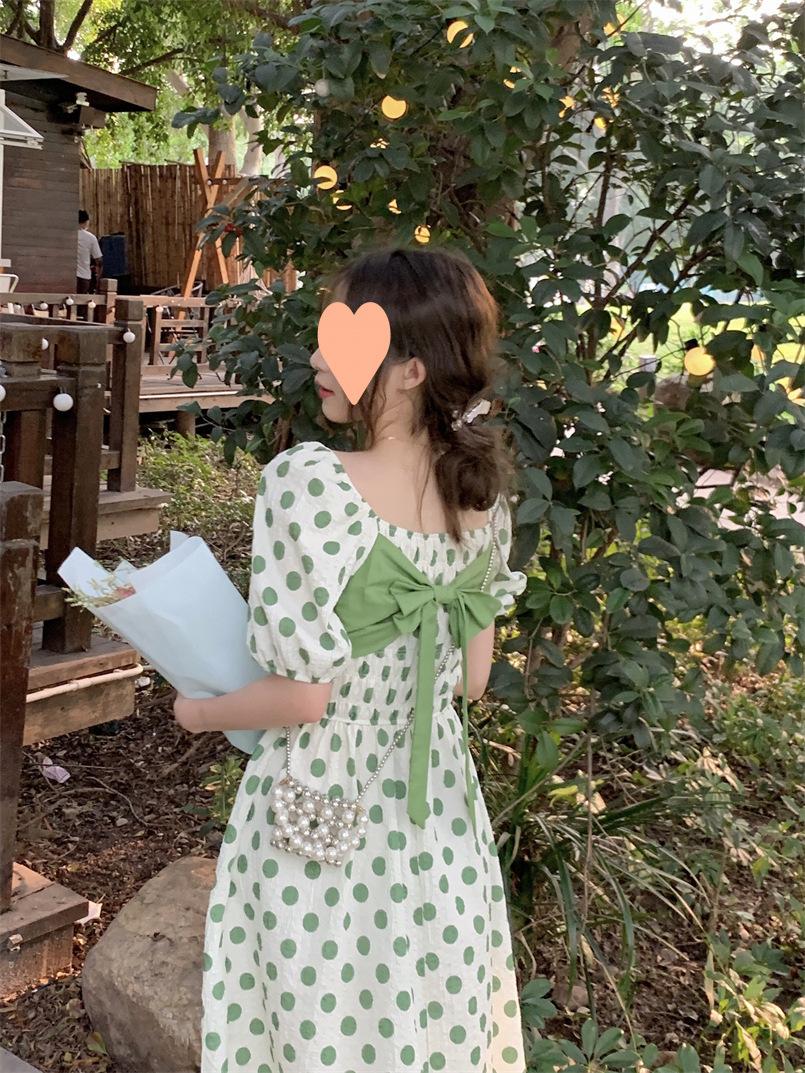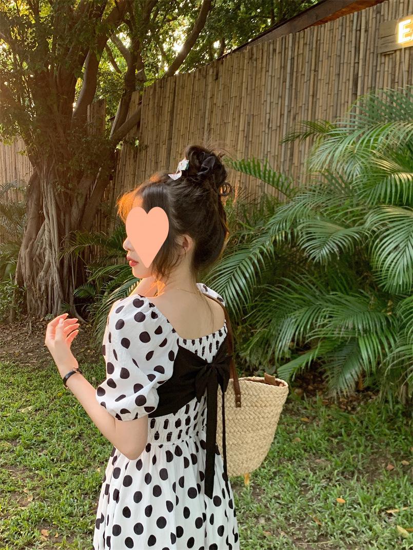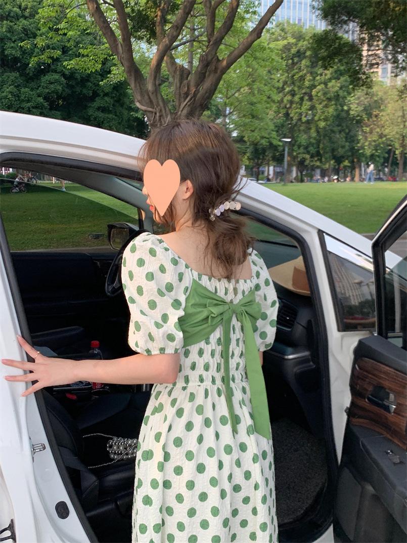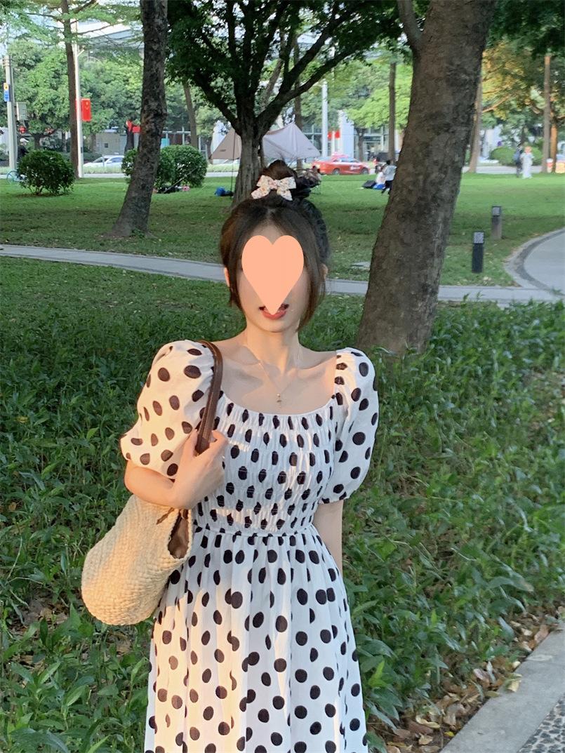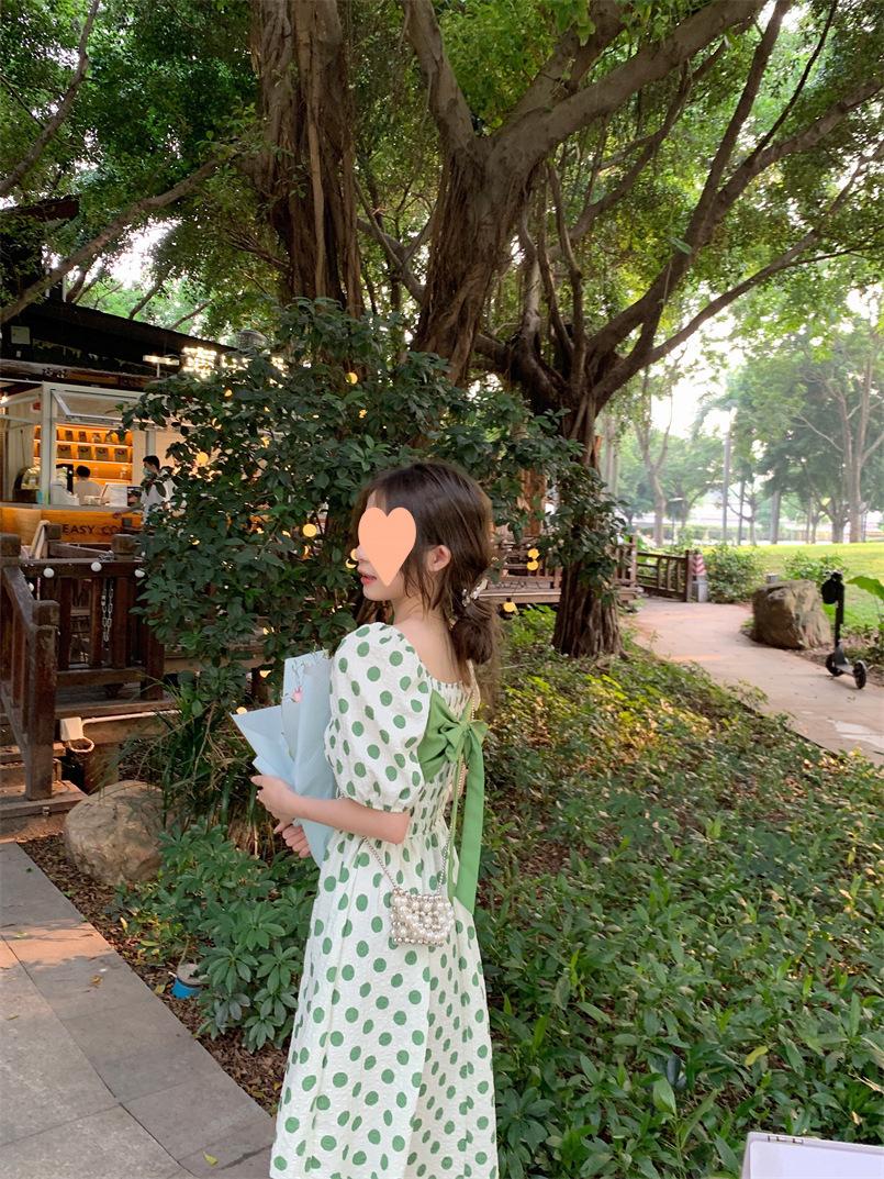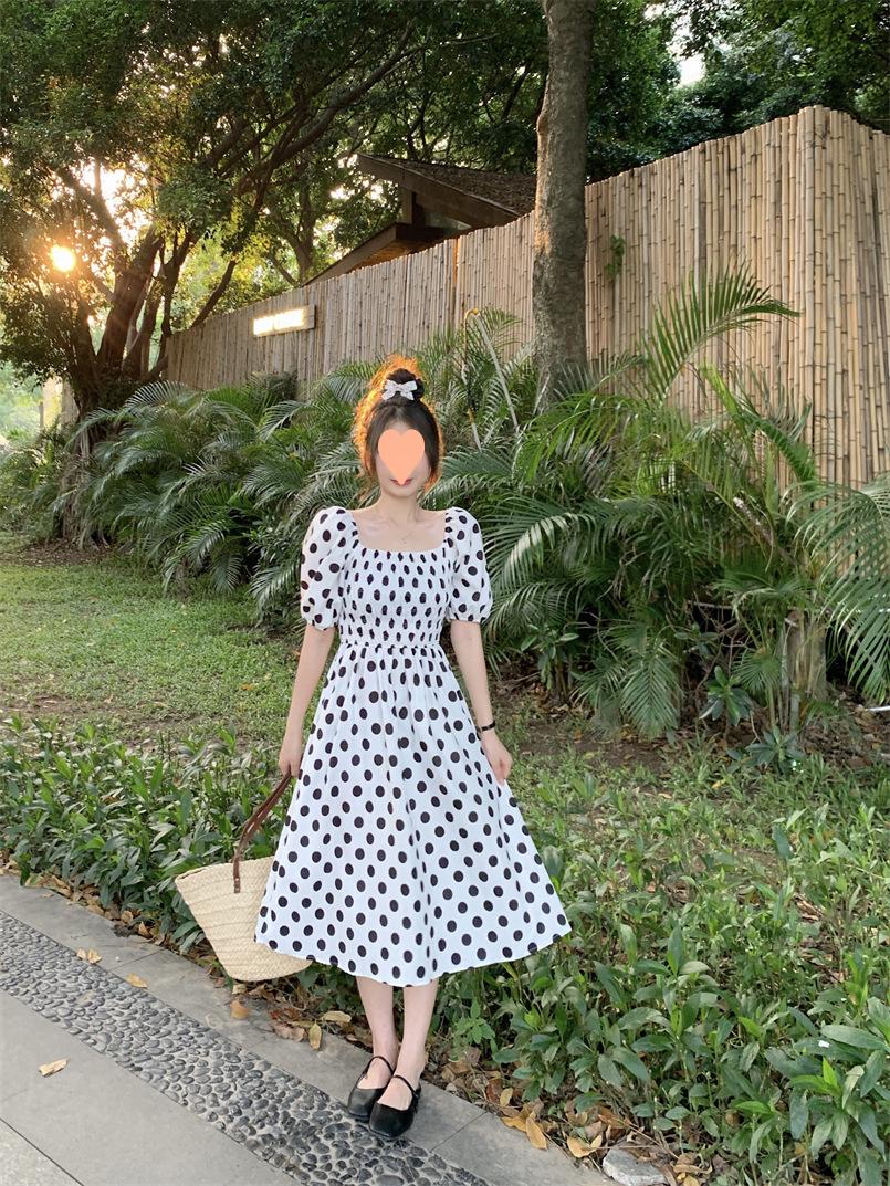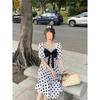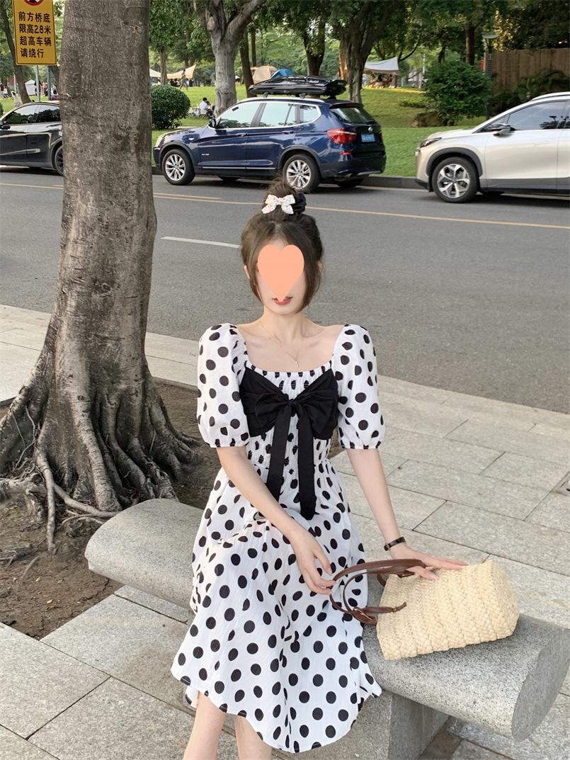 Vestido Novo 2025 Decote Quadrado Laço Bolinhas Verão Feminino Estilo Francês Delicado Cintura Saia Longa