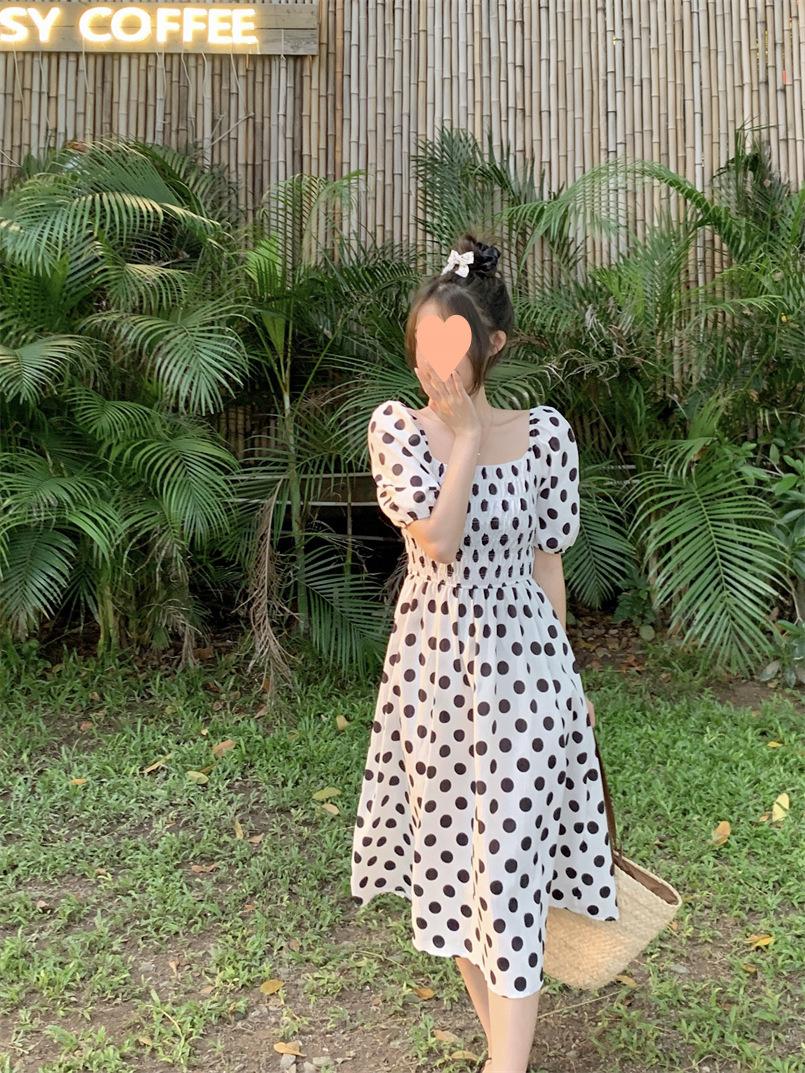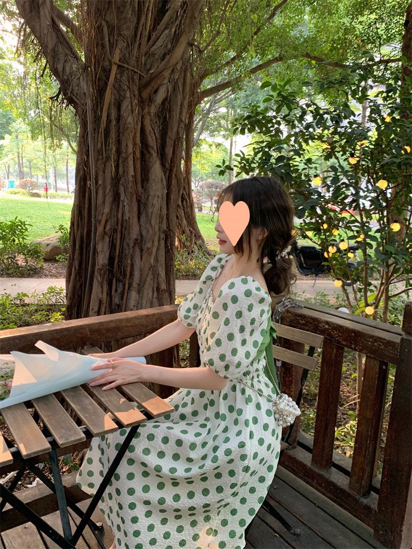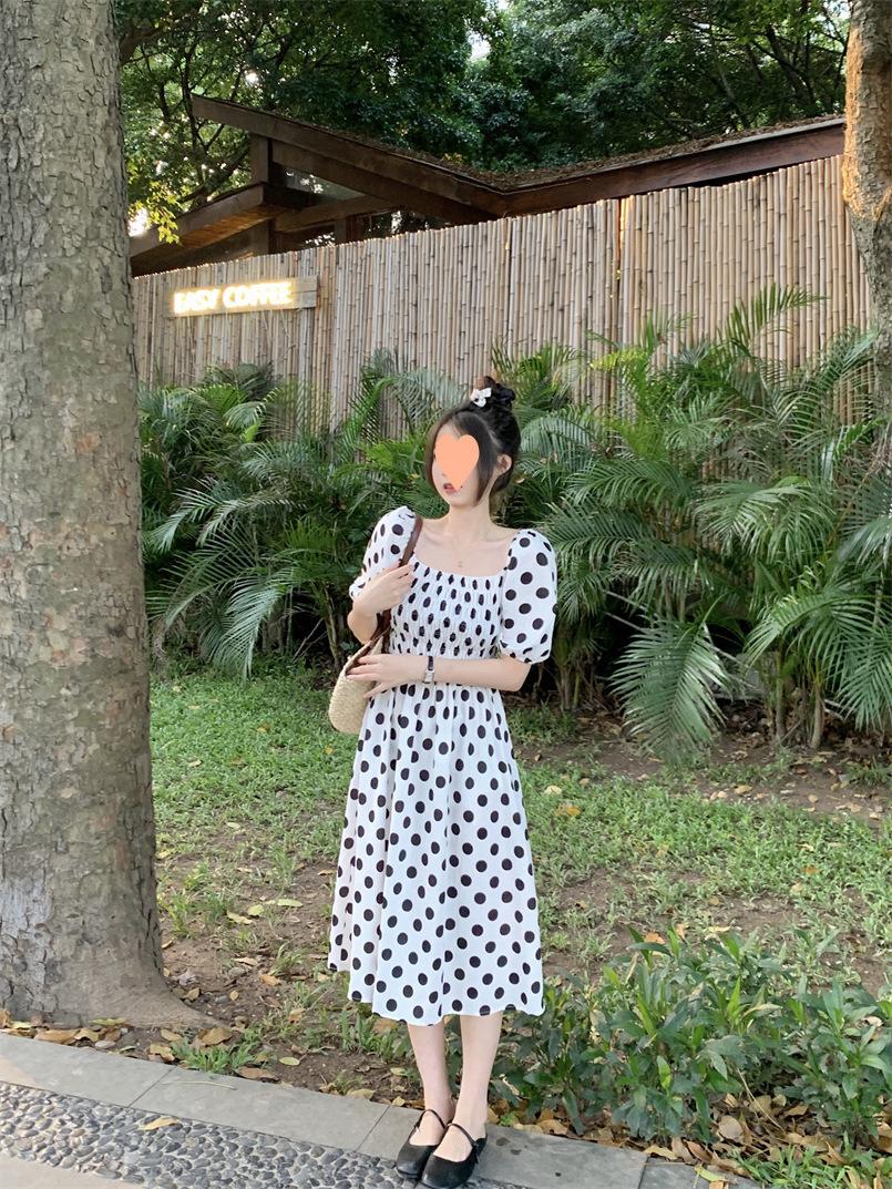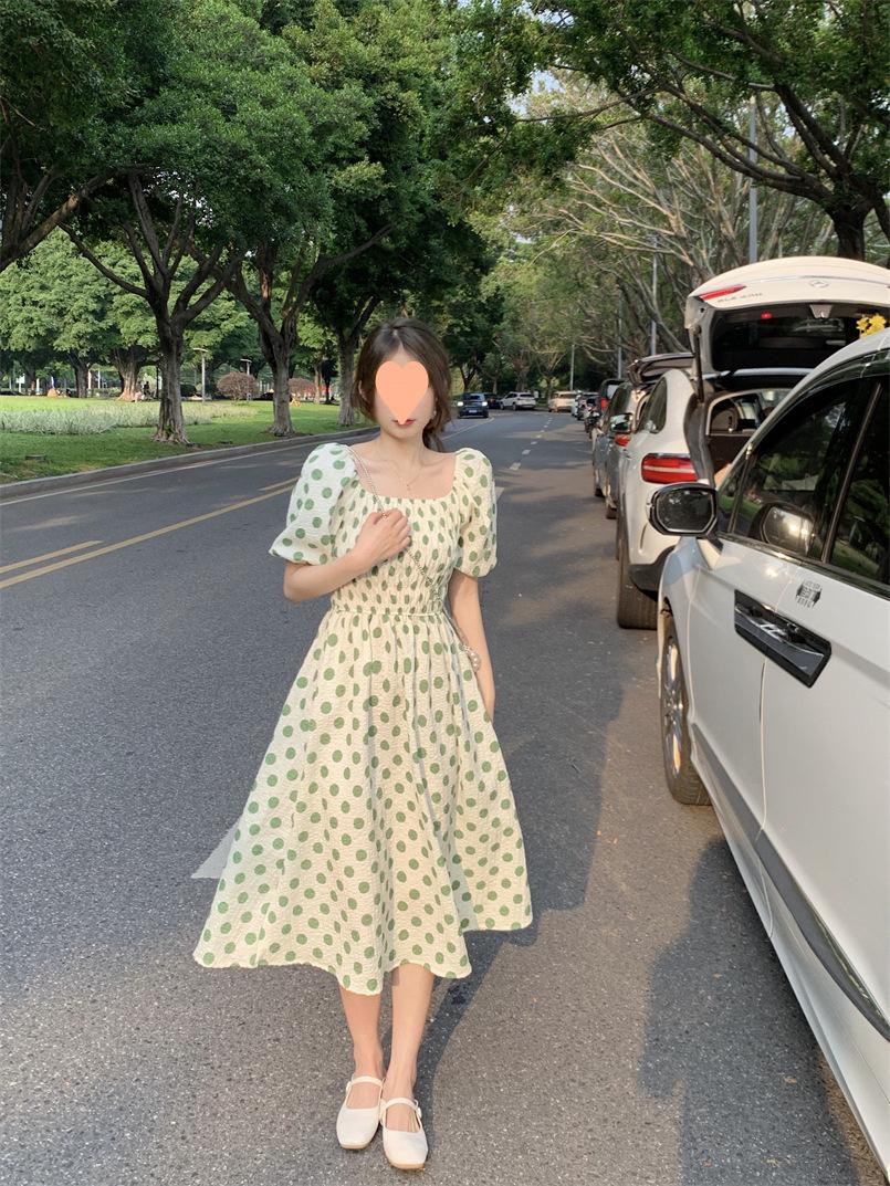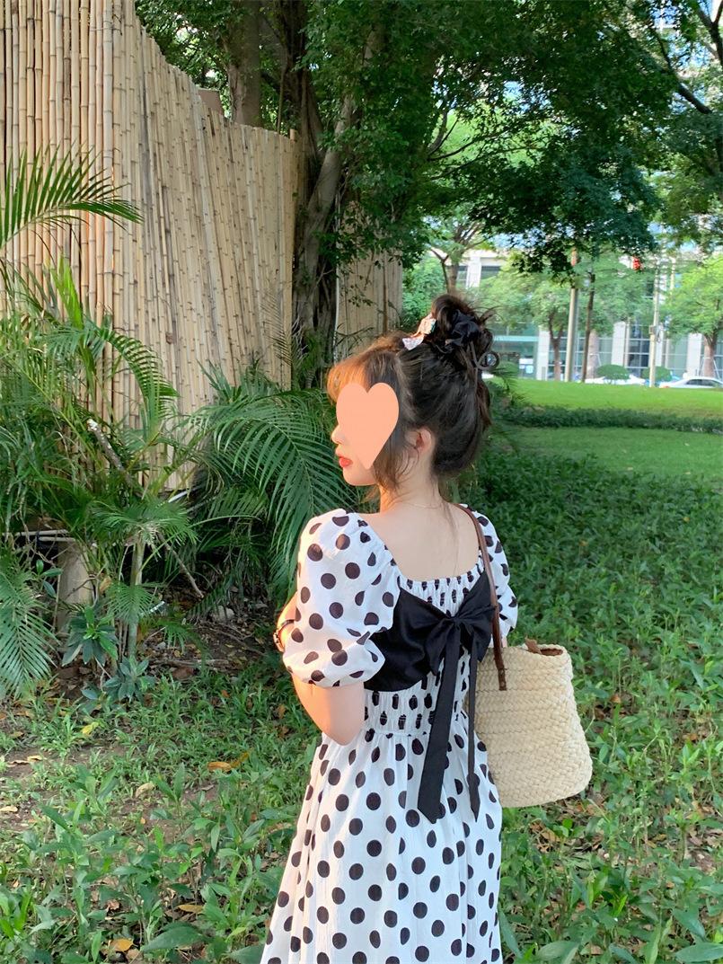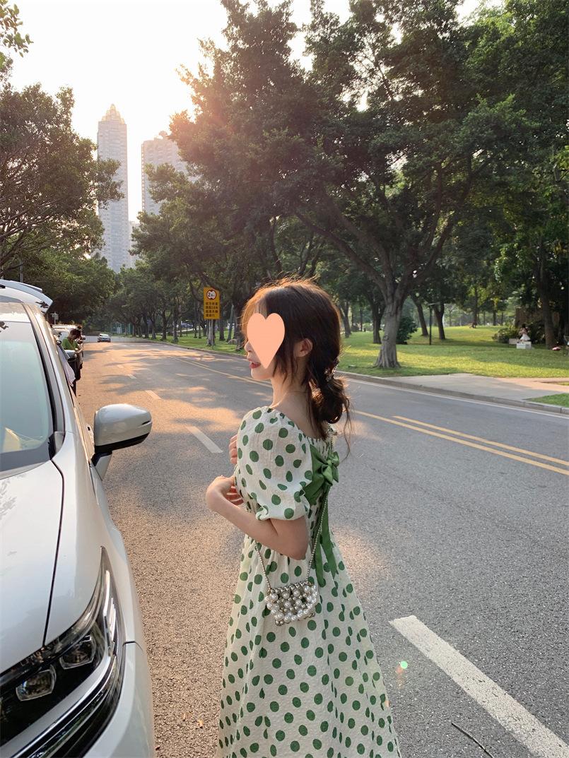 Vestido Novo 2025 Decote Quadrado Laço Bolinhas Verão Feminino Estilo Francês Delicado Cintura Saia Longa