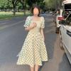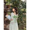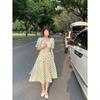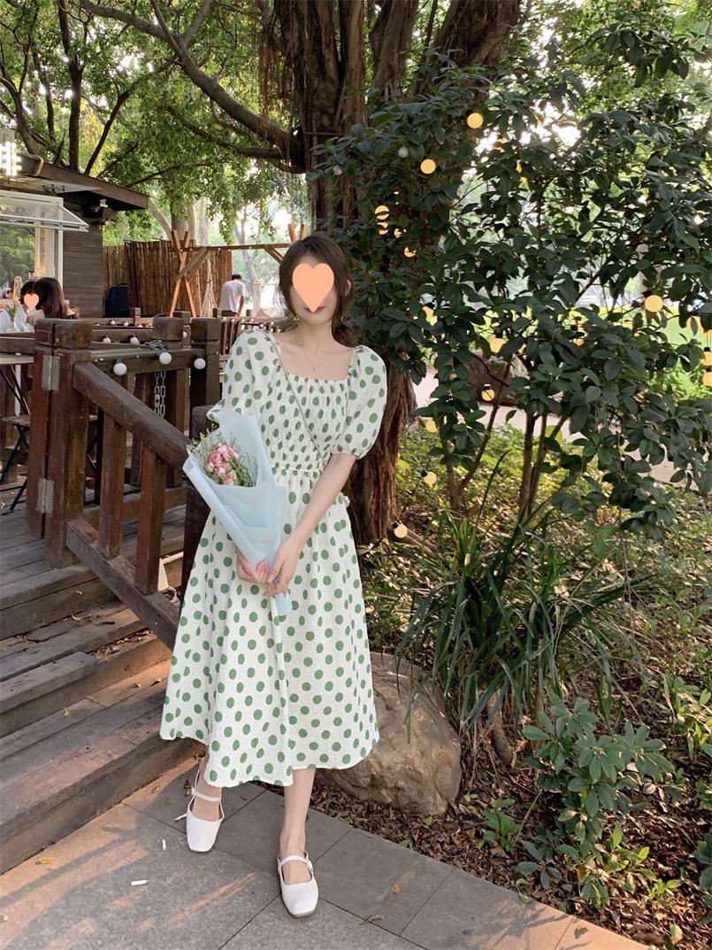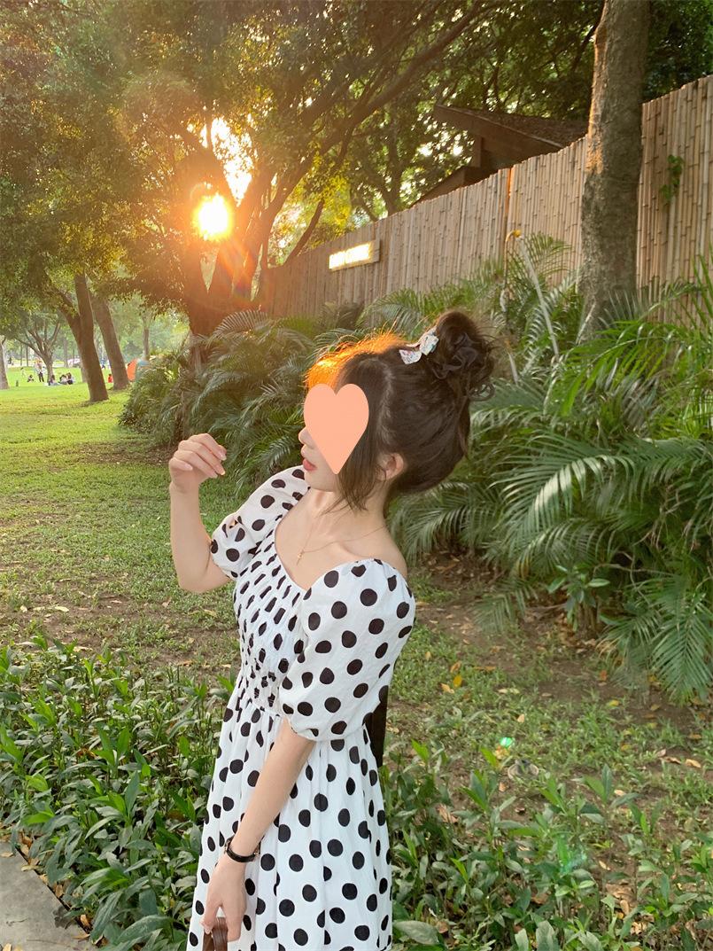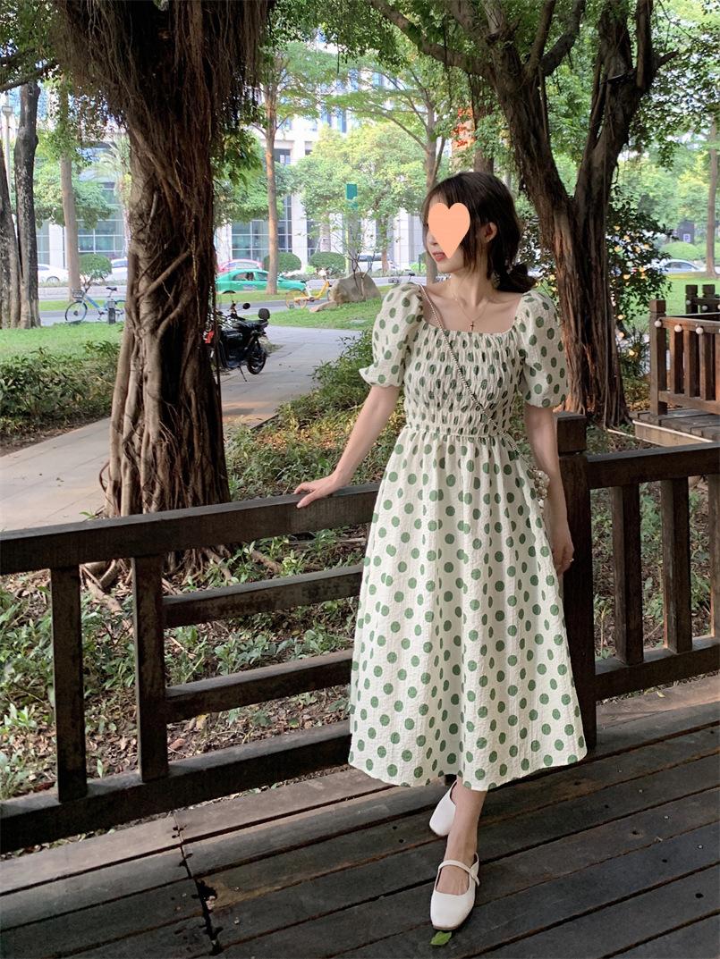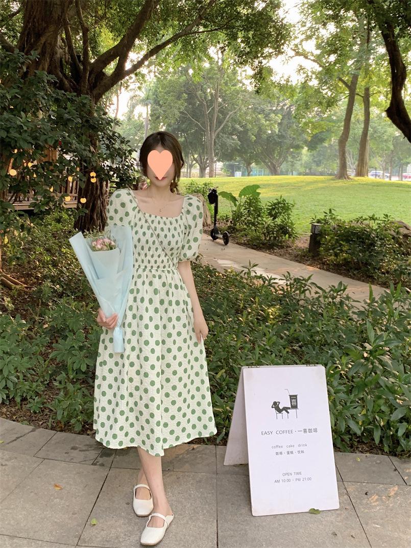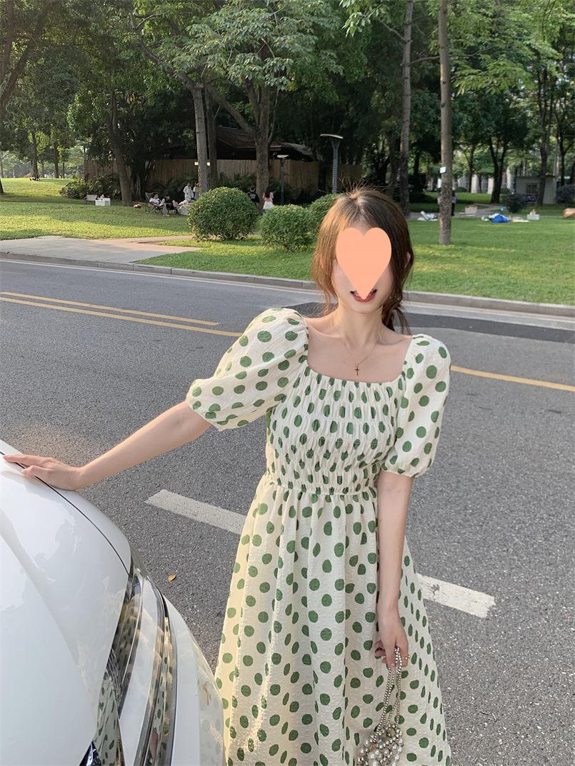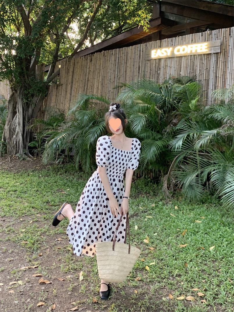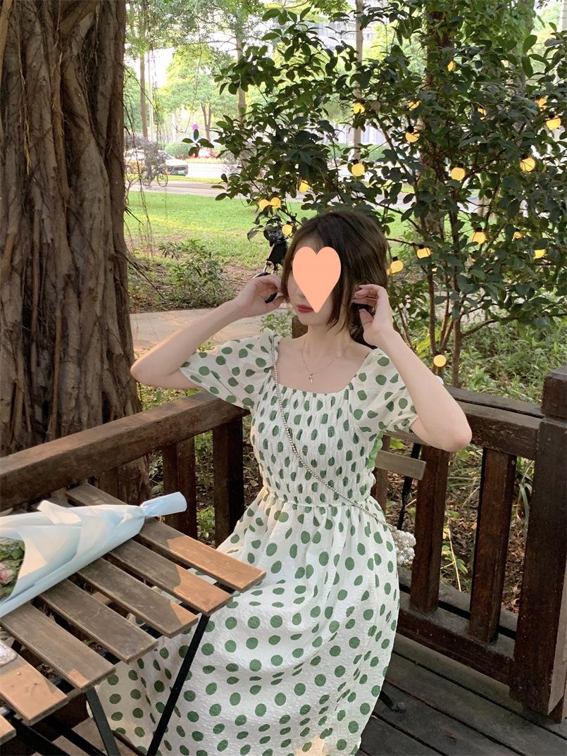 Vestido Novo 2025 Decote Quadrado Laço Bolinhas Verão Feminino Estilo Francês Delicado Cintura Saia Longa