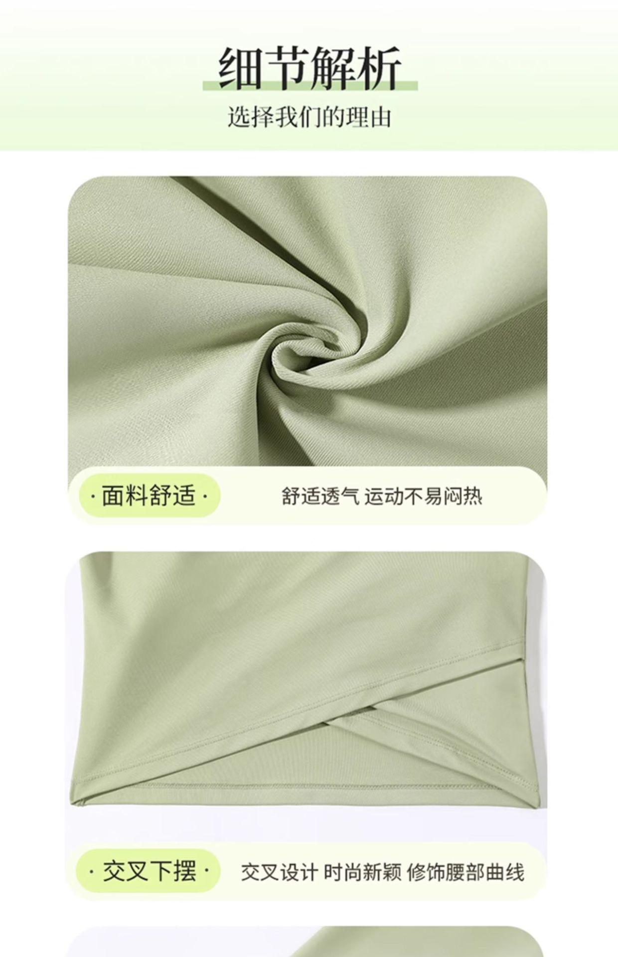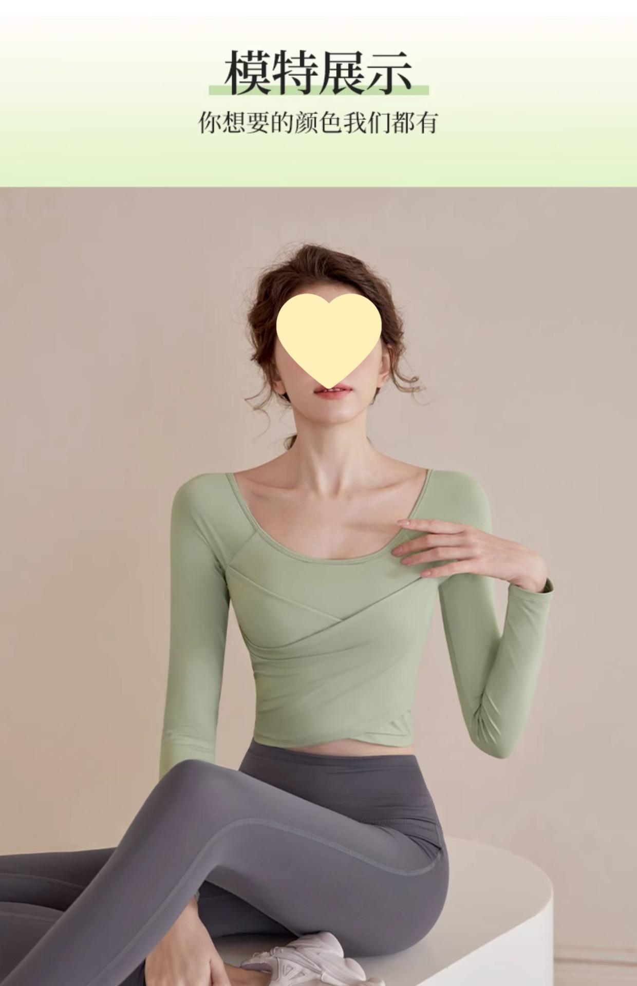 Green top, Yellow top, Purple top, Green top + gray yoga pants, Green top + black yoga pants, Yellow top + gra...