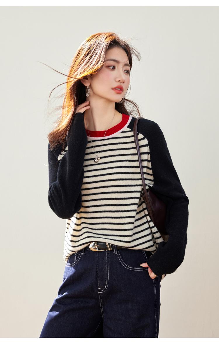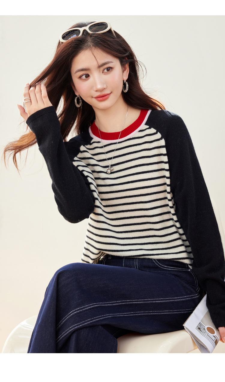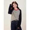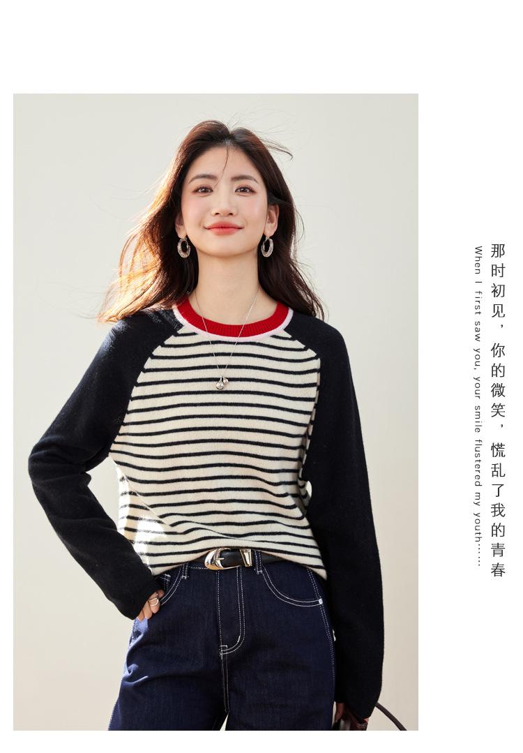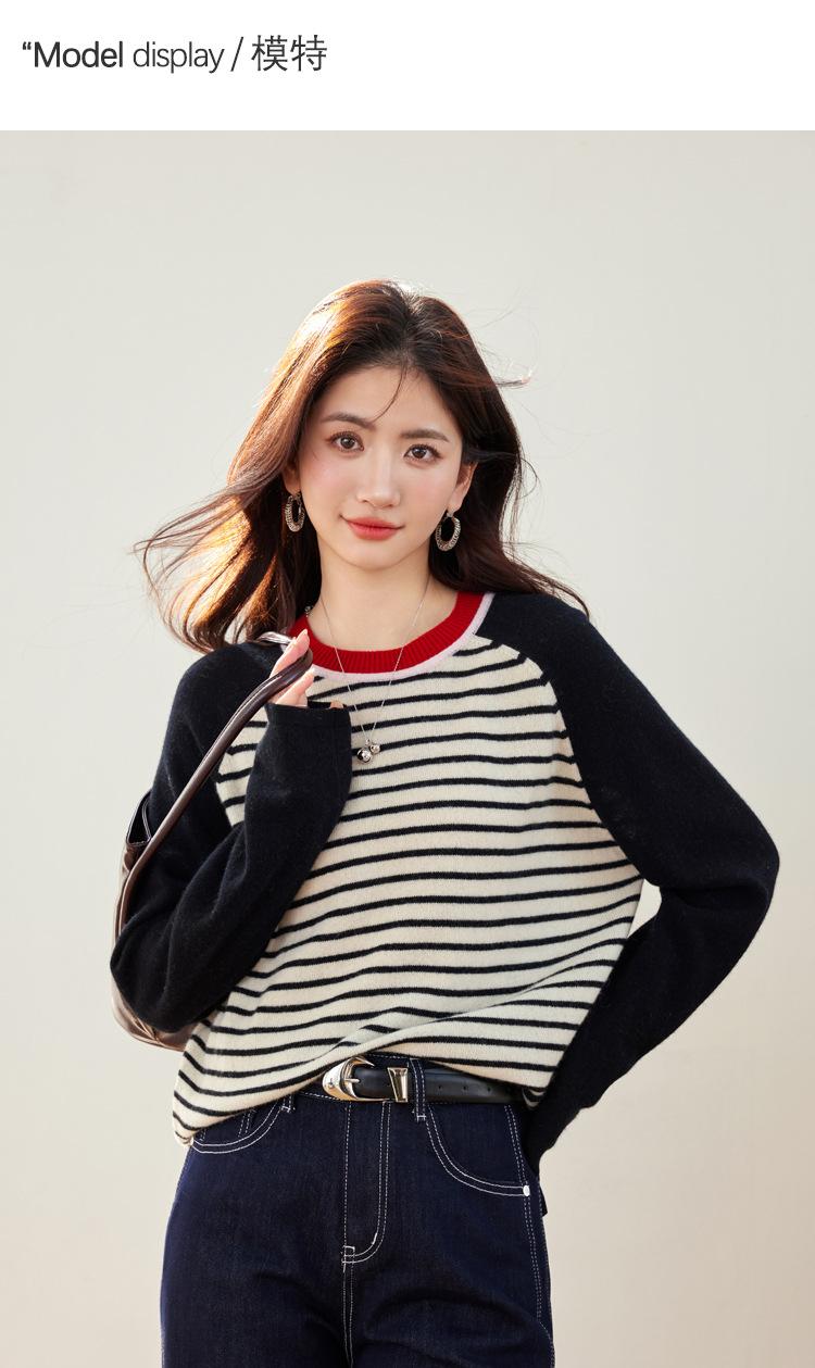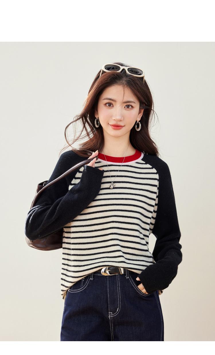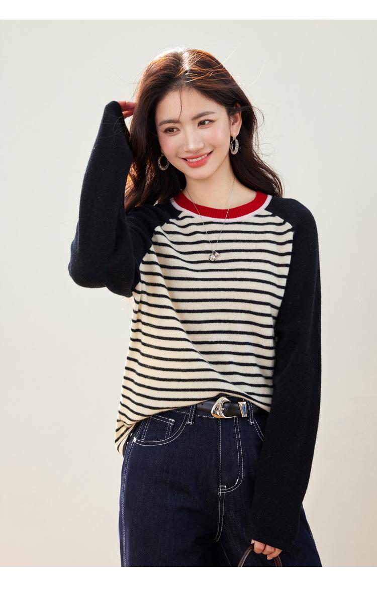 Outono 2025 Novo Estilo Coreano Casual Versátil Preguiçoso Listrado Solto Pulôver Bloco de Cores Gola Redonda Manga Longa Suéter Tricotado Feminino