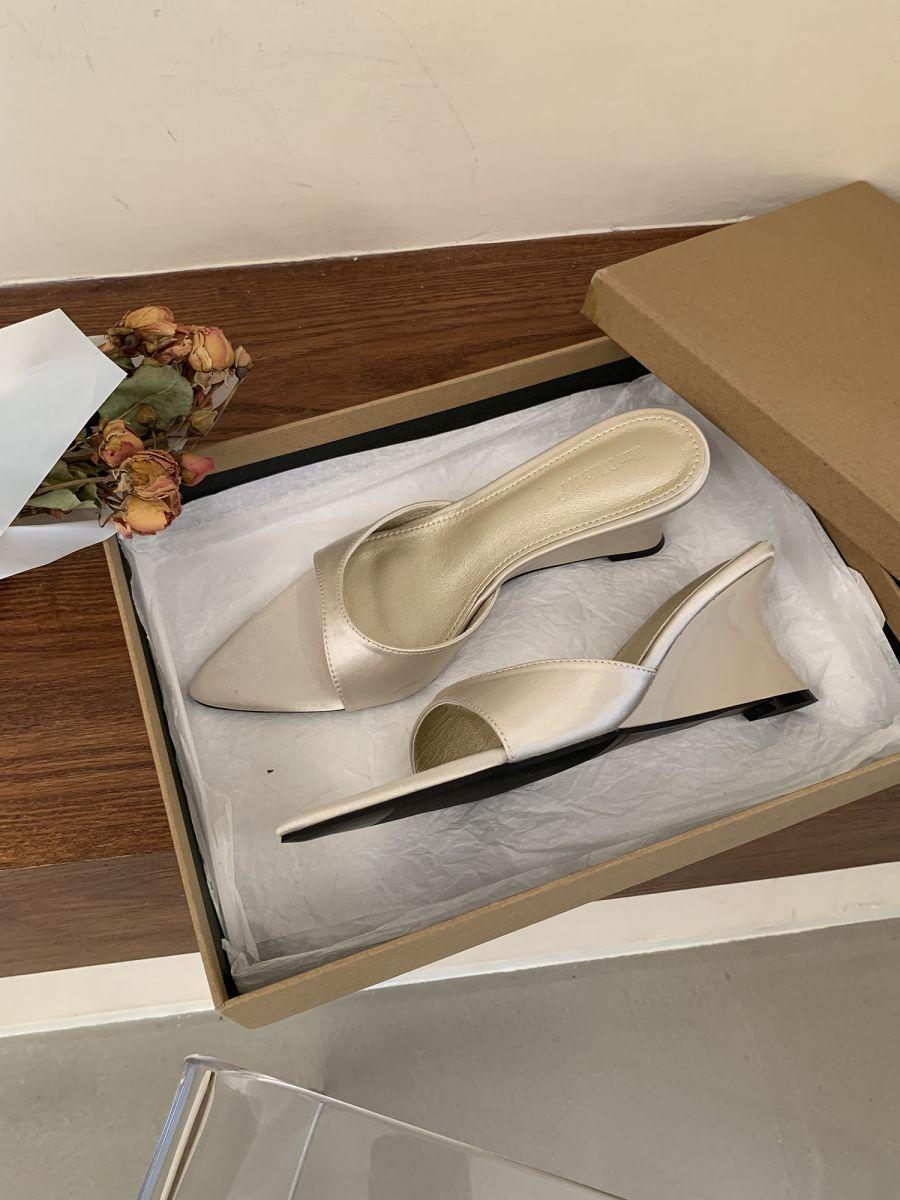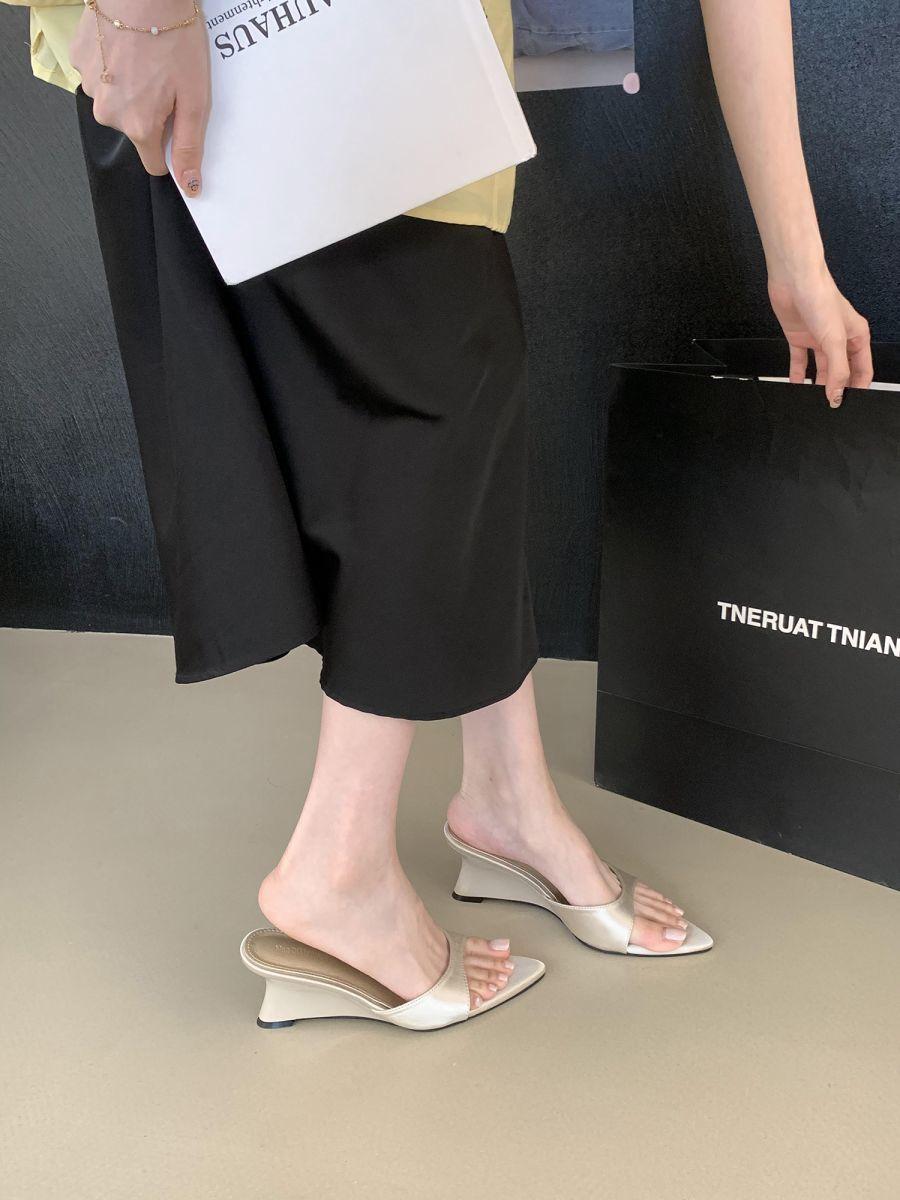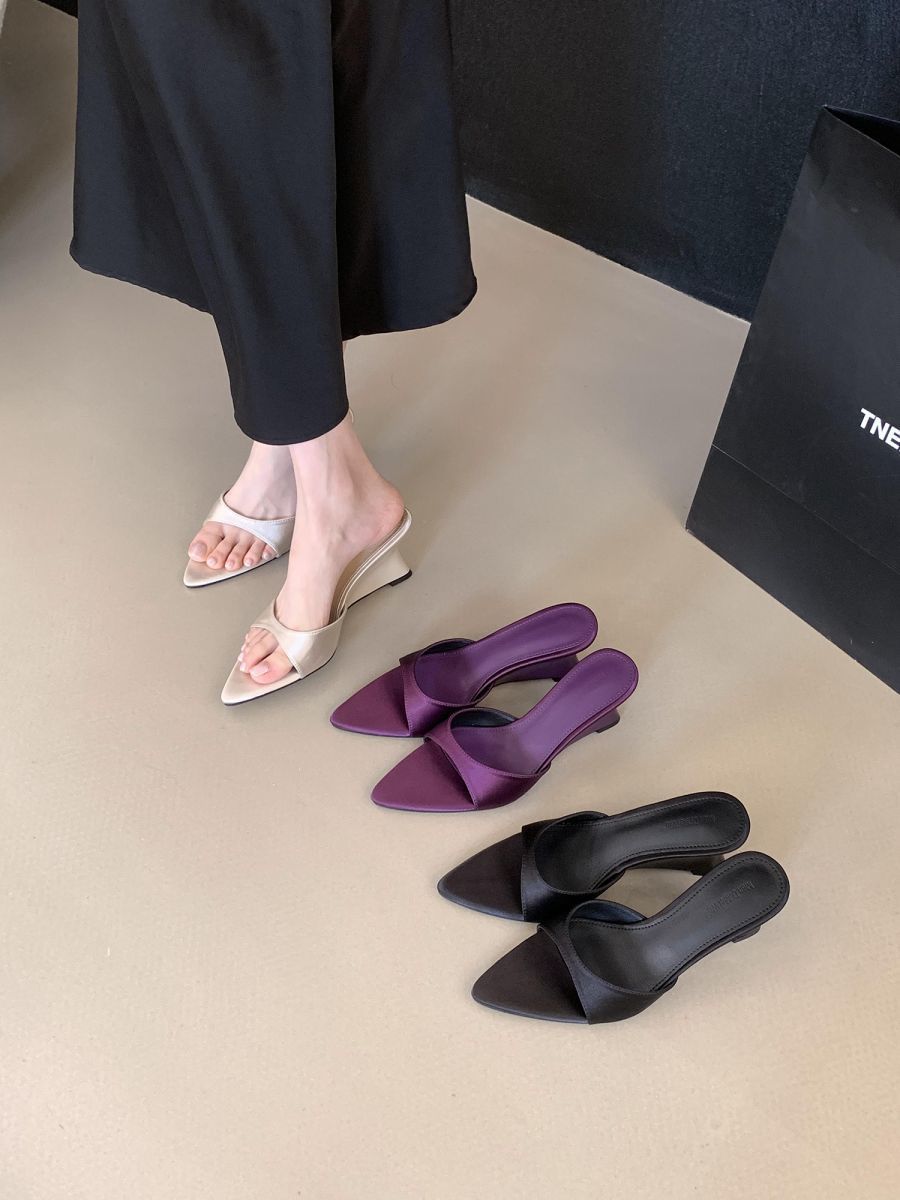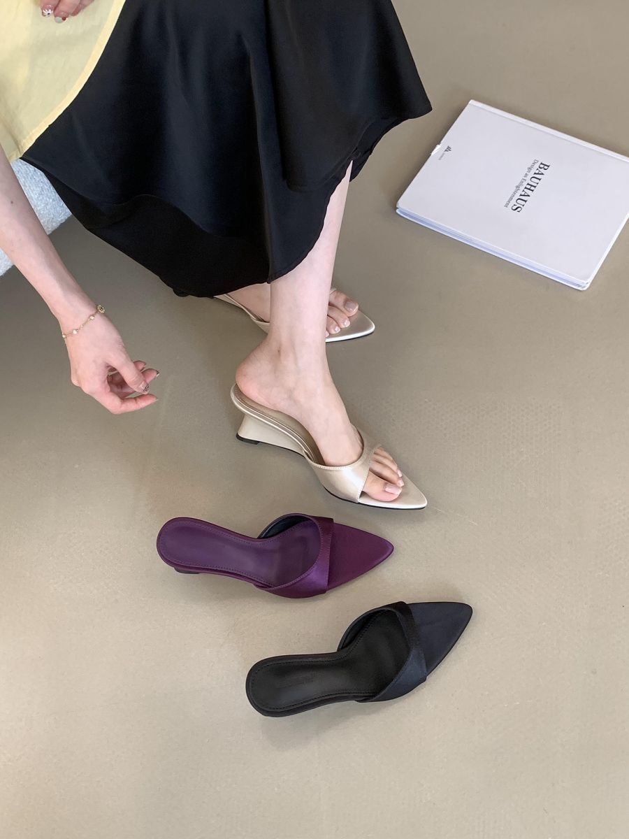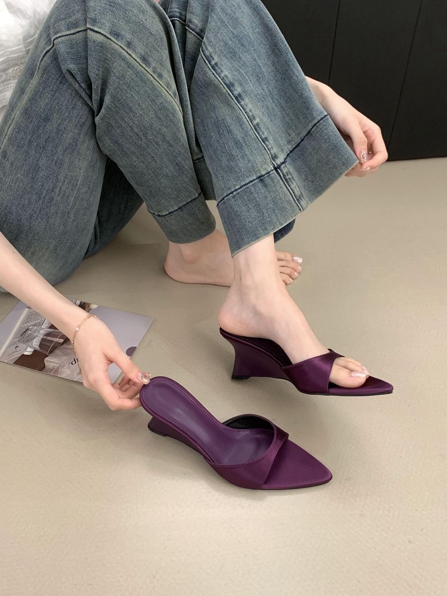 Chinelos de Salto Anabela de Bico Fino Sandálias Femininas 2025 Novos Chinelos Frescos de Verão Sapatos Femininos de Uma Tira Design de Nicho Saltos Altos