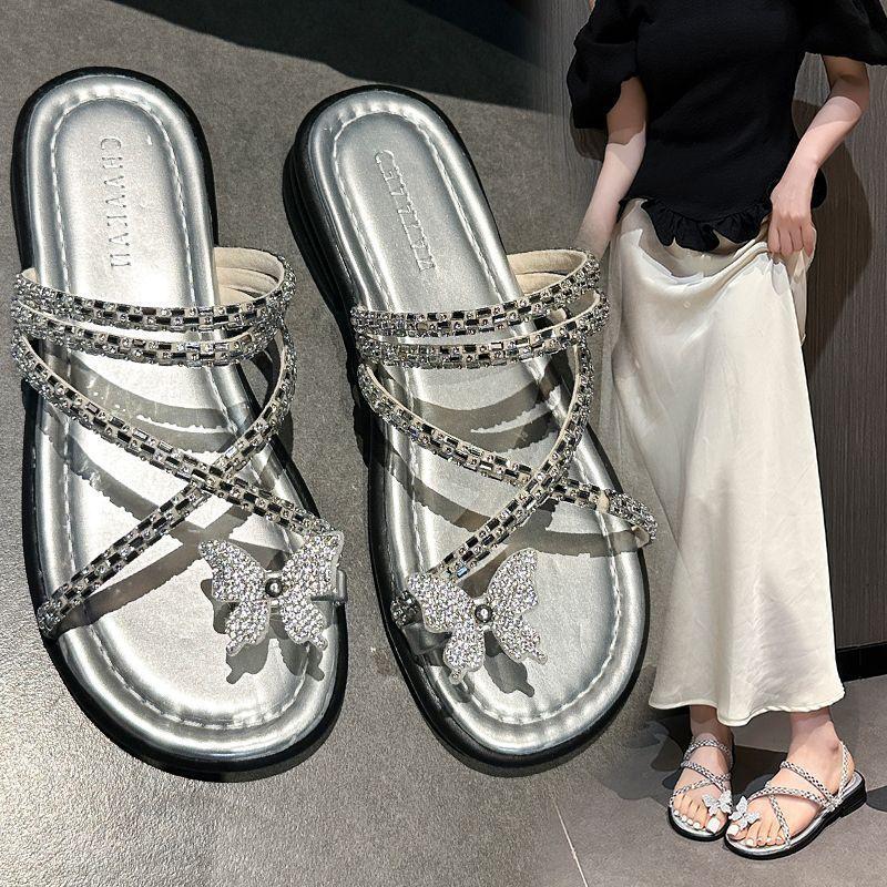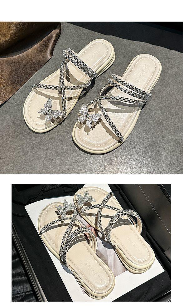 Exquisitas Pantuflas de Verano para Mujer 2025 Nuevas Planas de Pedrería Mariposa con Anillo para el Dedo del Pie Dos Formas de Uso Playa Pantuflas de Dama