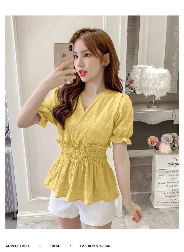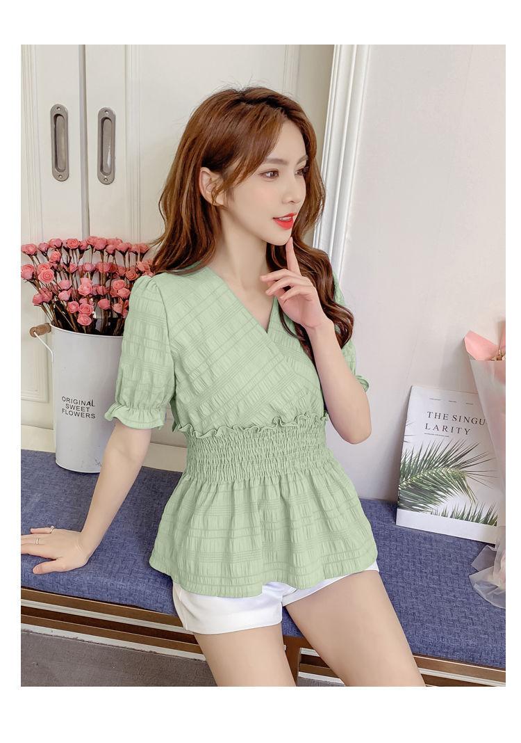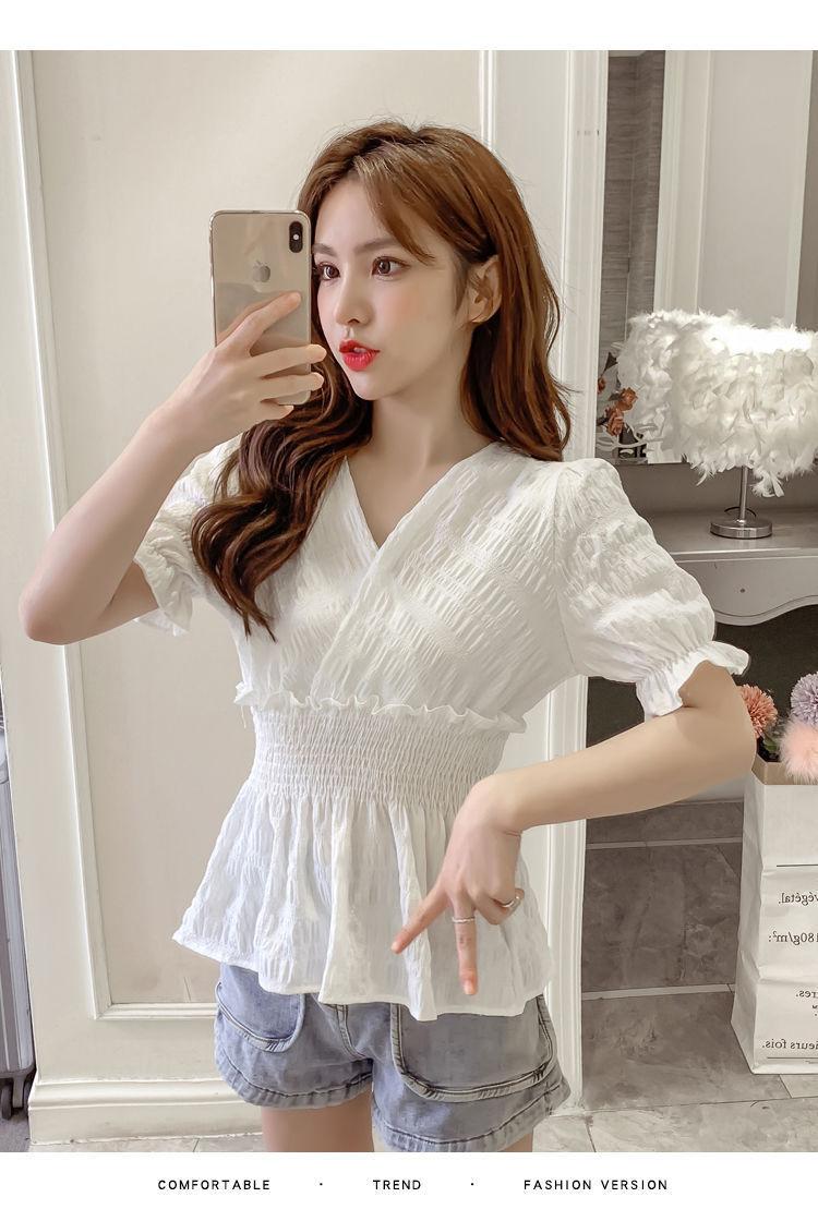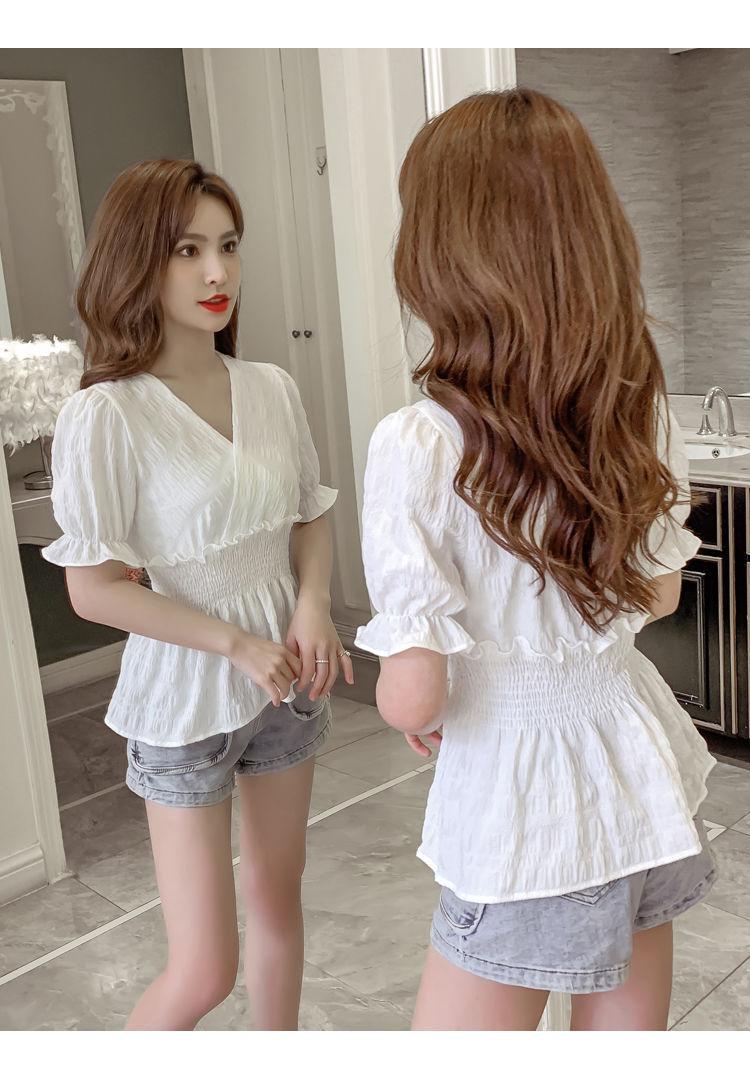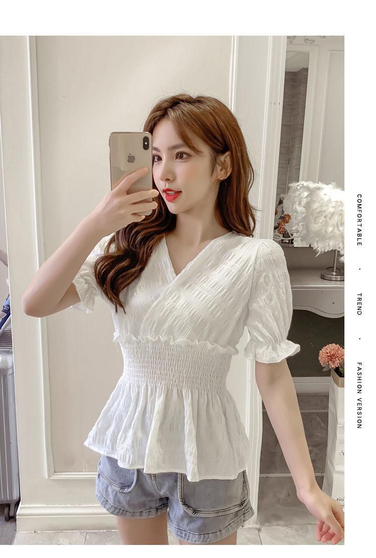 Camisa de Chiffon Feminina Manga Curta 2025 Verão Nova Decote V Cintura Babados Modelagem Slim Camisa Babydoll Top da Moda