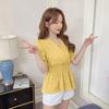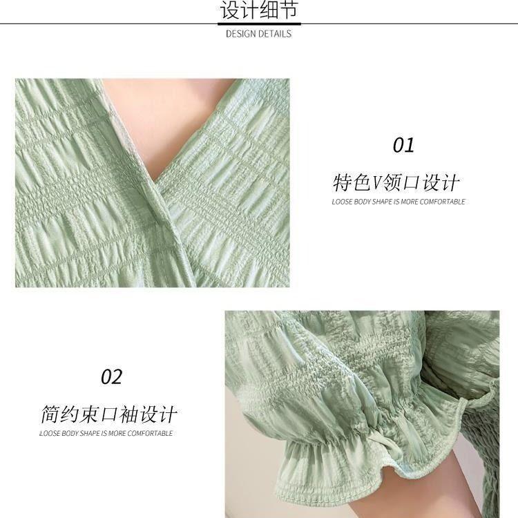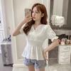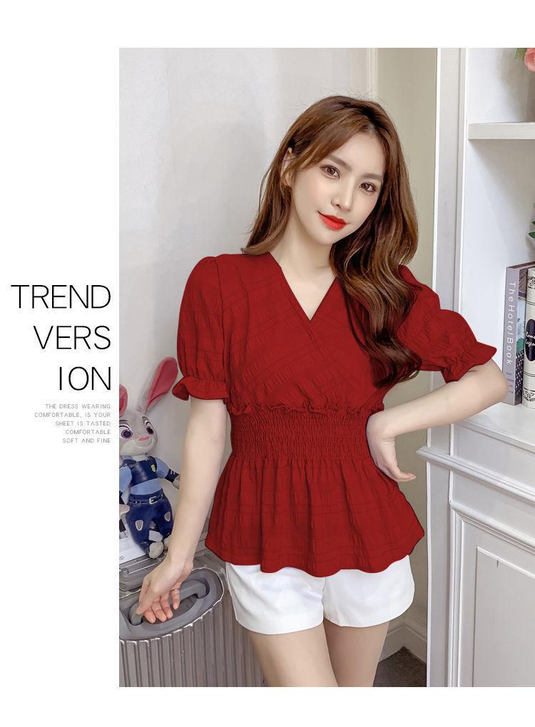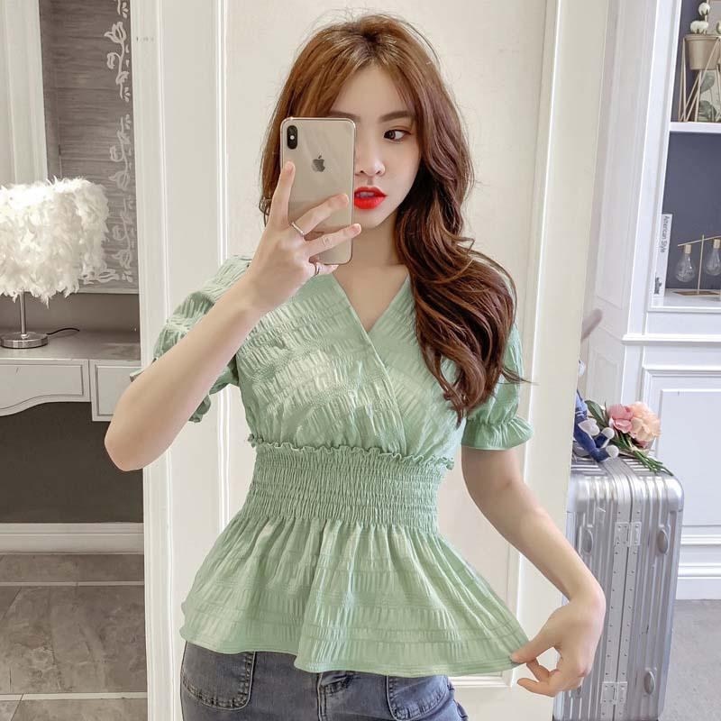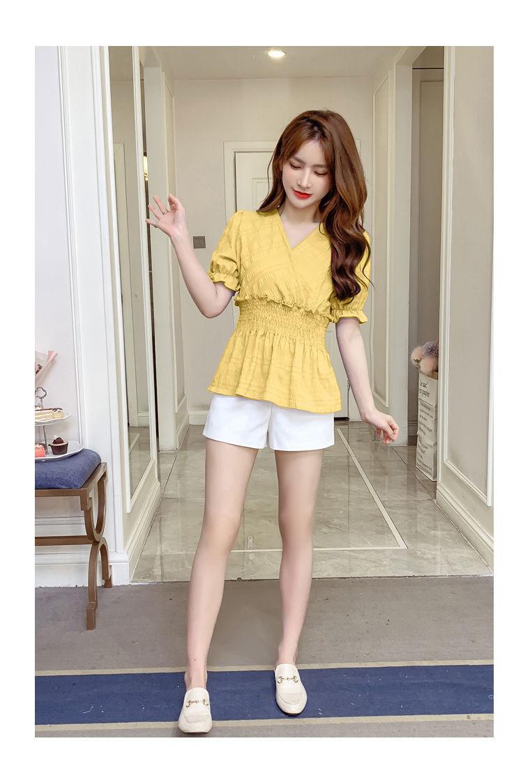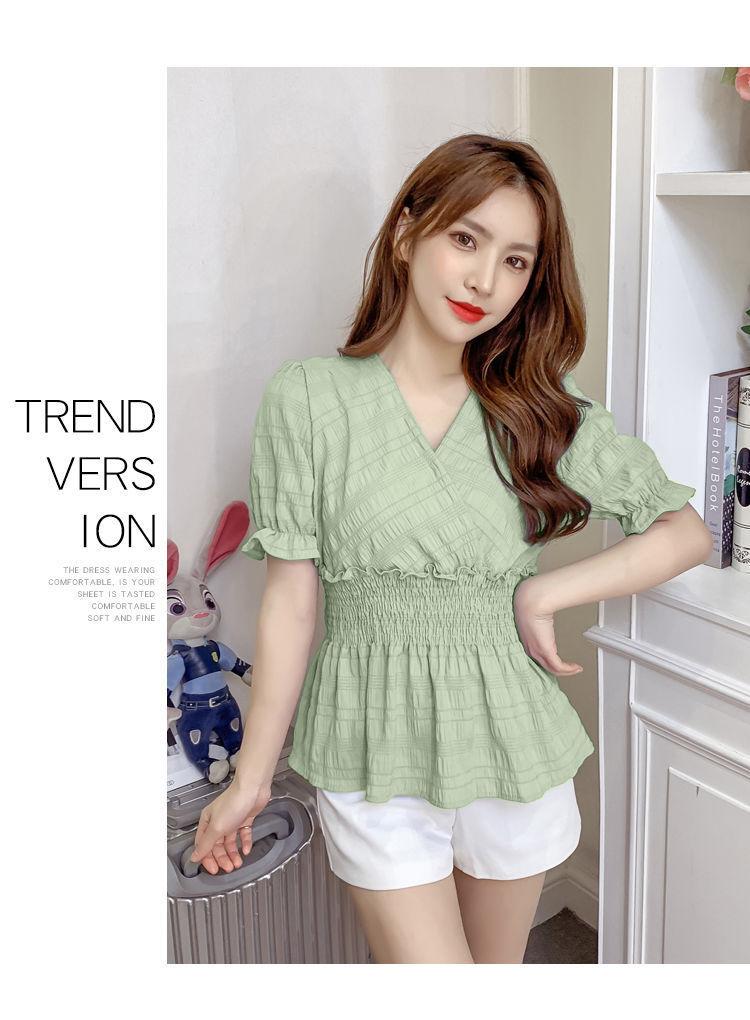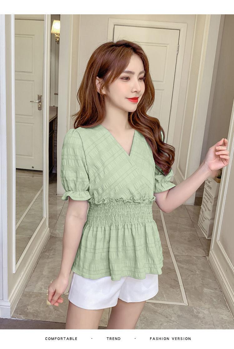 Camisa de Chiffon Feminina Manga Curta 2025 Verão Nova Decote V Cintura Babados Modelagem Slim Camisa Babydoll Top da Moda