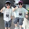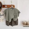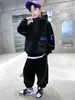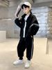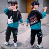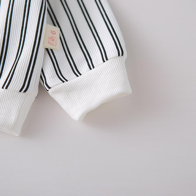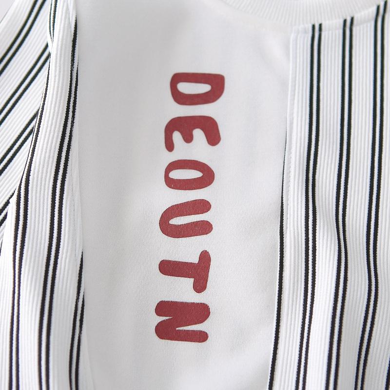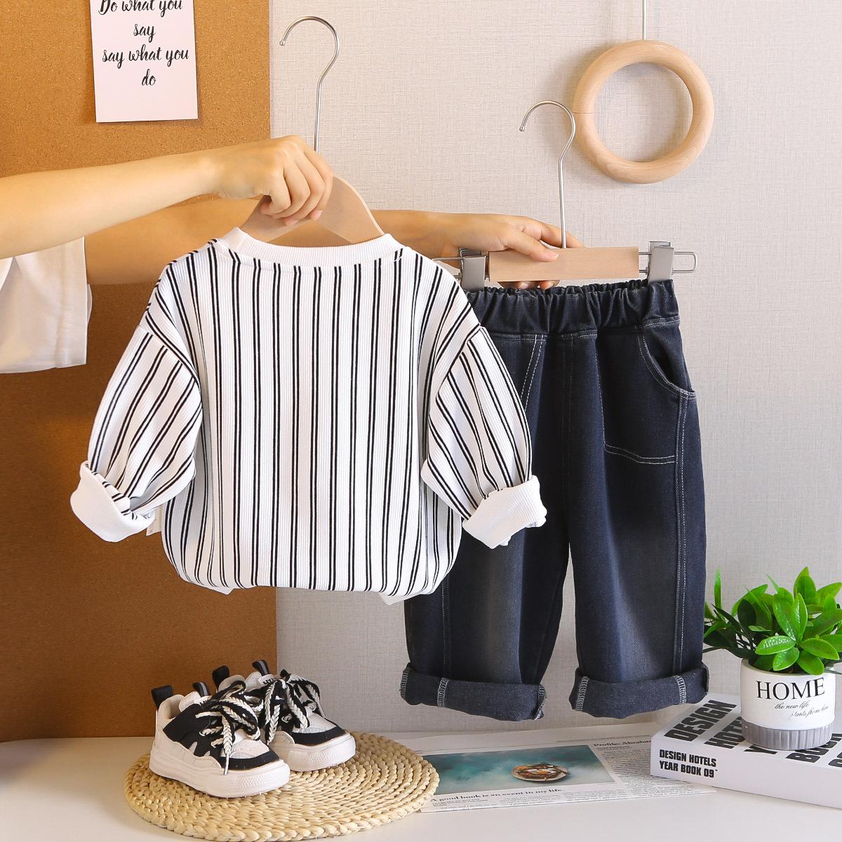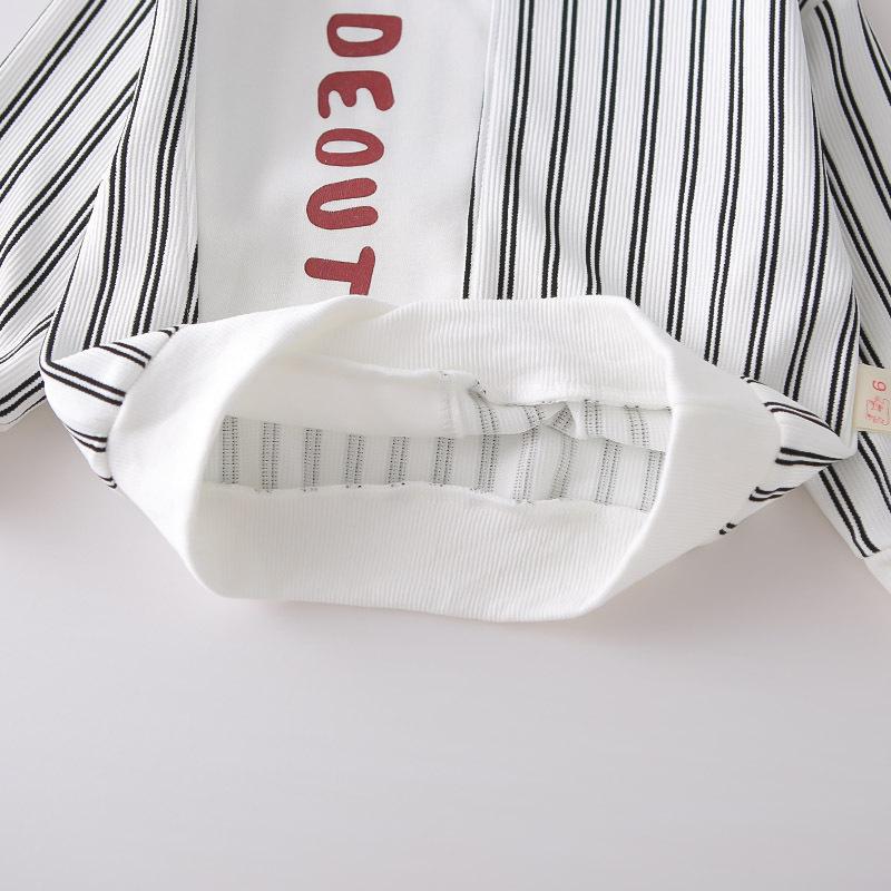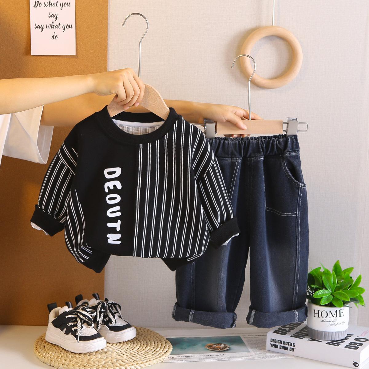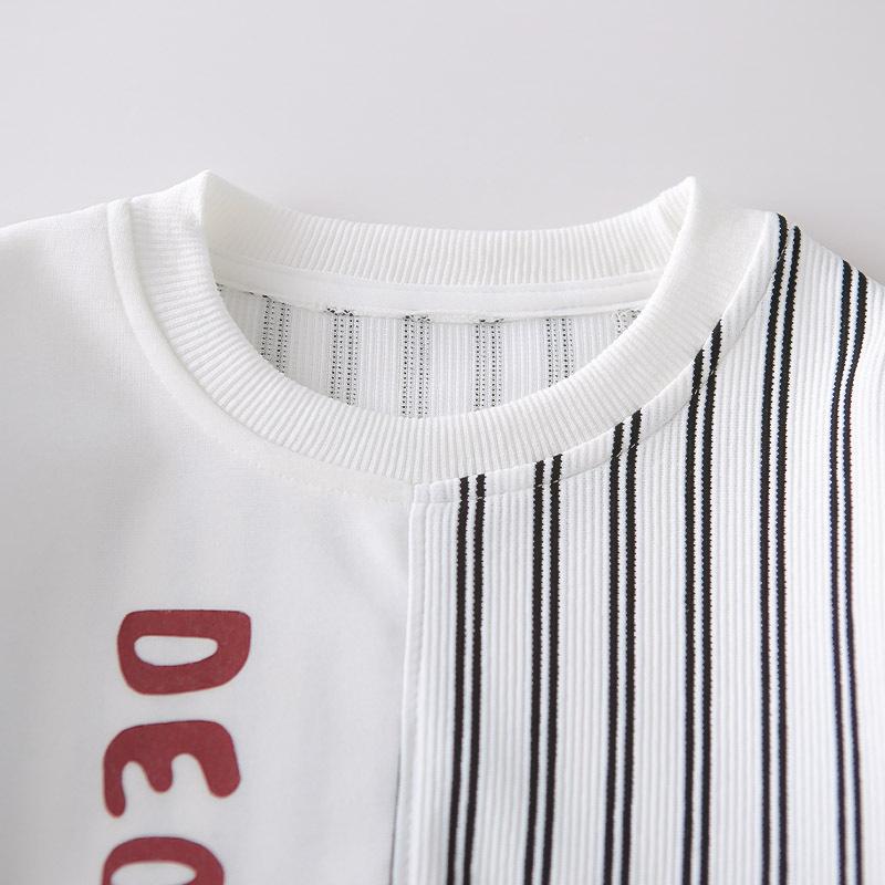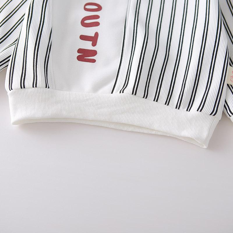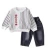 Roupa Infantil Meninos Moletons Primavera & Outono 2025 Novo Conjunto Infantil de Duas Peças Infantil Bonito com Patchwork de Listras Verticais em Inglês