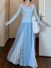 Novo Design Coreano Saia Azul Xadrez com Renda Emendada Cintura Alta Slim Saia Longa Saia A-Line