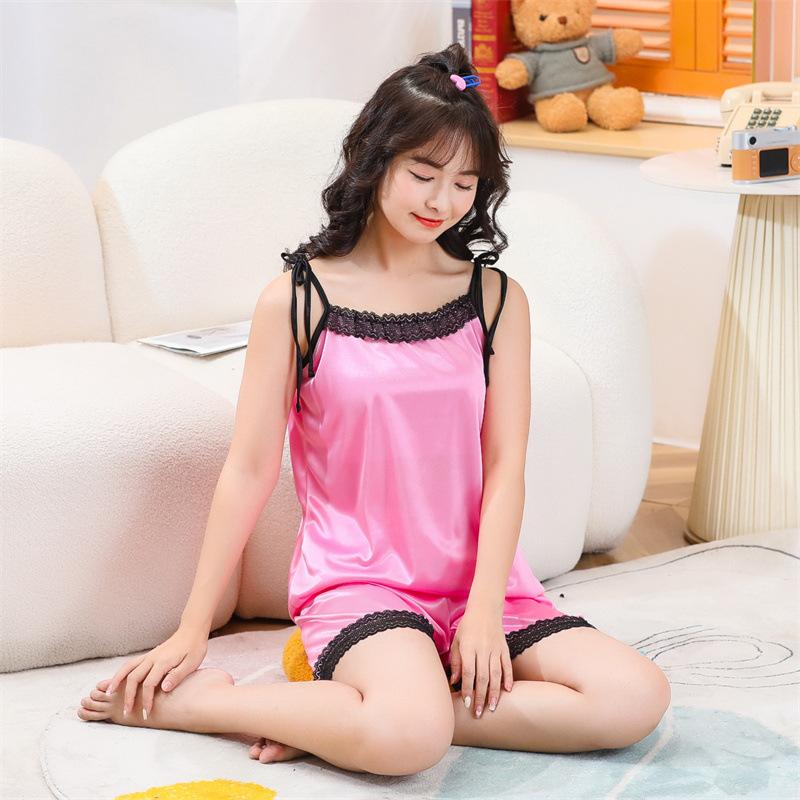 Pijama Feminina Verão Fina Alça Shorts Pijama Seda Gelo Sexy Casual Conjunto Roupa de Casa Floral Feminina Atacado