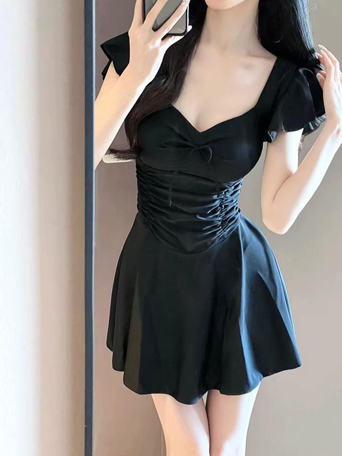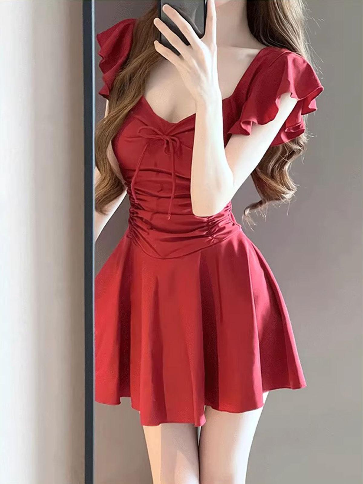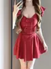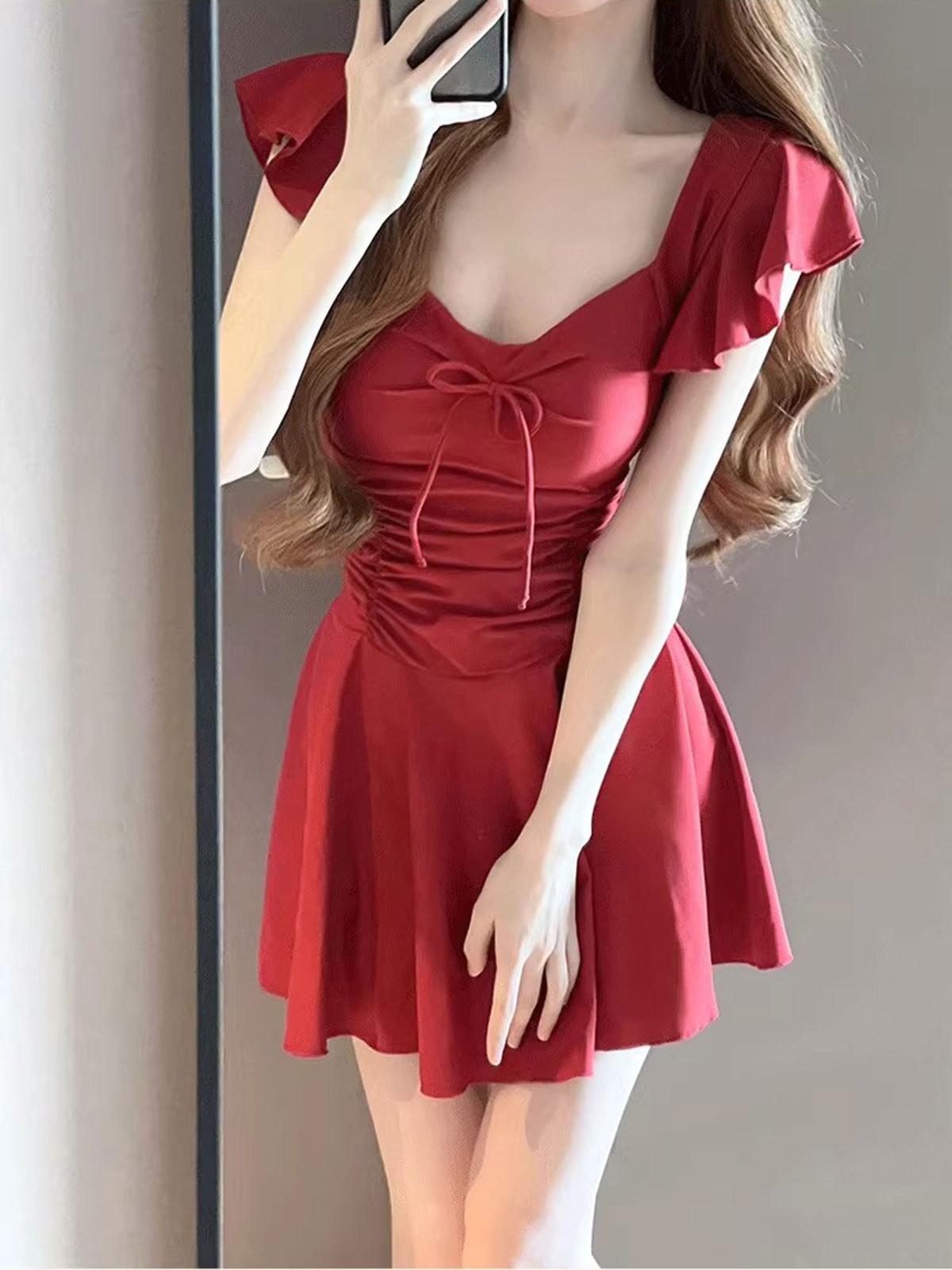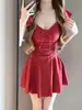 2025 Nova Chegada Fato de Banho de Águas Termais Feminino Emagrecedor Conservador Cobrindo a Barriga Saia Vermelho Retrô Pequeno Busto Levanta Fato de Banho de Férias