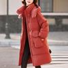 Casaco novo de algodão com penugem estilo europeu 2024 para mulheres, comprimento médio, inverno, grosso, com capuz, moderno, estilo coreano, casual, longo