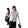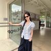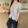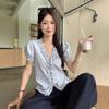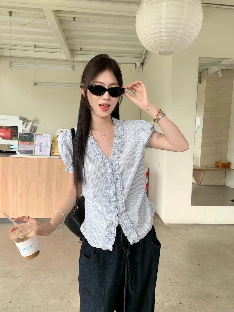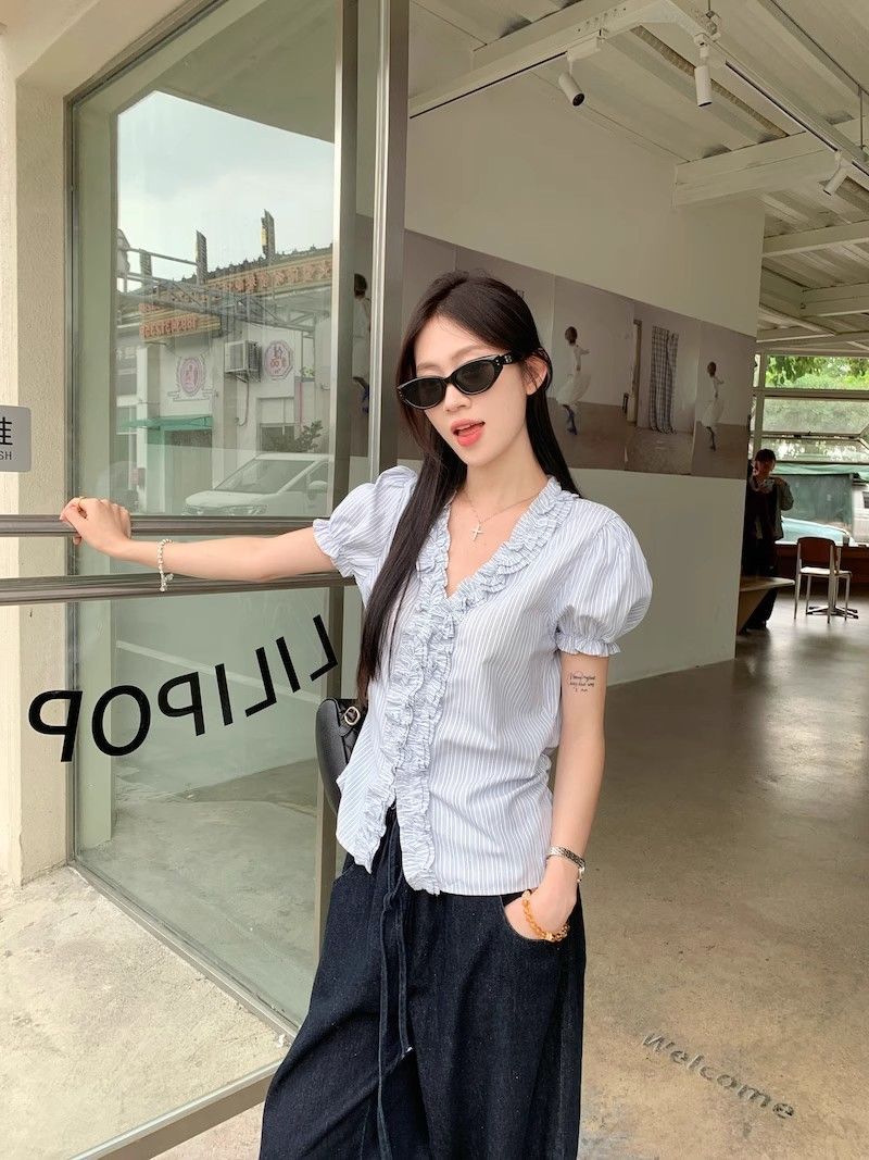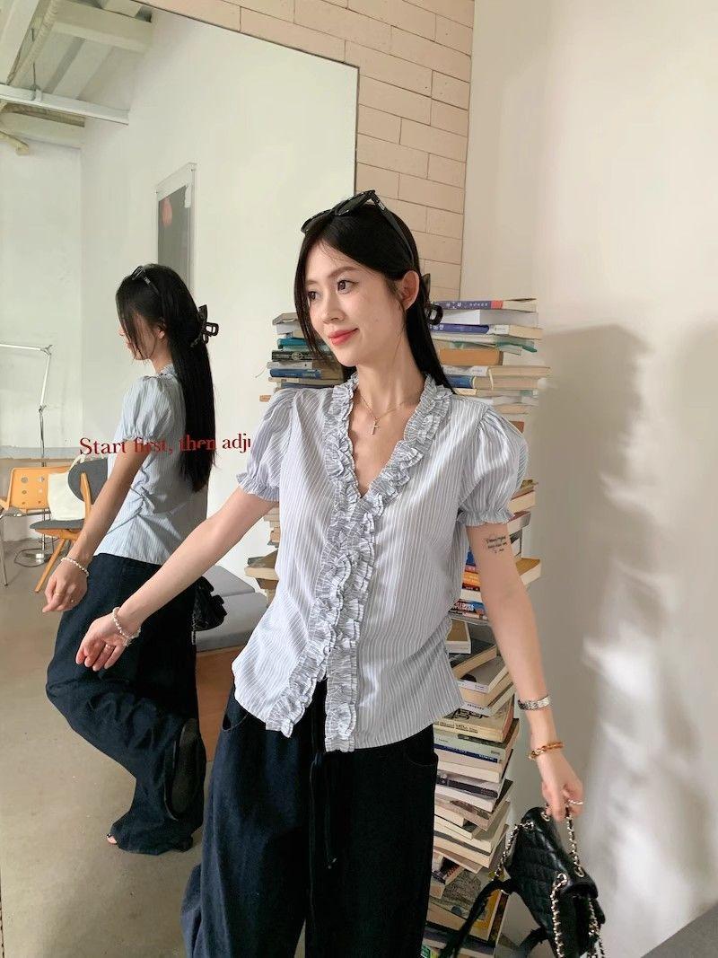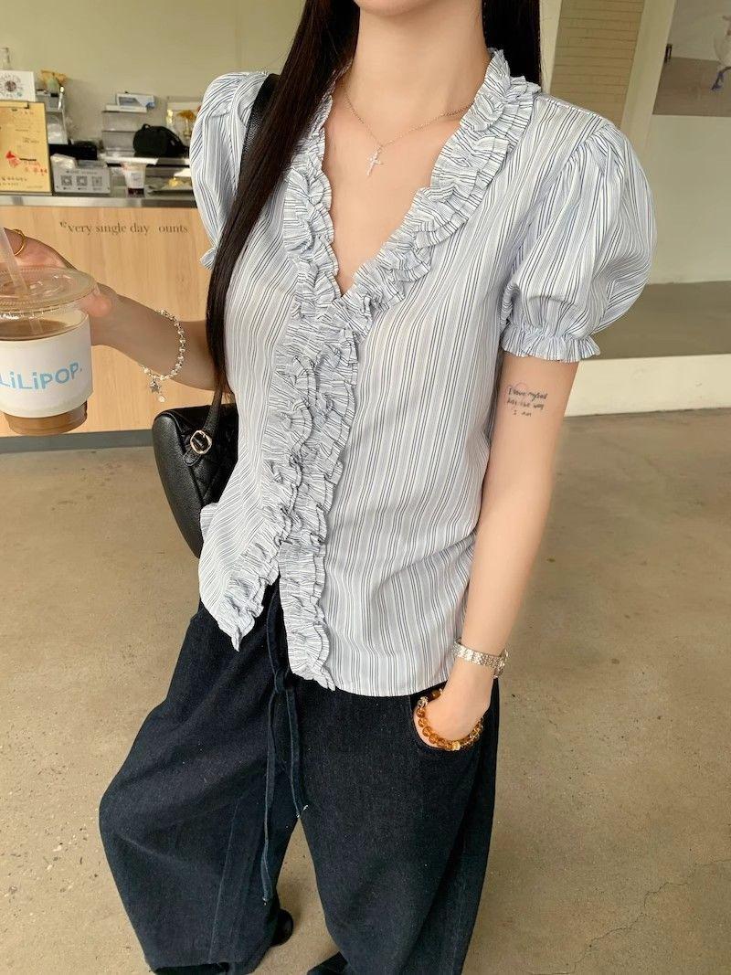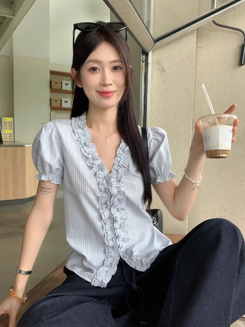 Design Sense Azul Babado Listrado Manga Bufante Feminino Verão Nicho Redutor de Idade Decote V Cintura Ajustada Manga Curta Top Doce e Apimentado