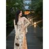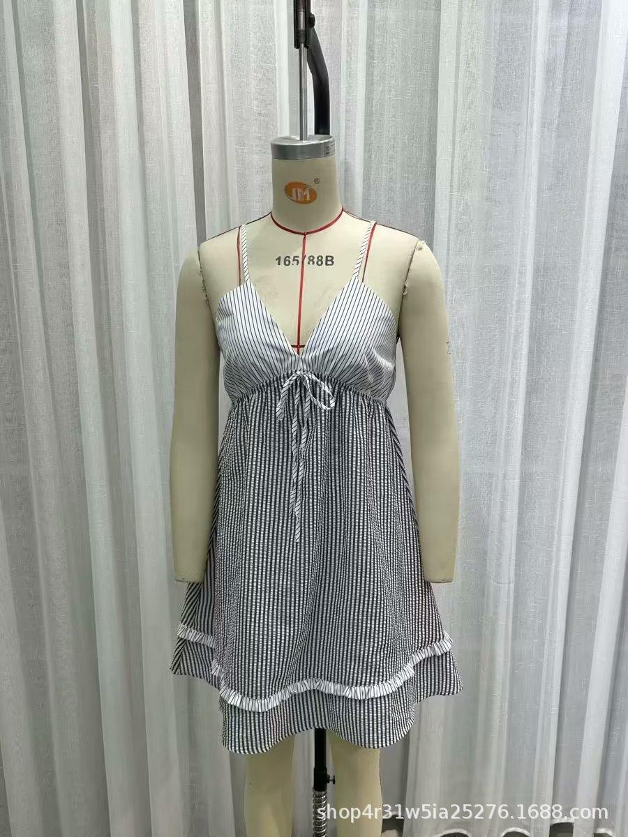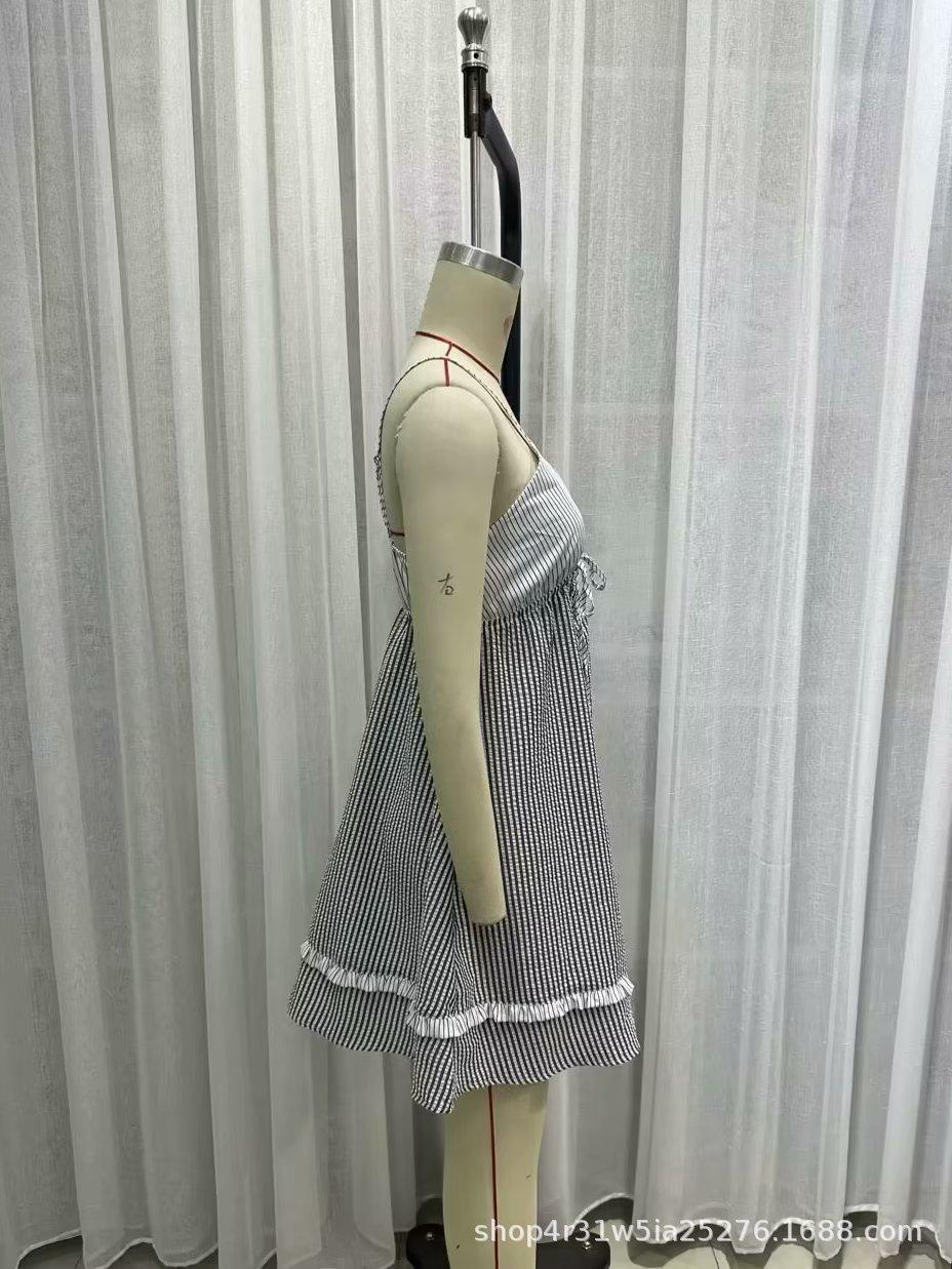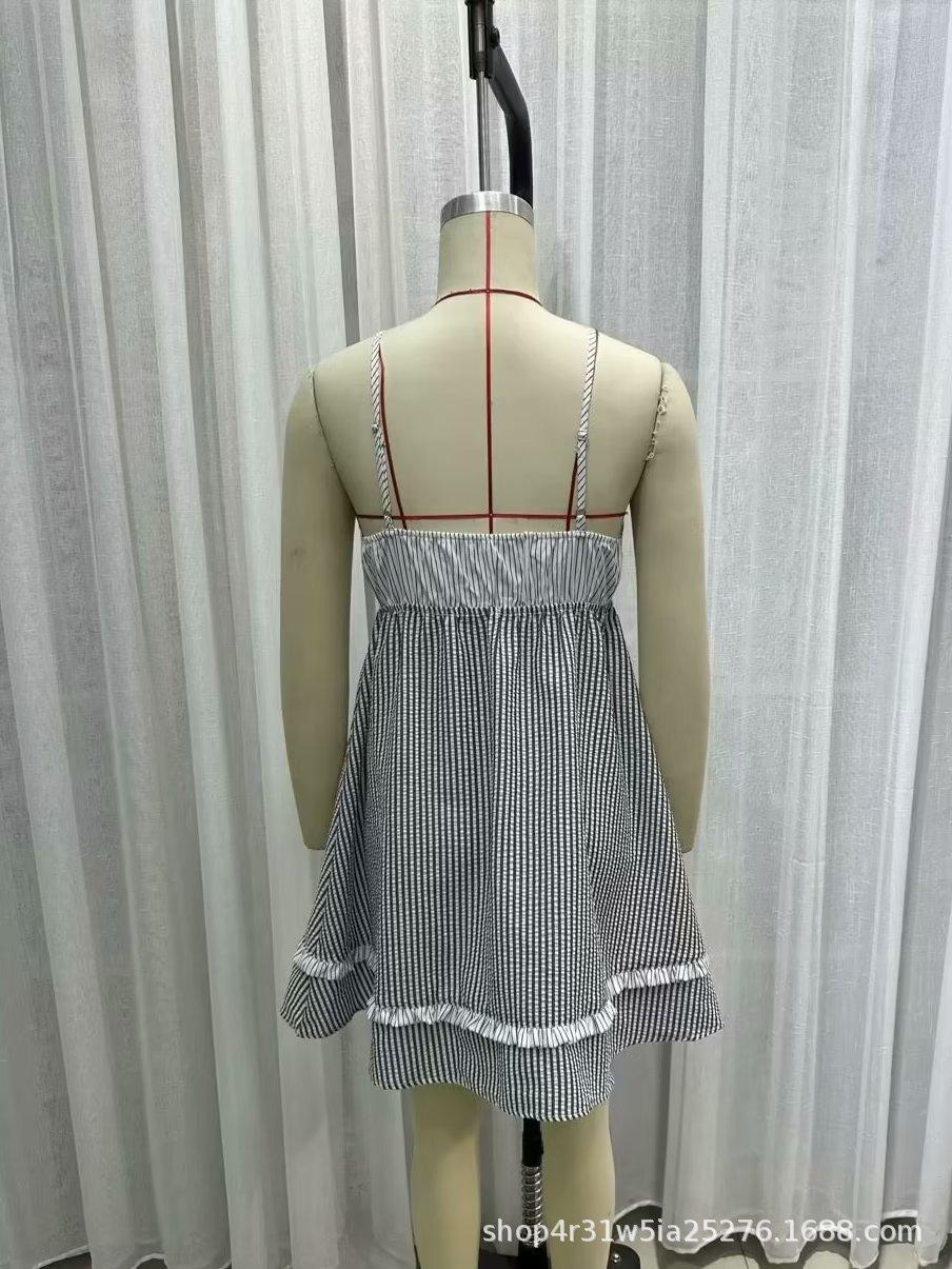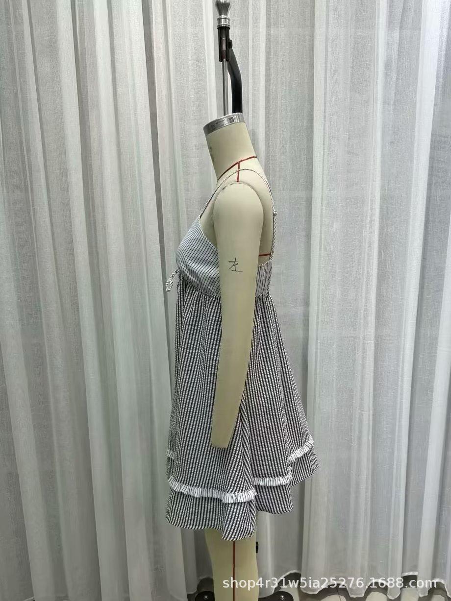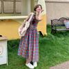 Europeu e Americano 2023 Verão Novo Vestido de Alça Xadrez com Renda Retrô Francesa
