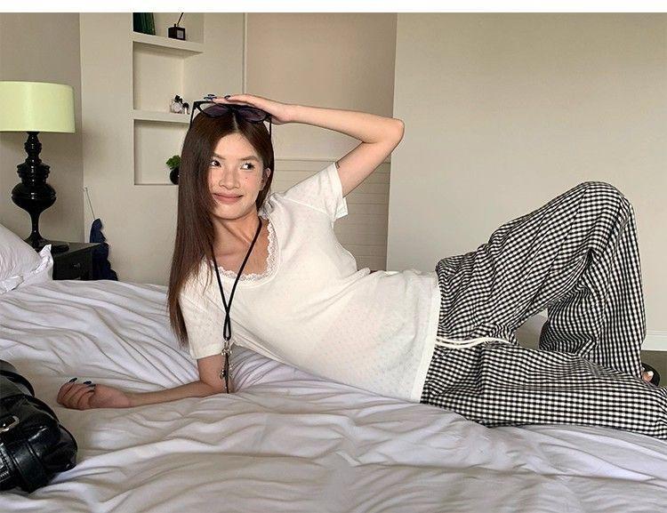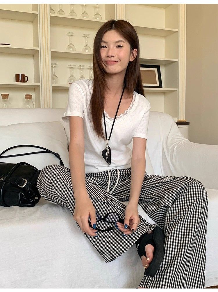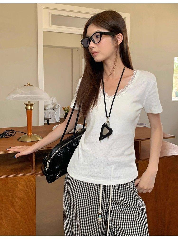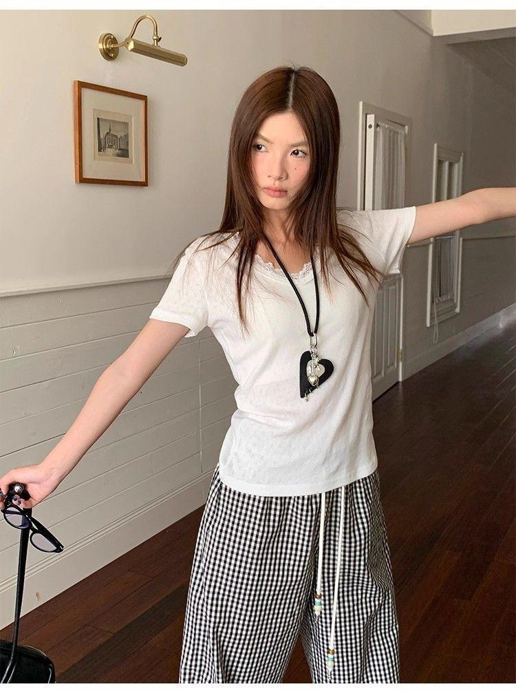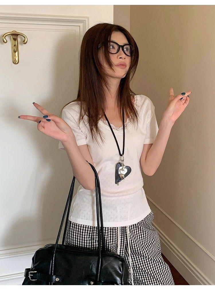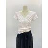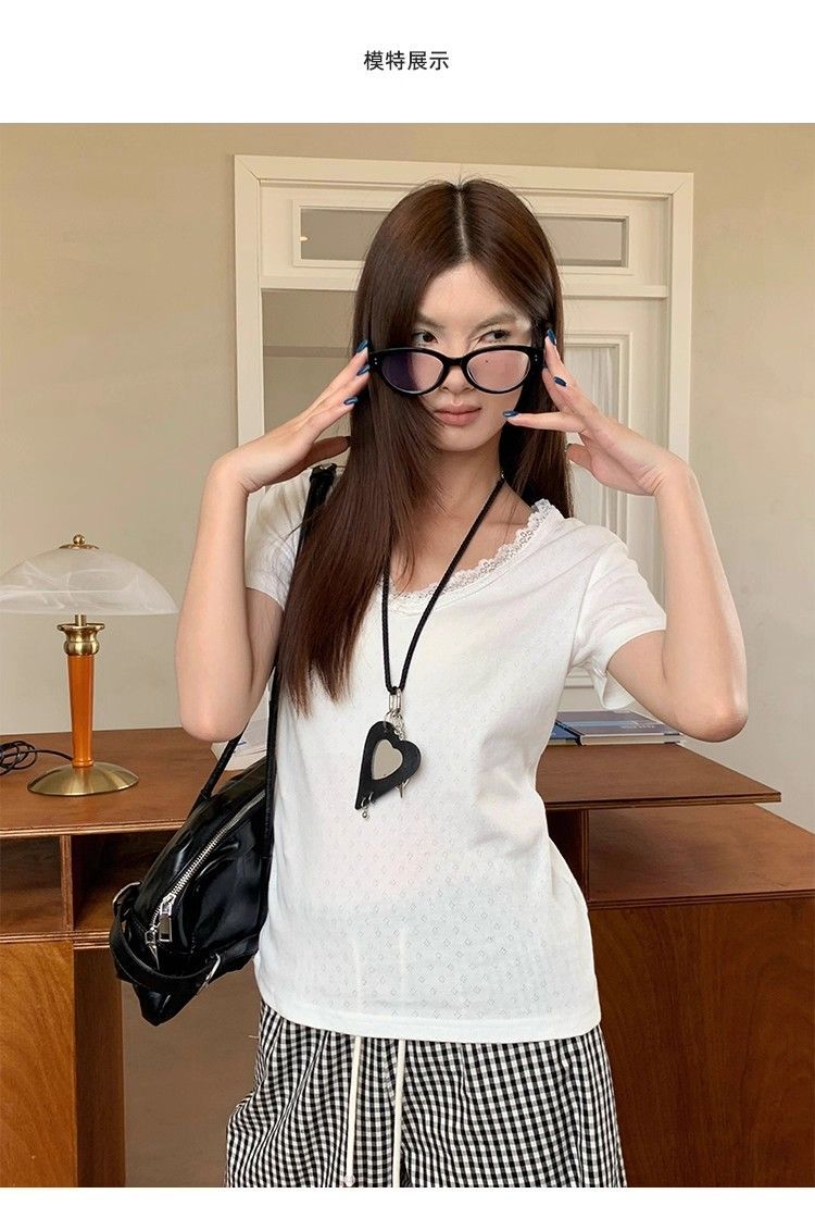 Camiseta Feminina de Renda Branca com Decote V e Manga Curta no Ombro Direito 2025 Verão Nova Cor Pura Estampa Vazada Única