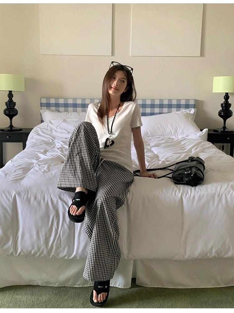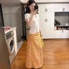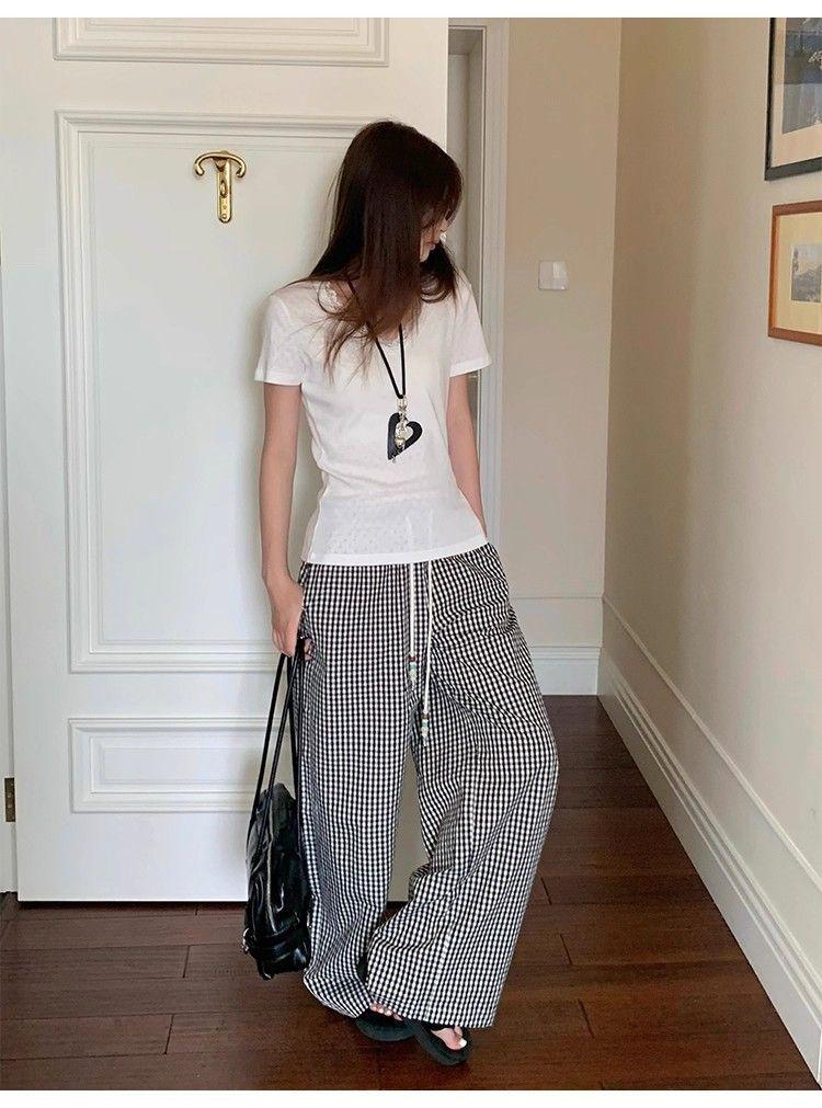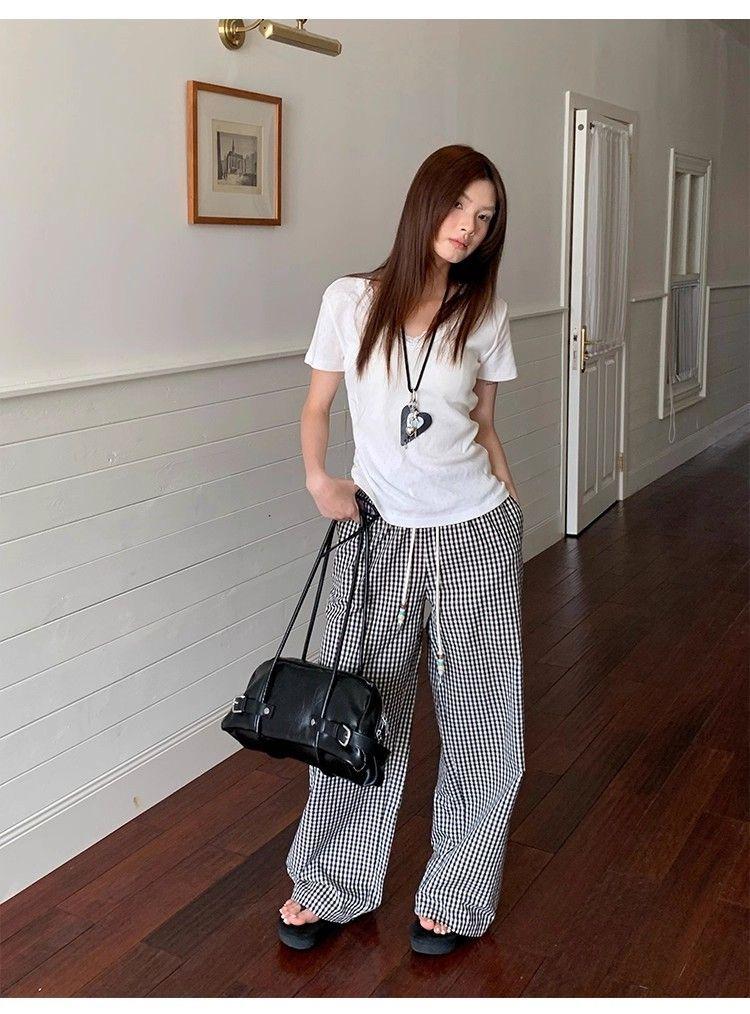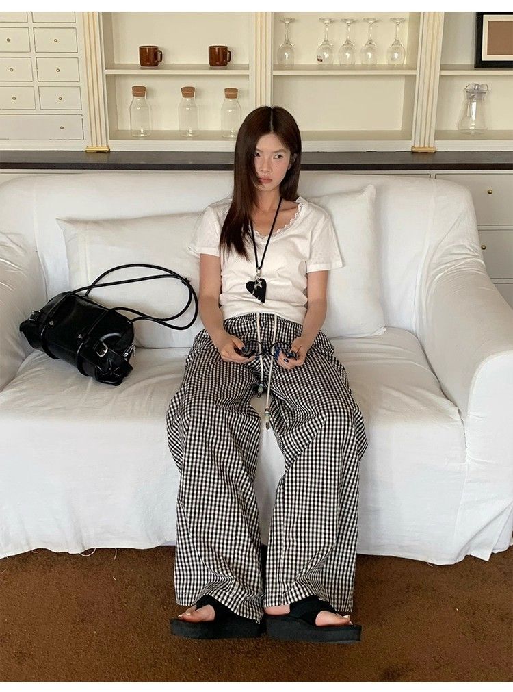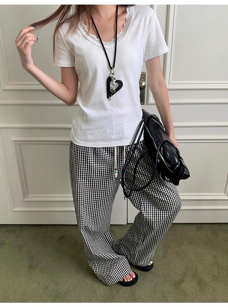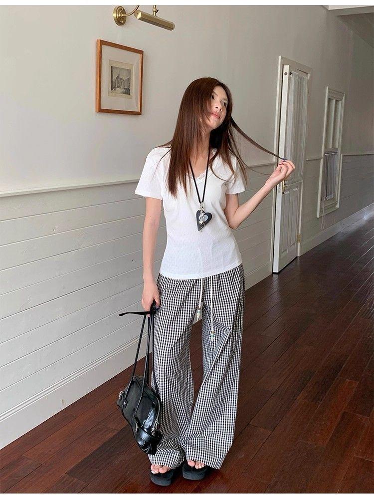 Camiseta Feminina de Renda Branca com Decote V e Manga Curta no Ombro Direito 2025 Verão Nova Cor Pura Estampa Vazada Única