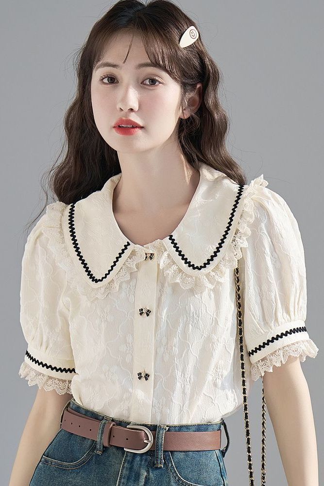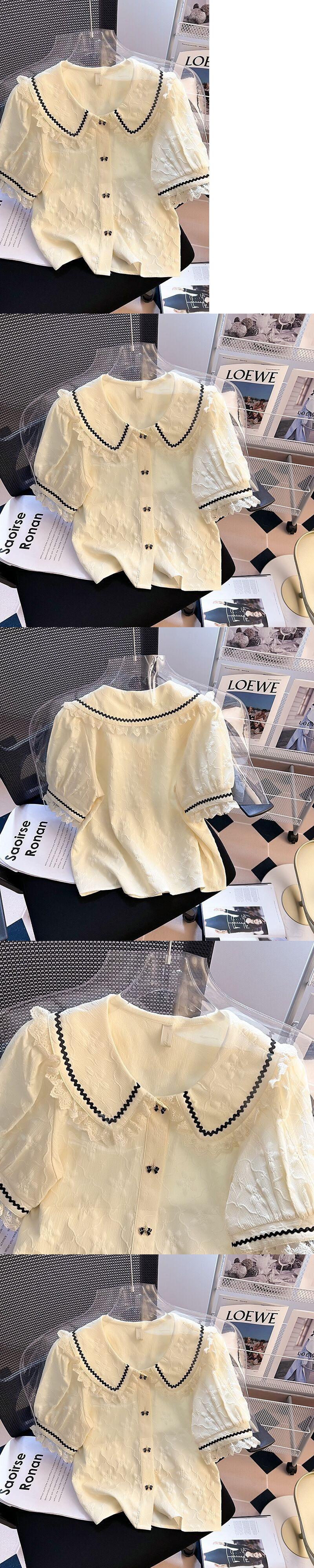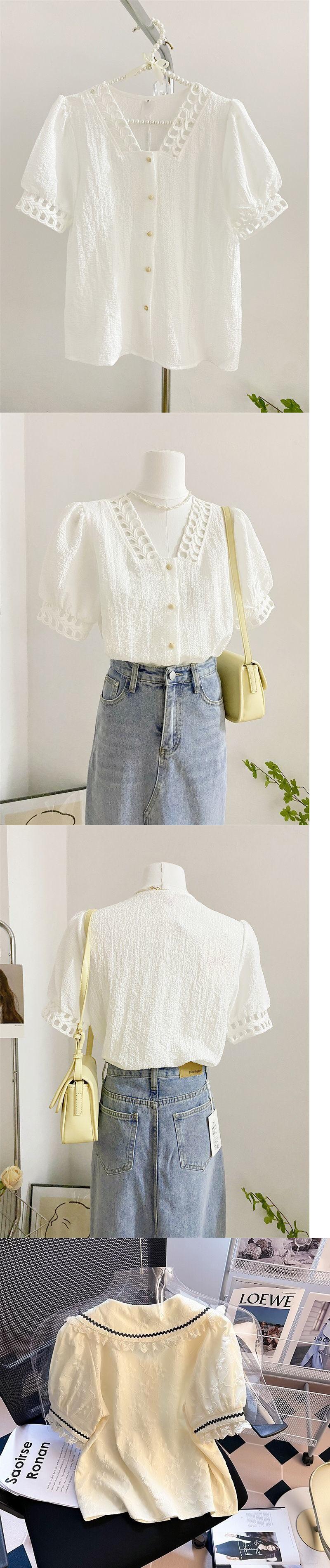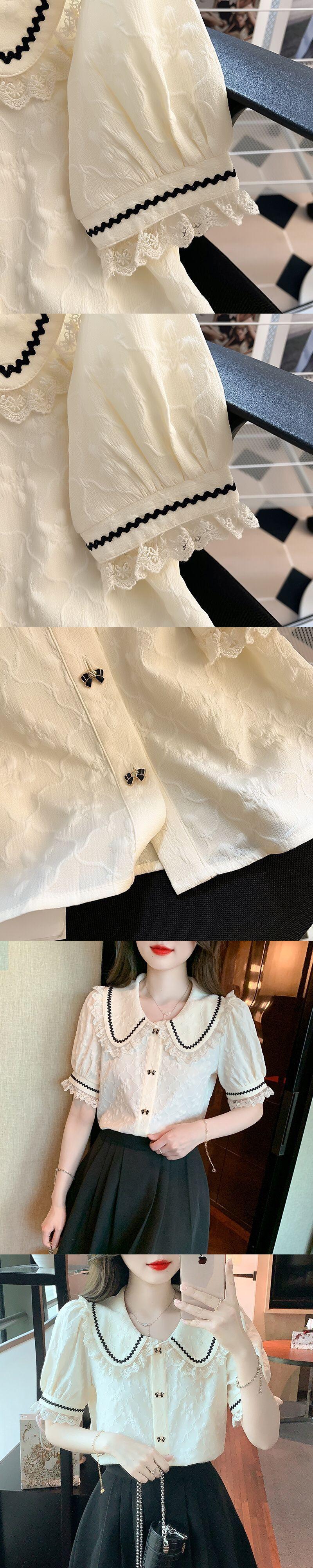 Camisa de Chiffon Feminina Manga Curta Verão Novo Design Nicho Renda Doce e Chic Top Manga Bufante Francês