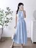 Verão Novo Vestido Azul Design Francês Sem Mangas Alça Espaguete Decote Halter Vestido Longo Vestido Maxi Vestido para Foto de Férias
