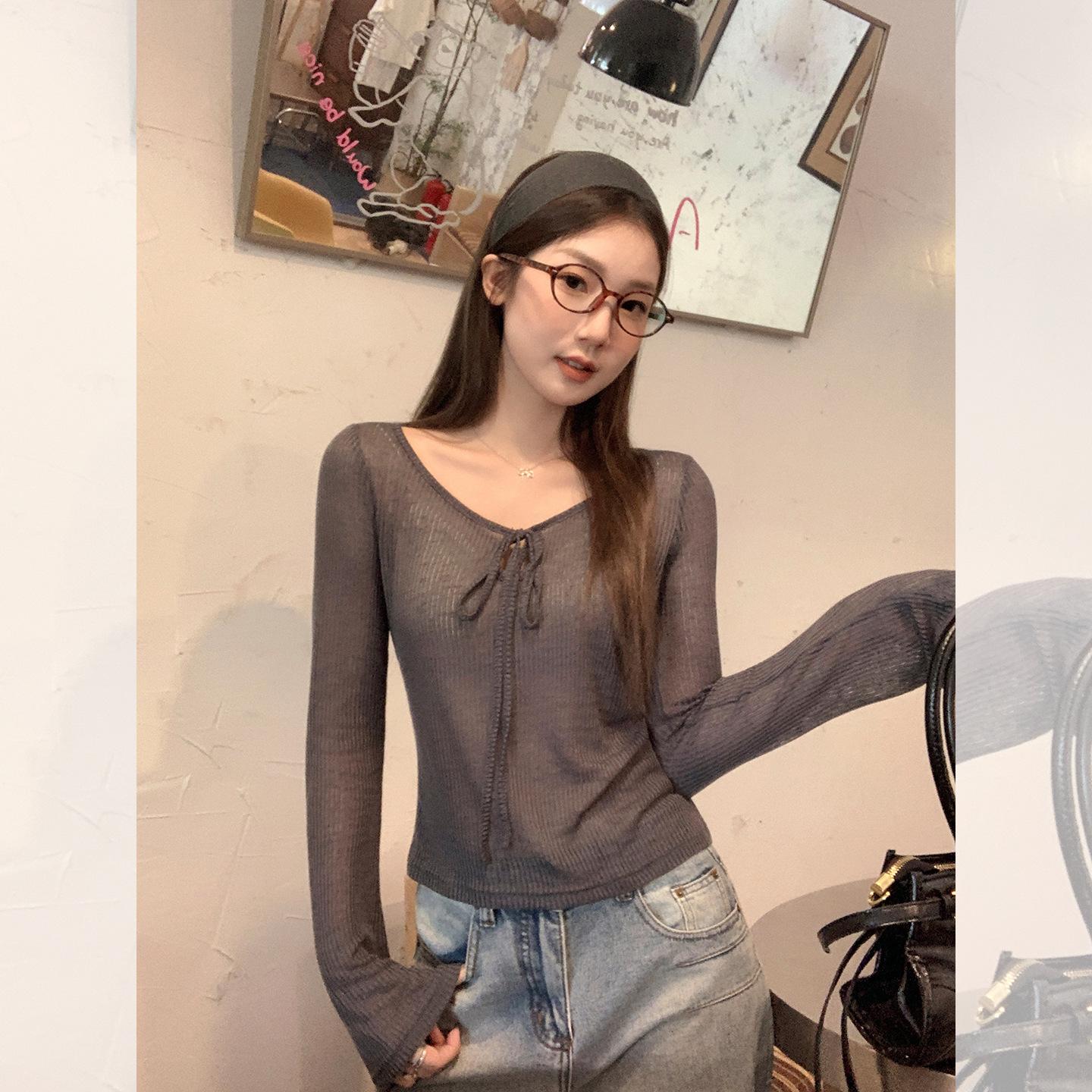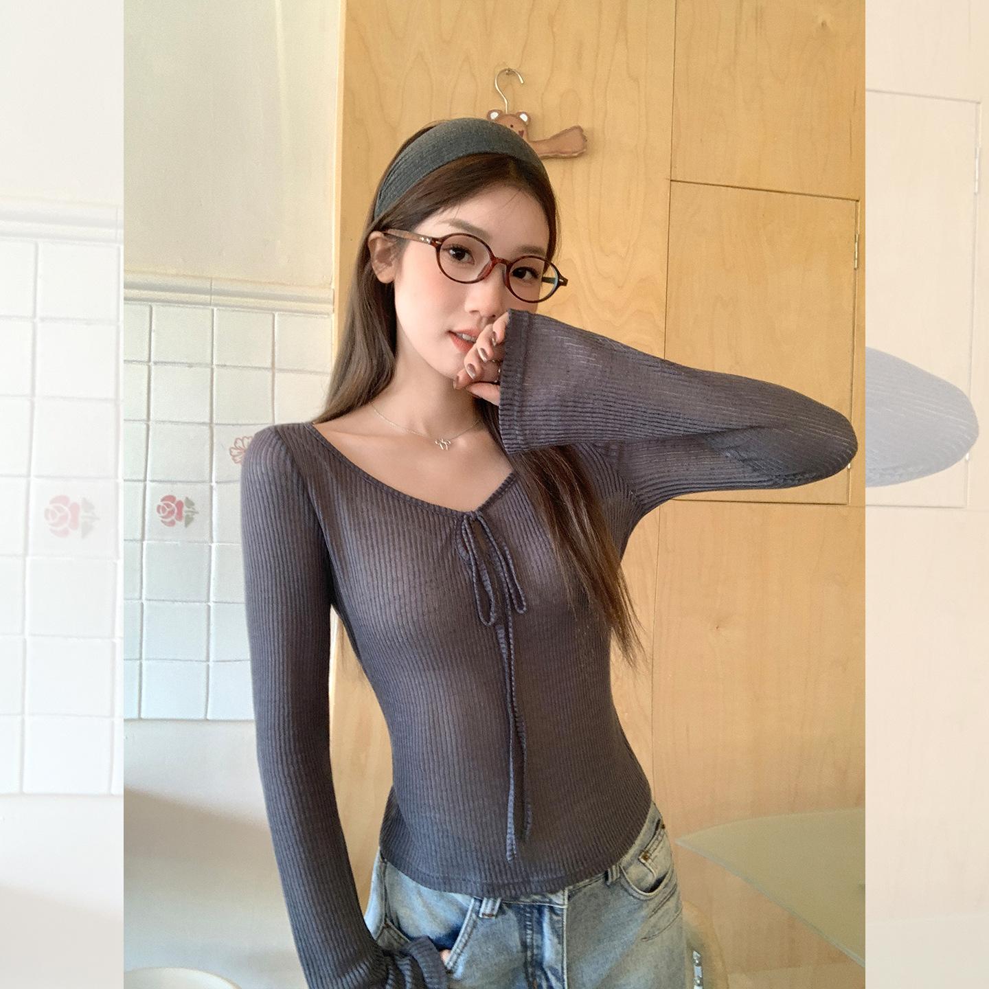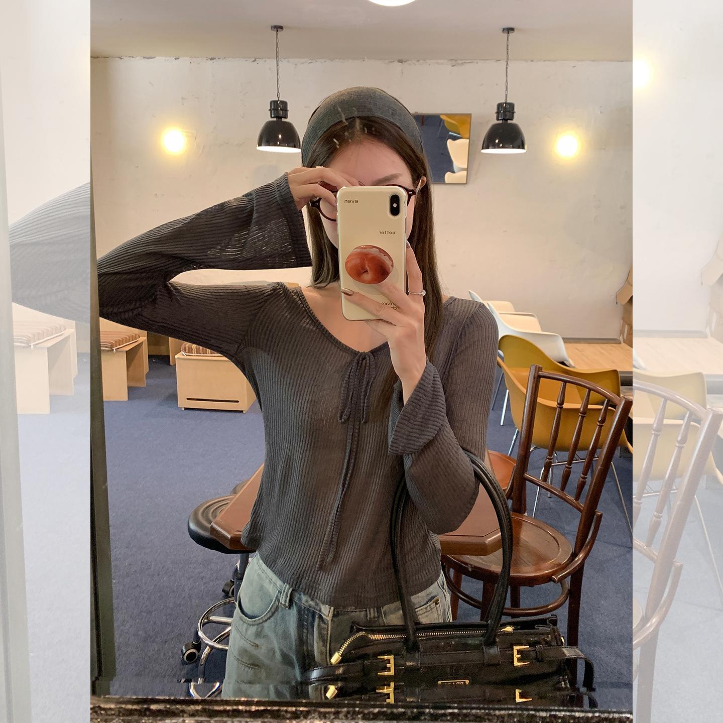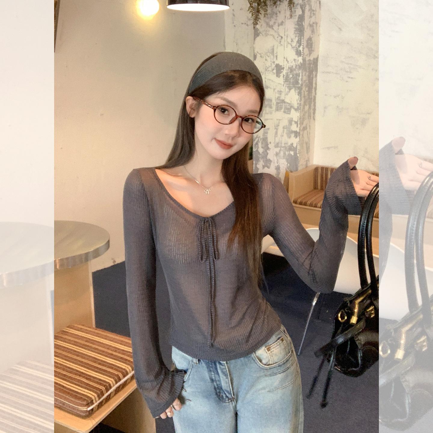 Foto Real Estilo Coreano Decote V Amarração Cardigã Fino Proteção Solar Camiseta Manga Longa Mulher 2025 Outono Emagrecimento Ligeiramente Transparente Blusa Pequena