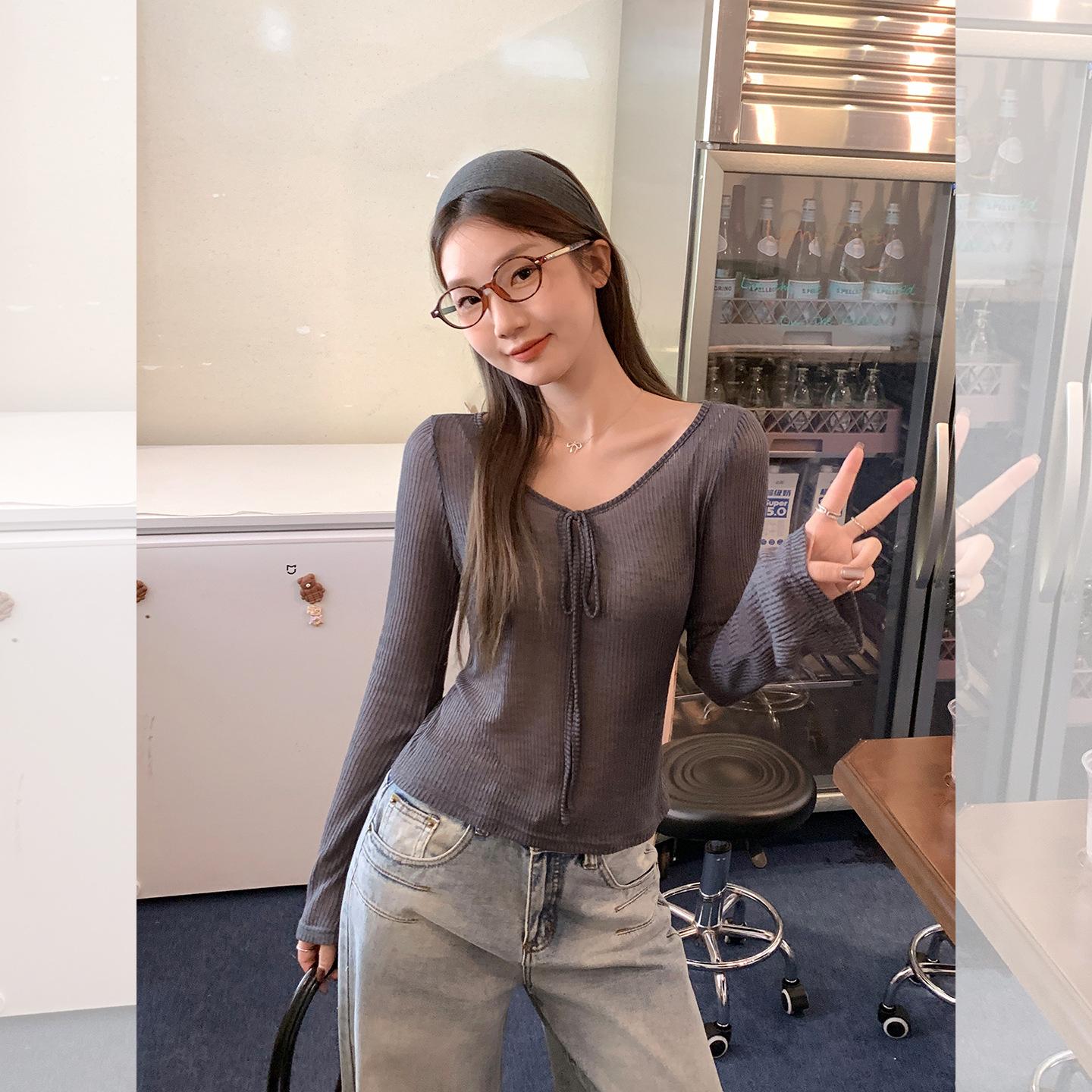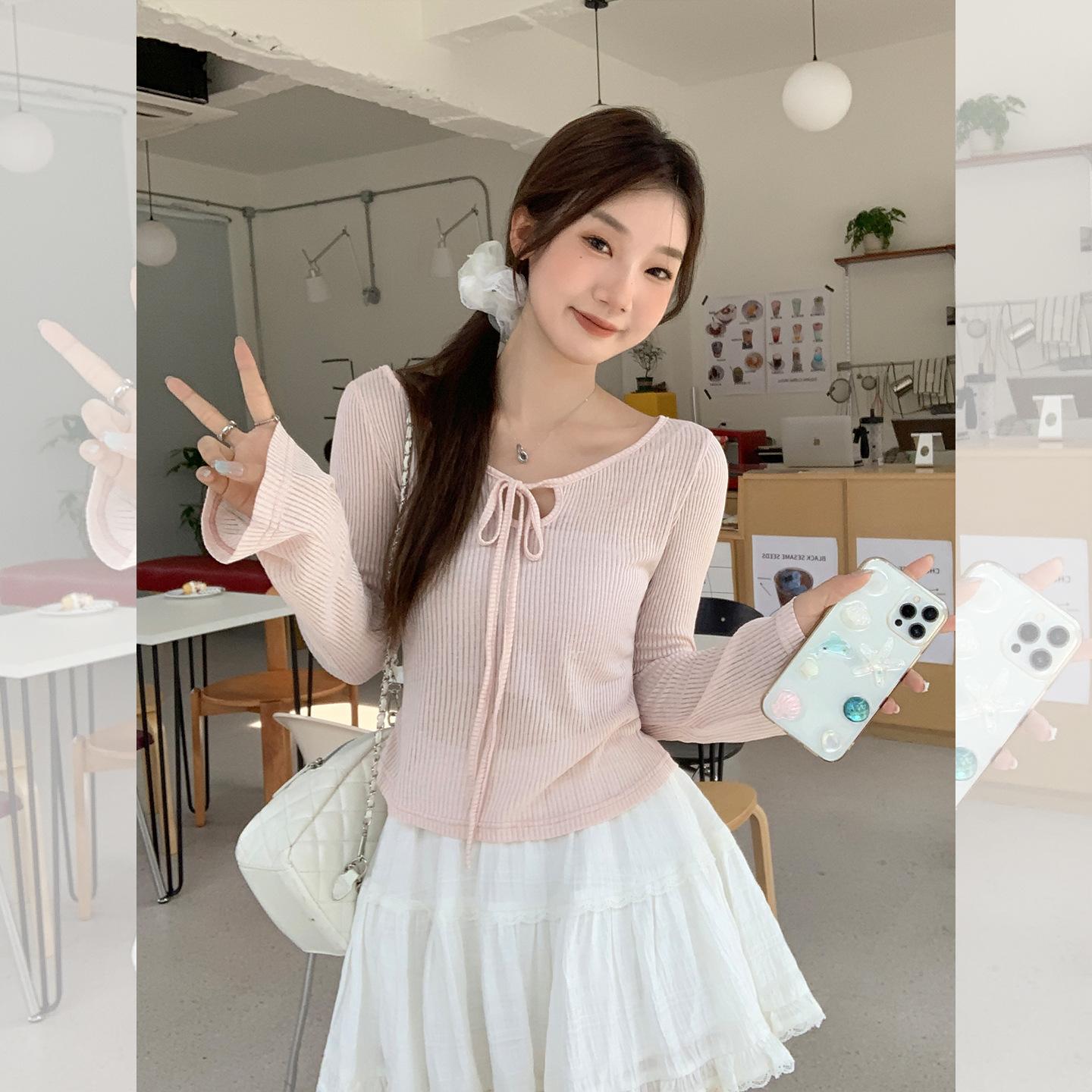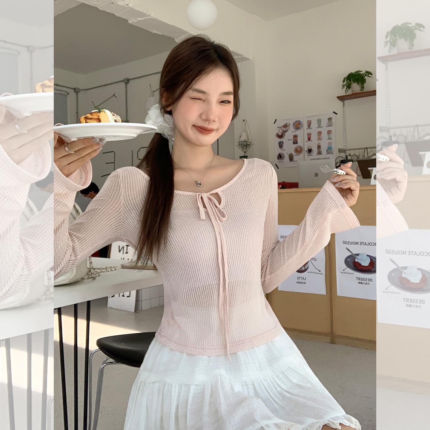 Foto Real Estilo Coreano Decote V Amarração Cardigã Fino Proteção Solar Camiseta Manga Longa Mulher 2025 Outono Emagrecimento Ligeiramente Transparente Blusa Pequena