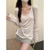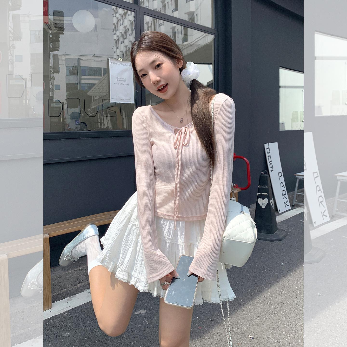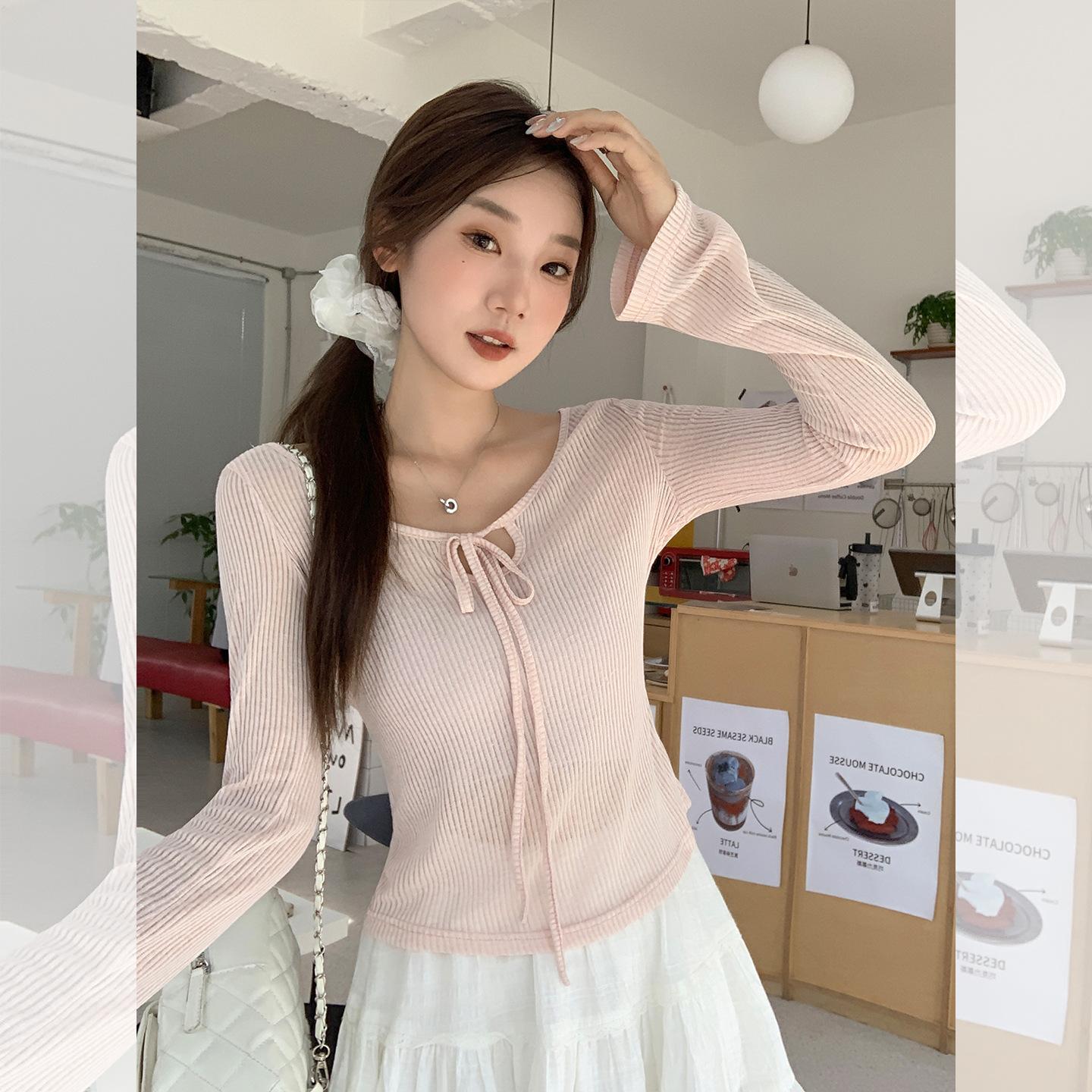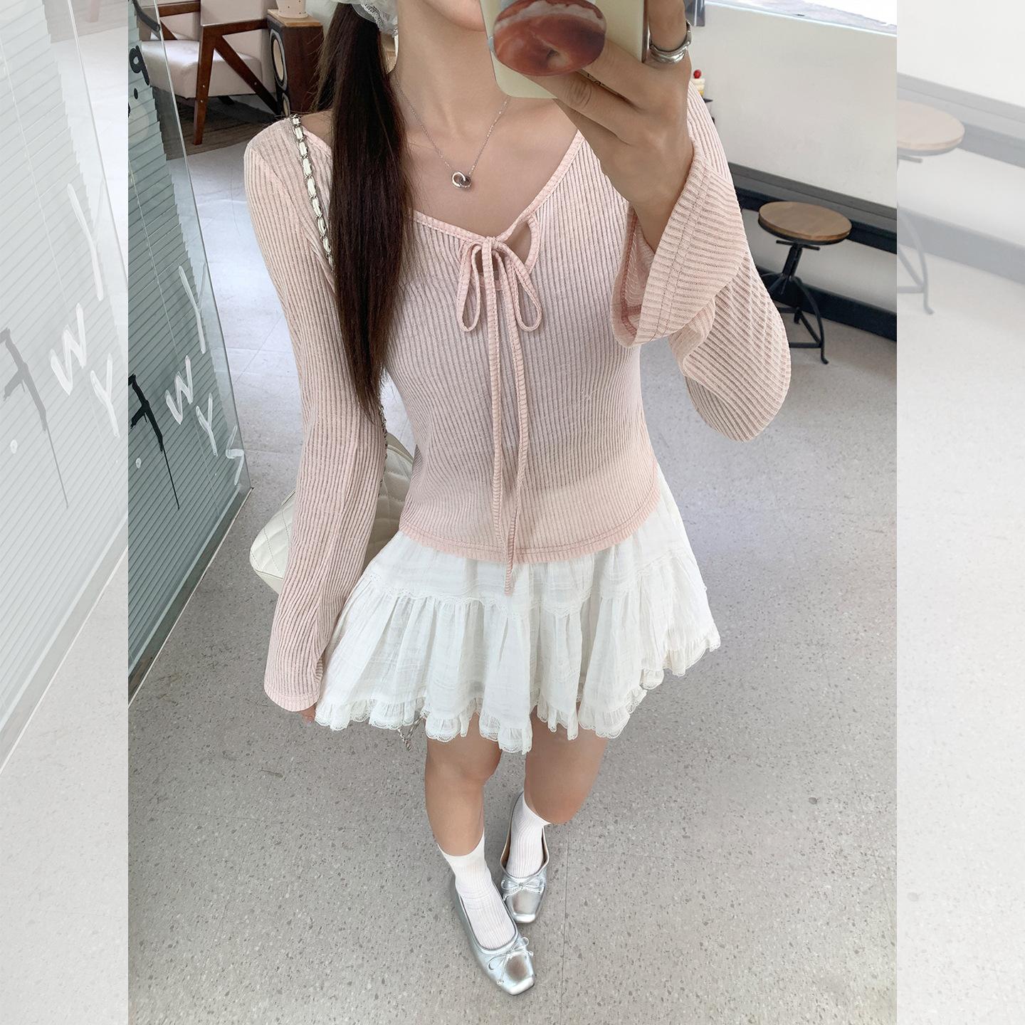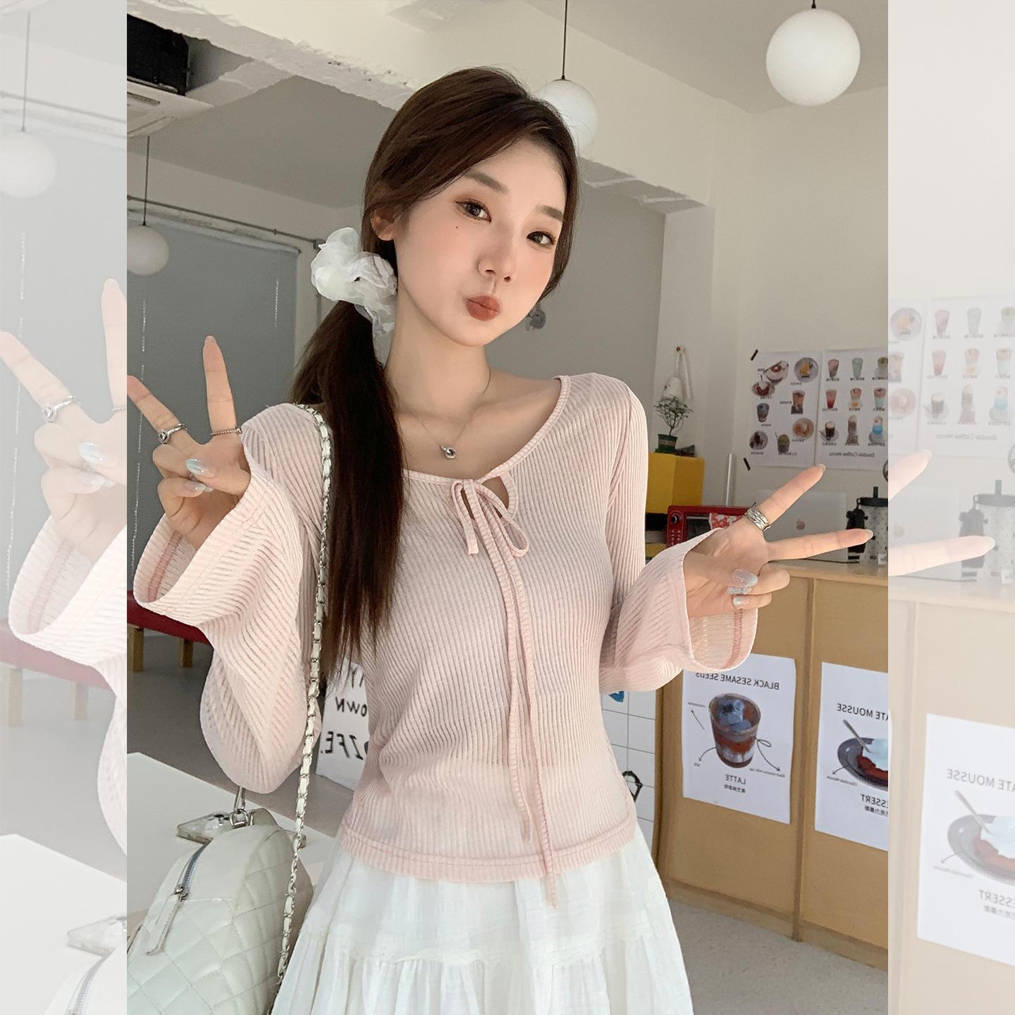Foto Real Estilo Coreano Decote V Amarração Cardigã Fino Proteção Solar Camiseta Manga Longa Mulher 2025 Outono Emagrecimento Ligeiramente Transparente Blusa Pequena