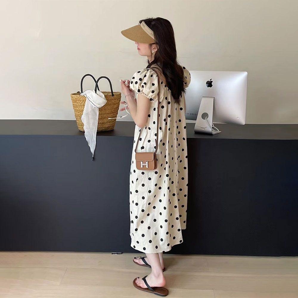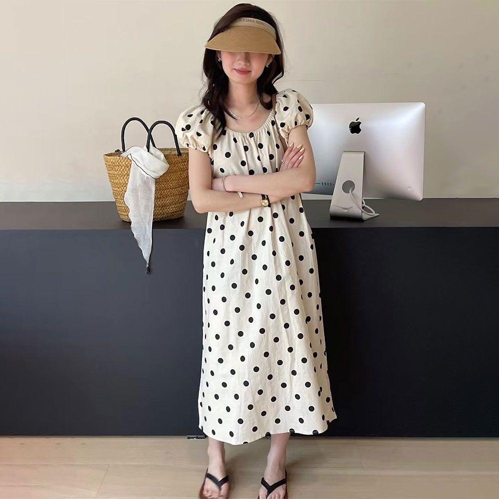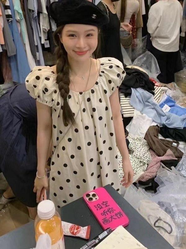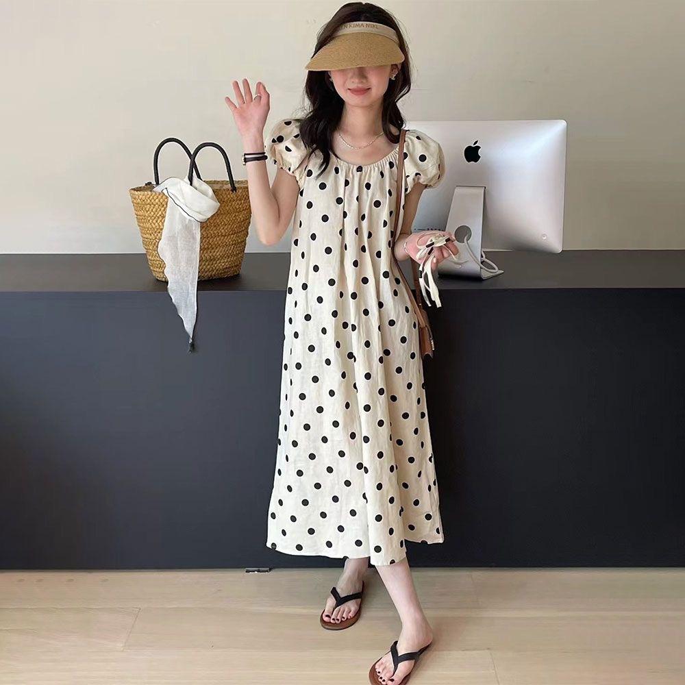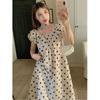 Doce Vestido de Bolinhas com Manga Bufante Redutor de Idade para Mulheres 2025 Verão Novo Estilo Estilo Francês Emagrecimento Doce Saia Midi