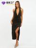 Vestido Longo Sexy Europeu e Americano de Verão Sem Costas Decote V Profundo Alça no Pescoço, Vestido Elegante Minimalista Personalizado com Fenda Lateral