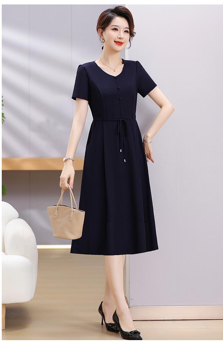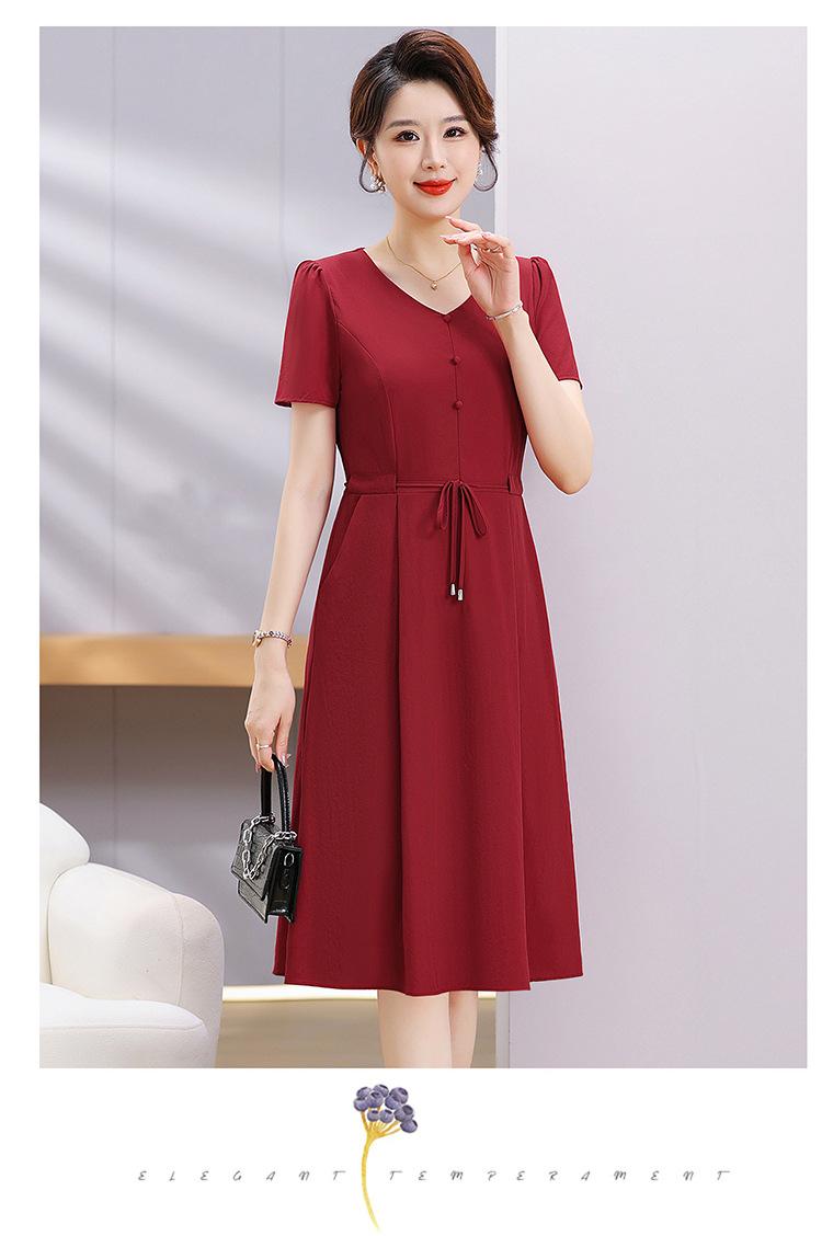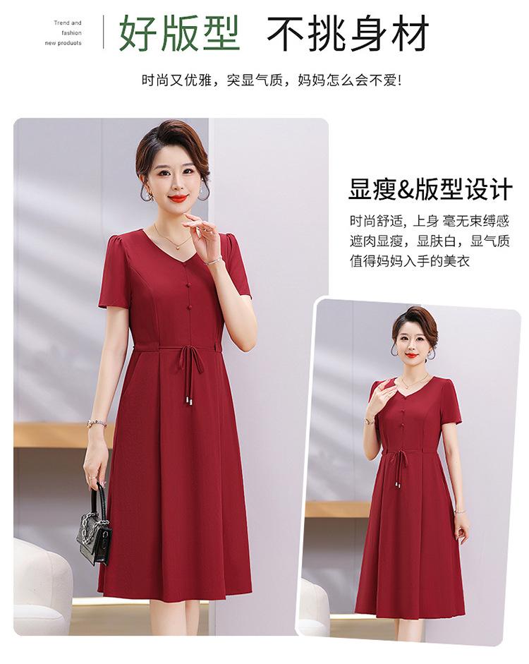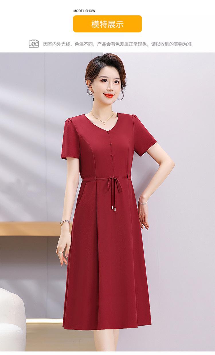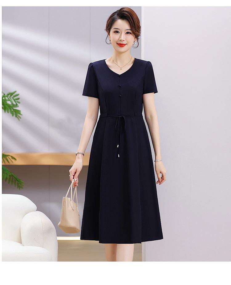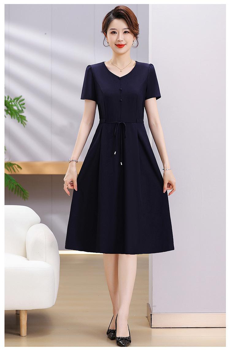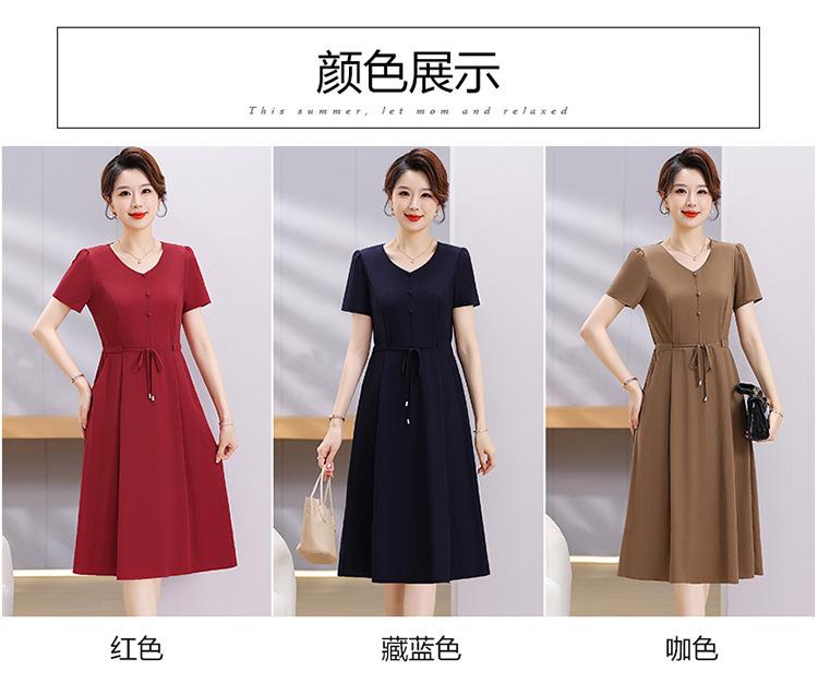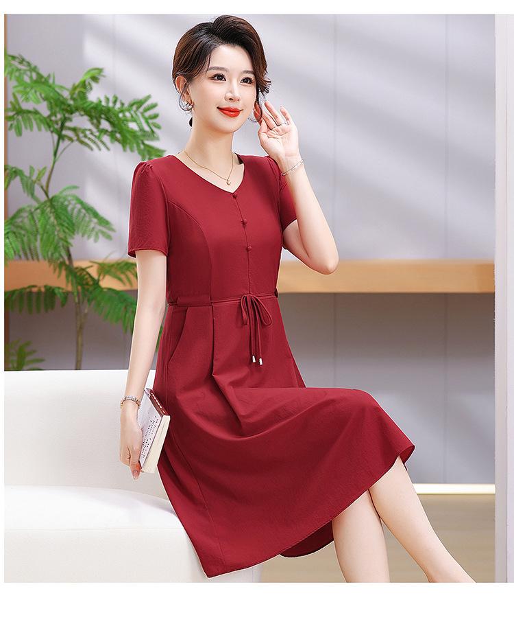 Vestido de Verão da Mamãe com Cintura e Vestido Elegante Cor Pura Look Emagrecedor Mulheres de Meia-Idade e Idosas Renda com Cordões Decote V Manga Curta Saia Midi