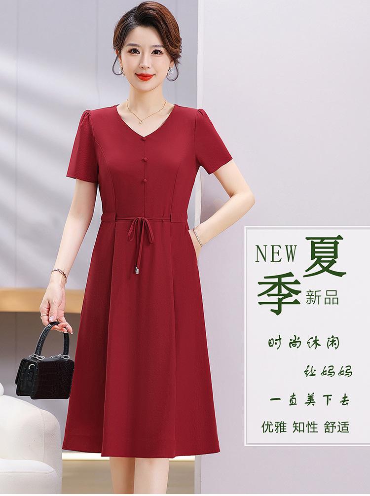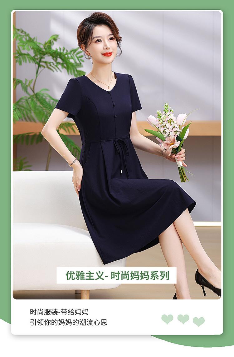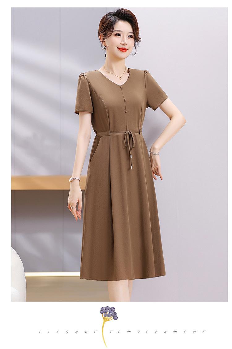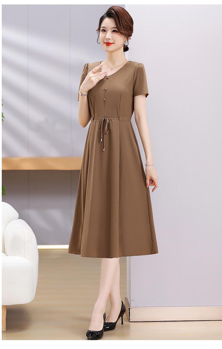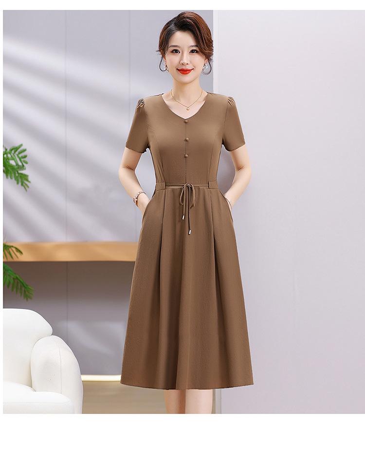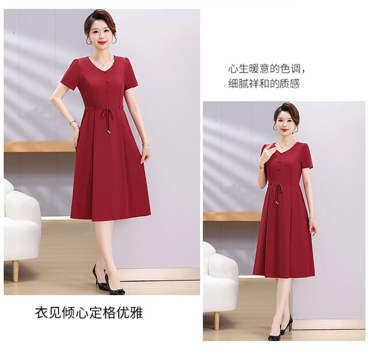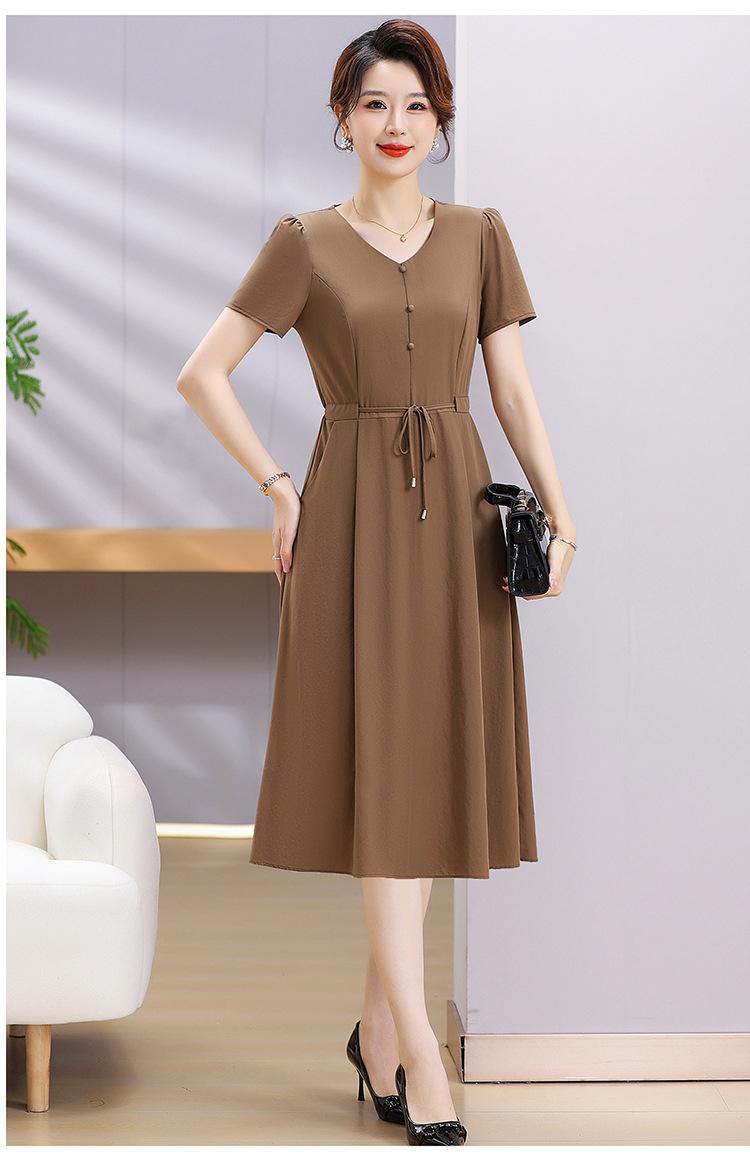 Vestido de Verão da Mamãe com Cintura e Vestido Elegante Cor Pura Look Emagrecedor Mulheres de Meia-Idade e Idosas Renda com Cordões Decote V Manga Curta Saia Midi