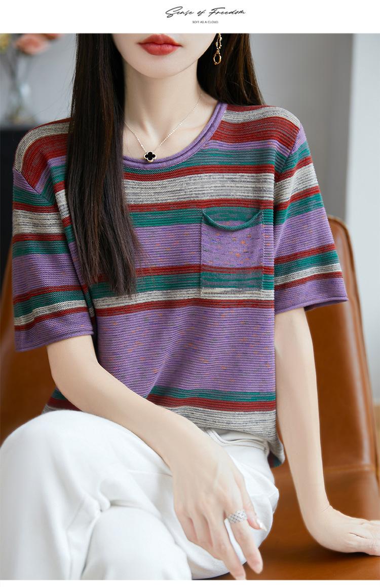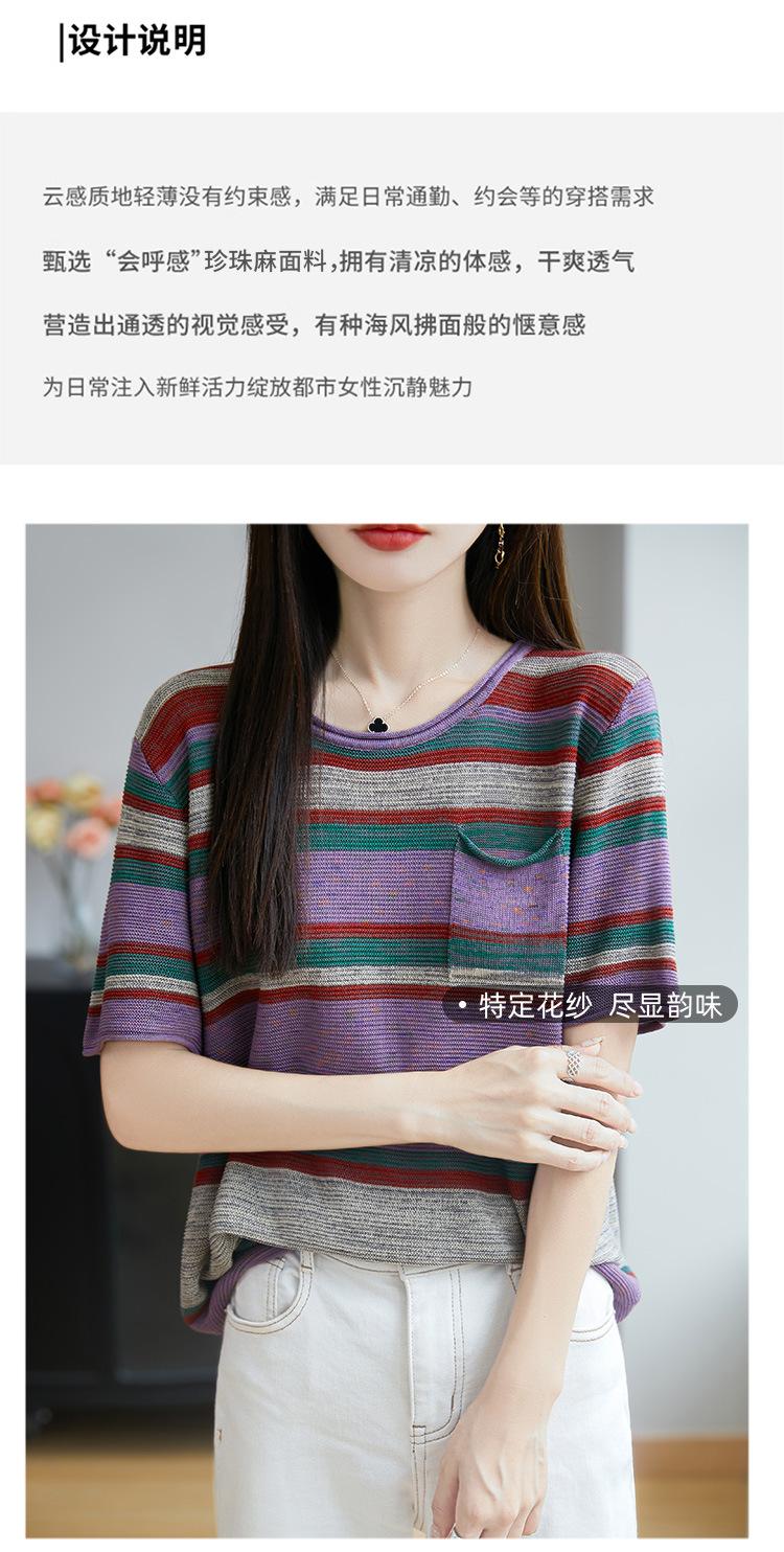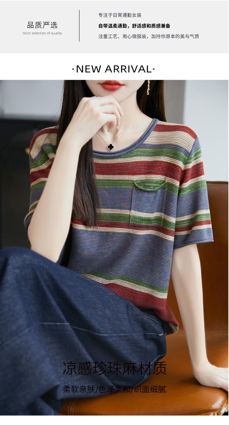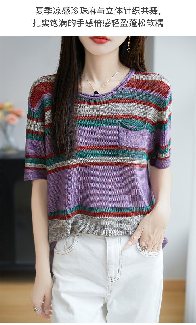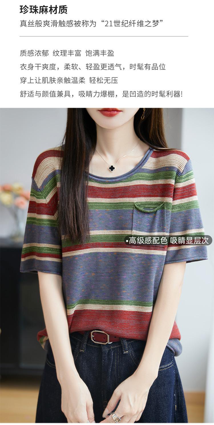 Verão 2025 Nova Camiseta de Tricô de Linho com Fio Floral e Pérola de Gola Redonda e Manga Curta com Cor Contrastante e Bolso Pulôver Camiseta Básica