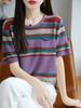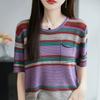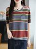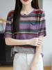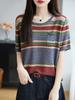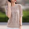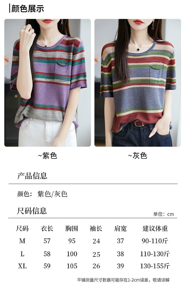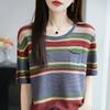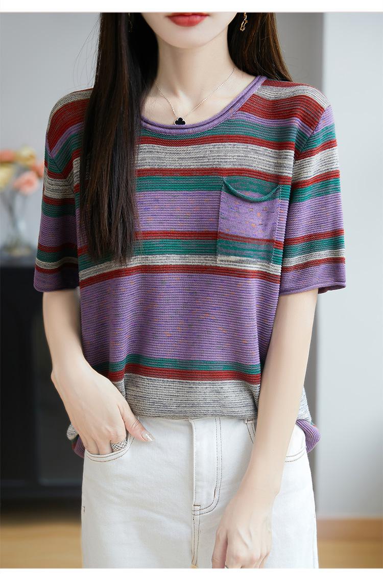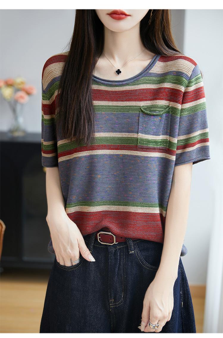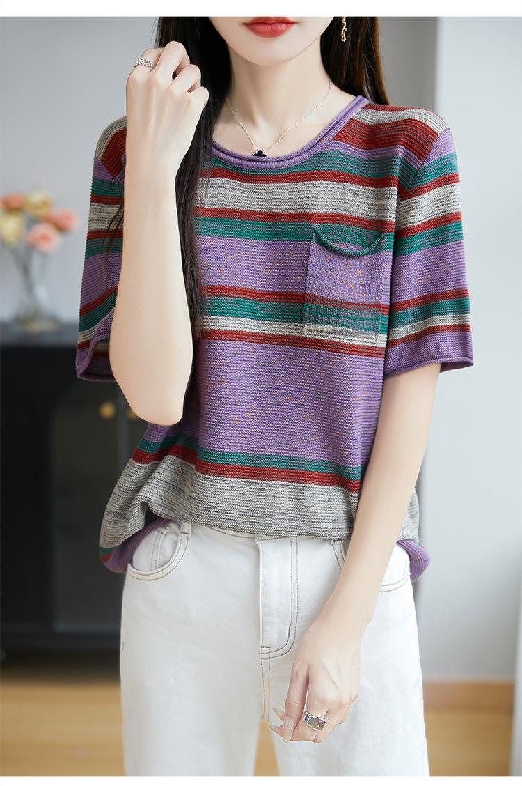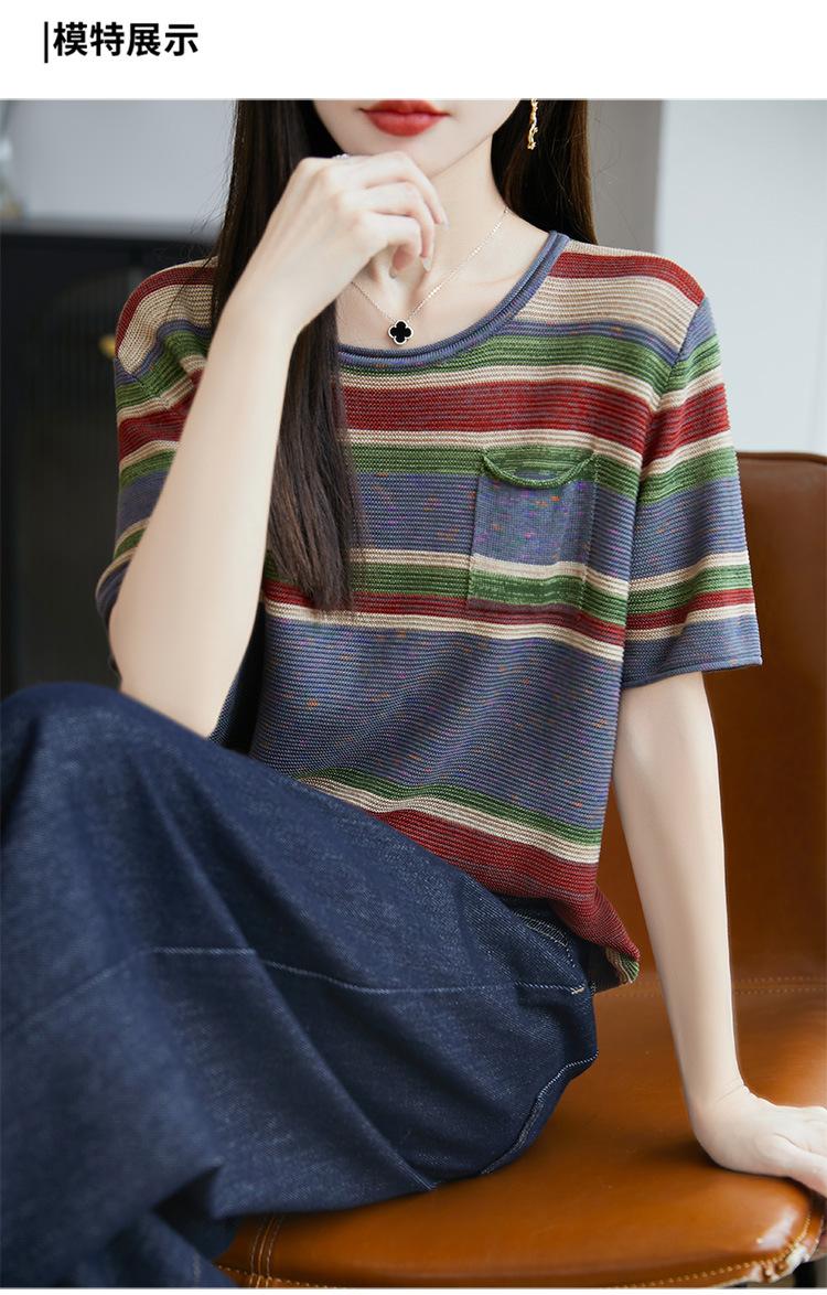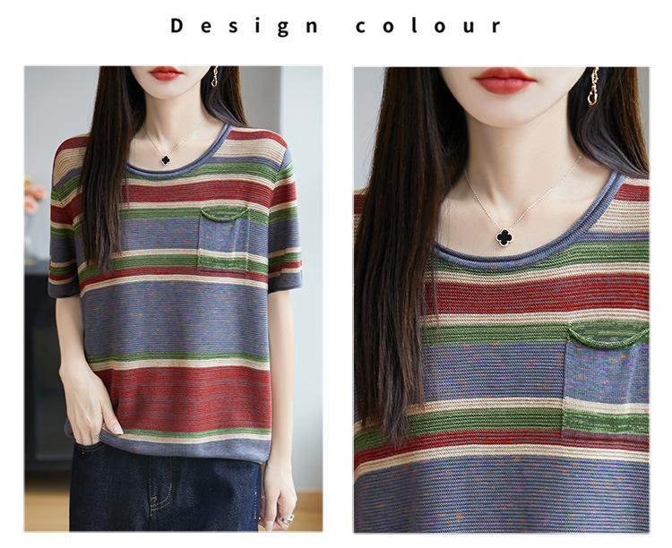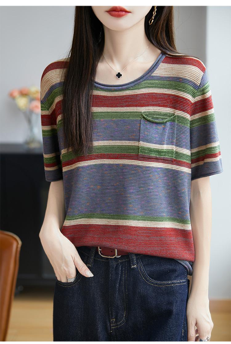 Verão 2025 Nova Camiseta de Tricô de Linho com Fio Floral e Pérola de Gola Redonda e Manga Curta com Cor Contrastante e Bolso Pulôver Camiseta Básica